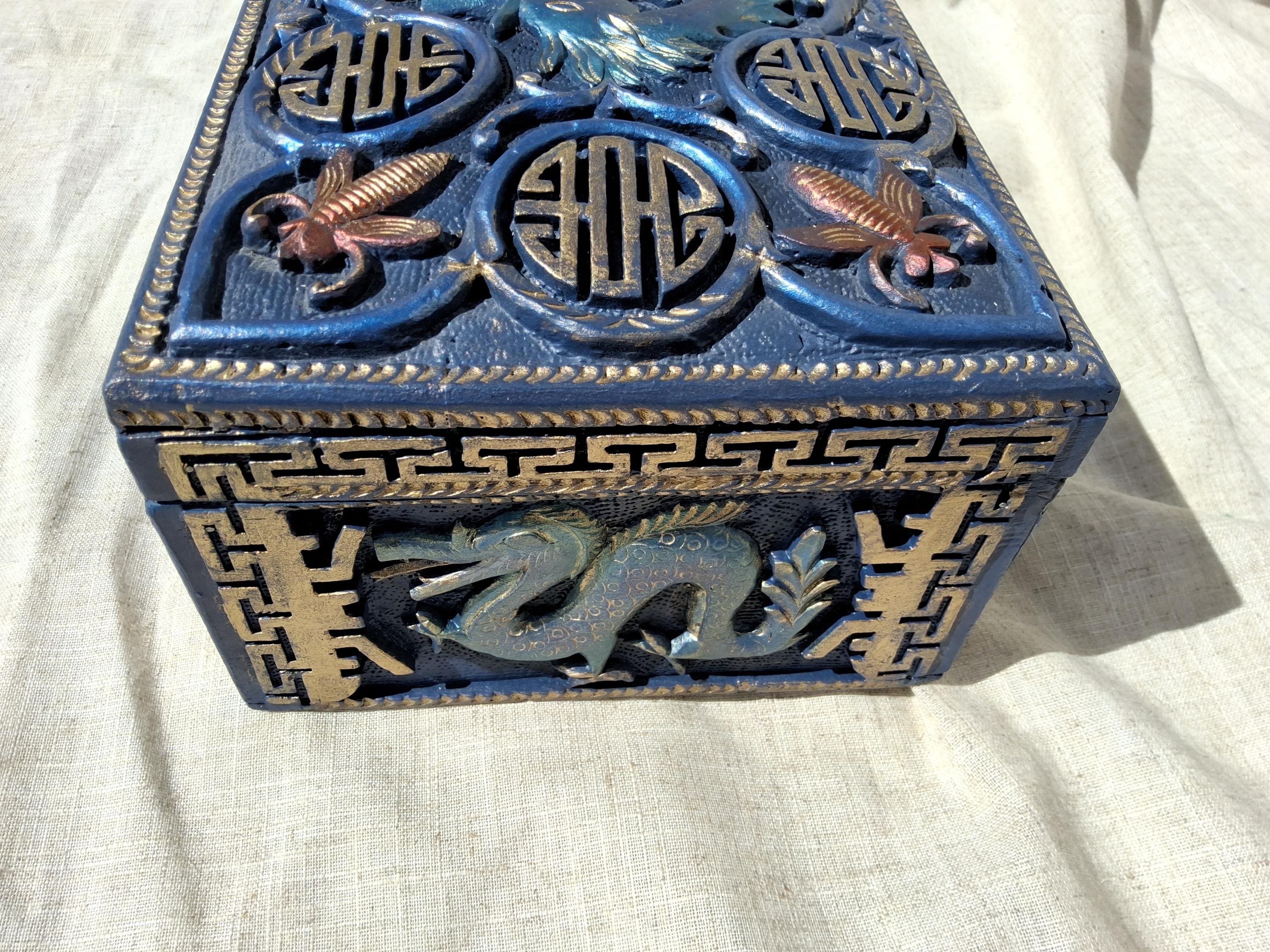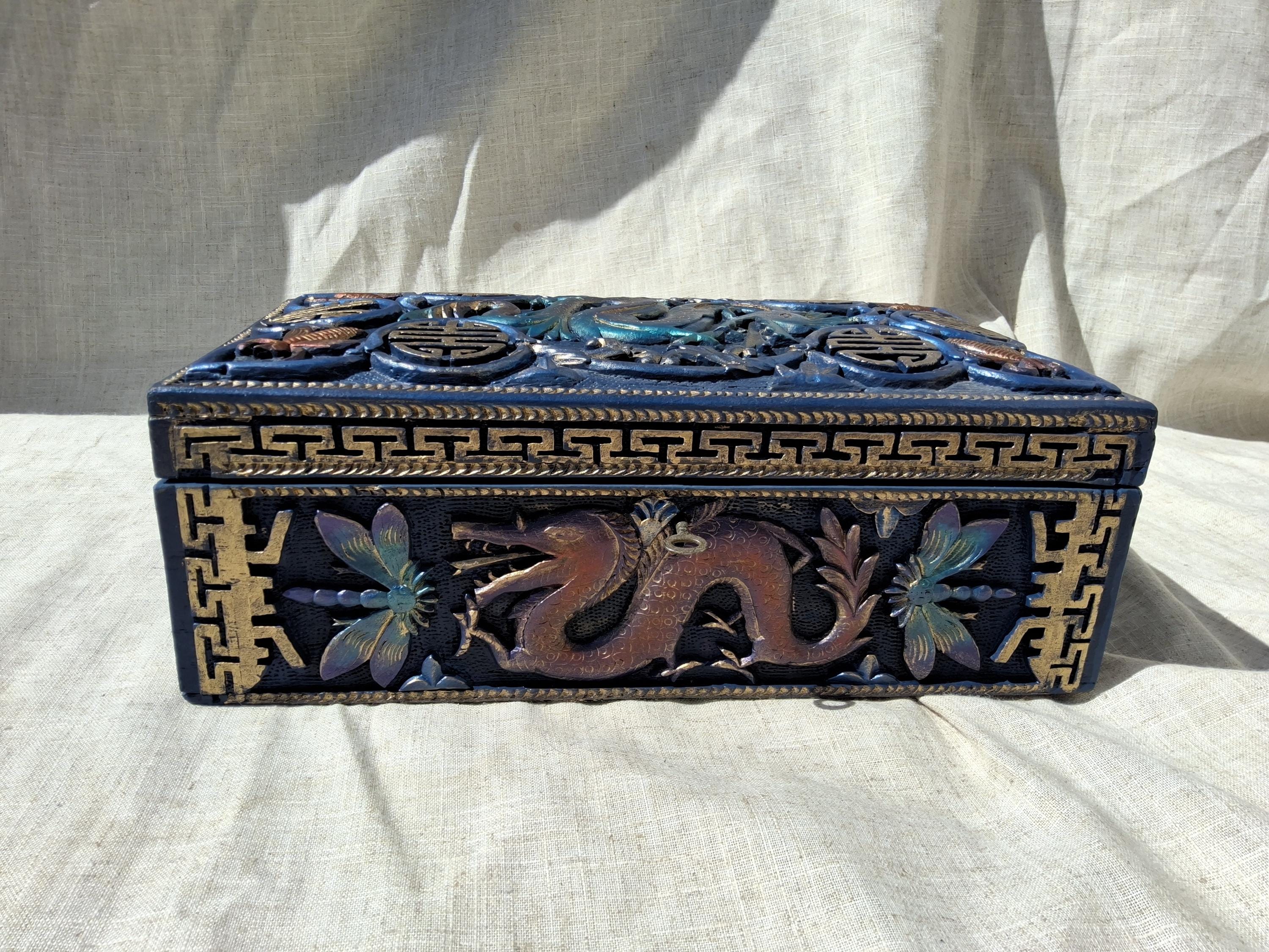 This a gorgeous hand carved box, with high reliefs of a an oriental persons and dragon like animals-carvings are highlighted with gold and other metallic colours to enhance the carvings. some or all of the many colours do not show up in certain angles, like magic some areas may look a different colours depending on the angle it is viewed from.