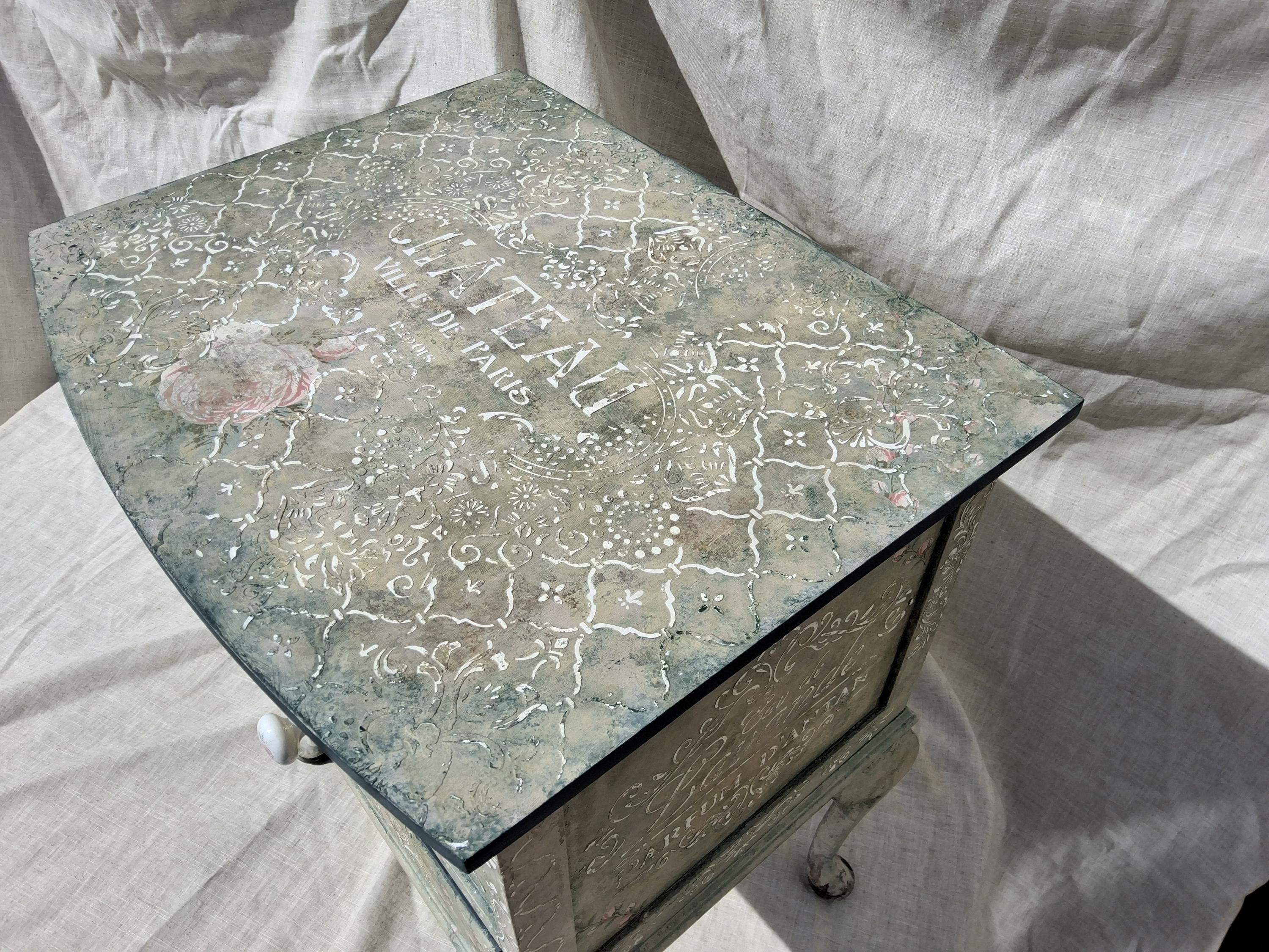 Designed in a French shabby chic style with rose motifs, the majority of the decorations feature textured and raised details.