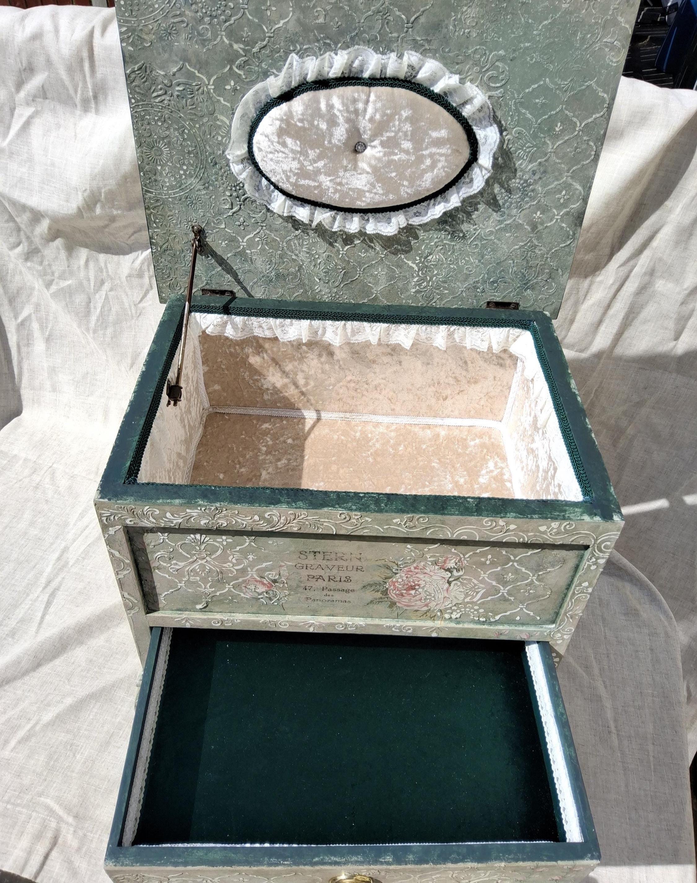 The piece includes a lift-up lid with styled pin cushion and a drawer below, both relined with luxurious crushed velvet.,with vintage lace satin lace trim