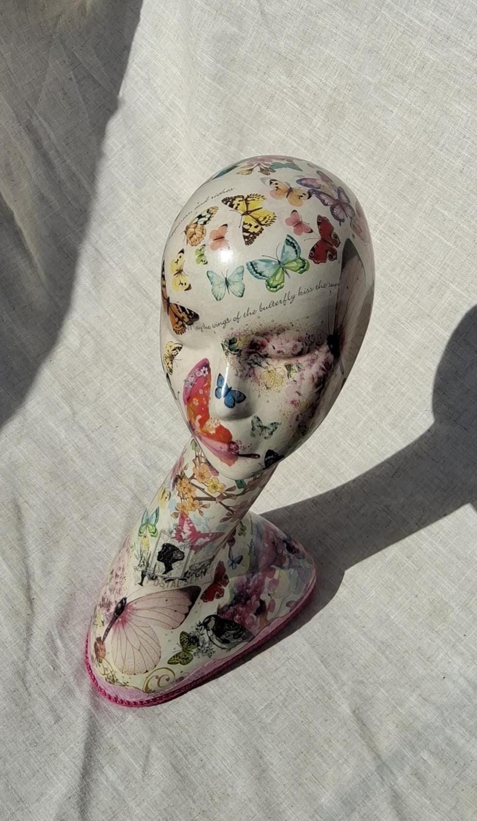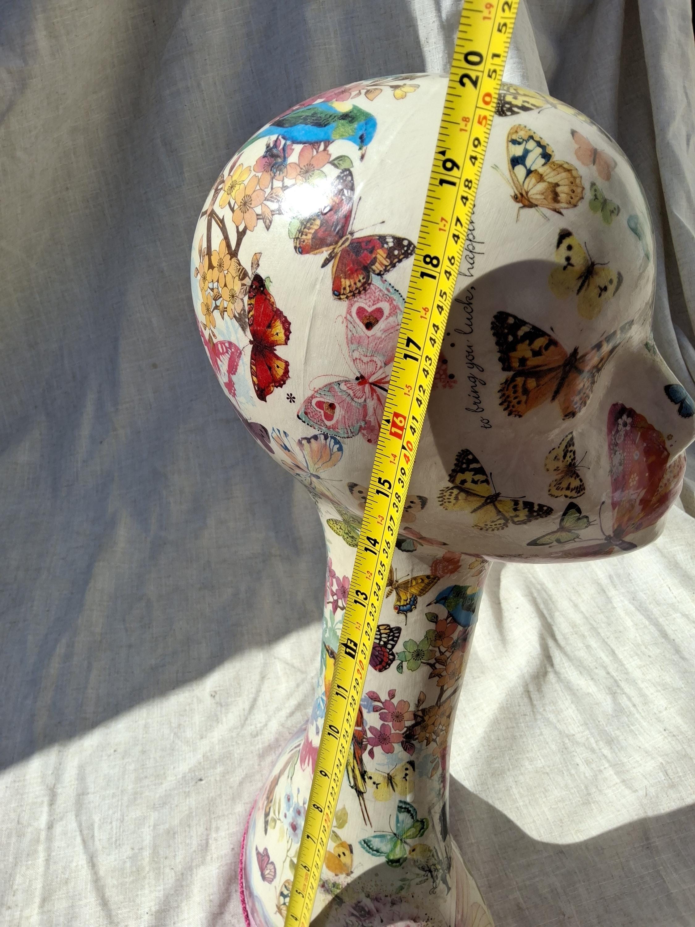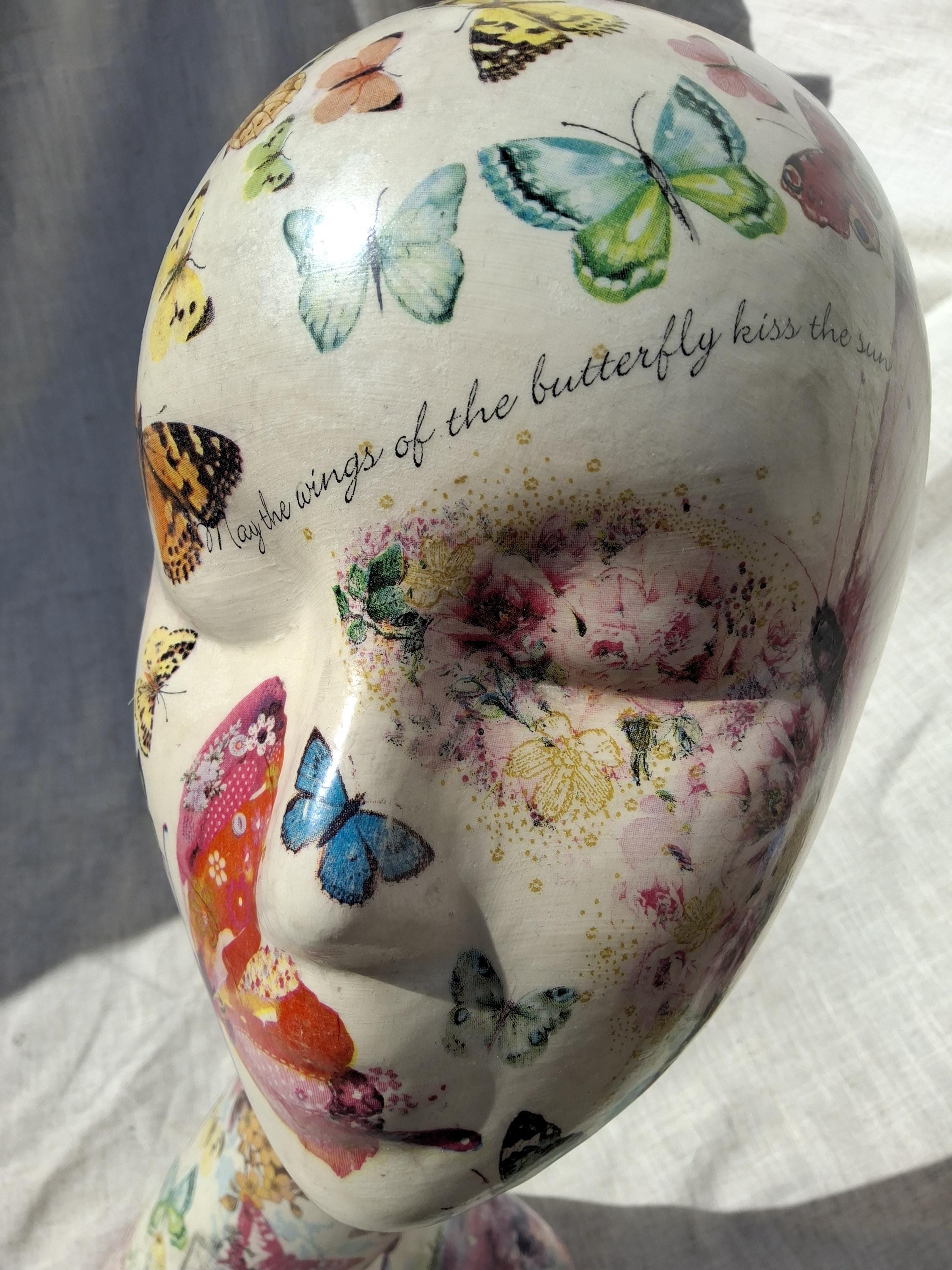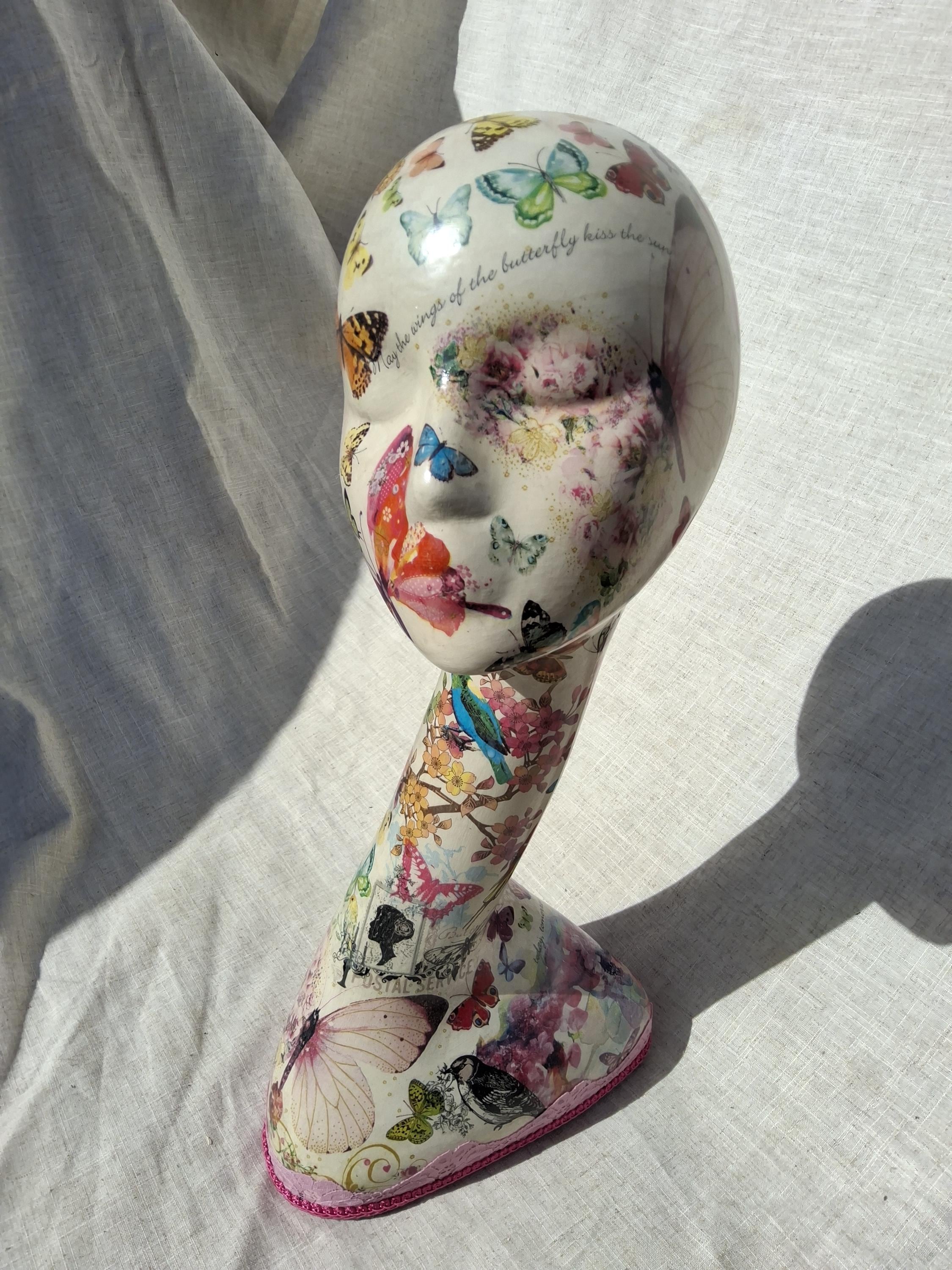 A female hollow hard plastic Swan neck mannequin head decoupaged with butterflies birds flowers etc theme.