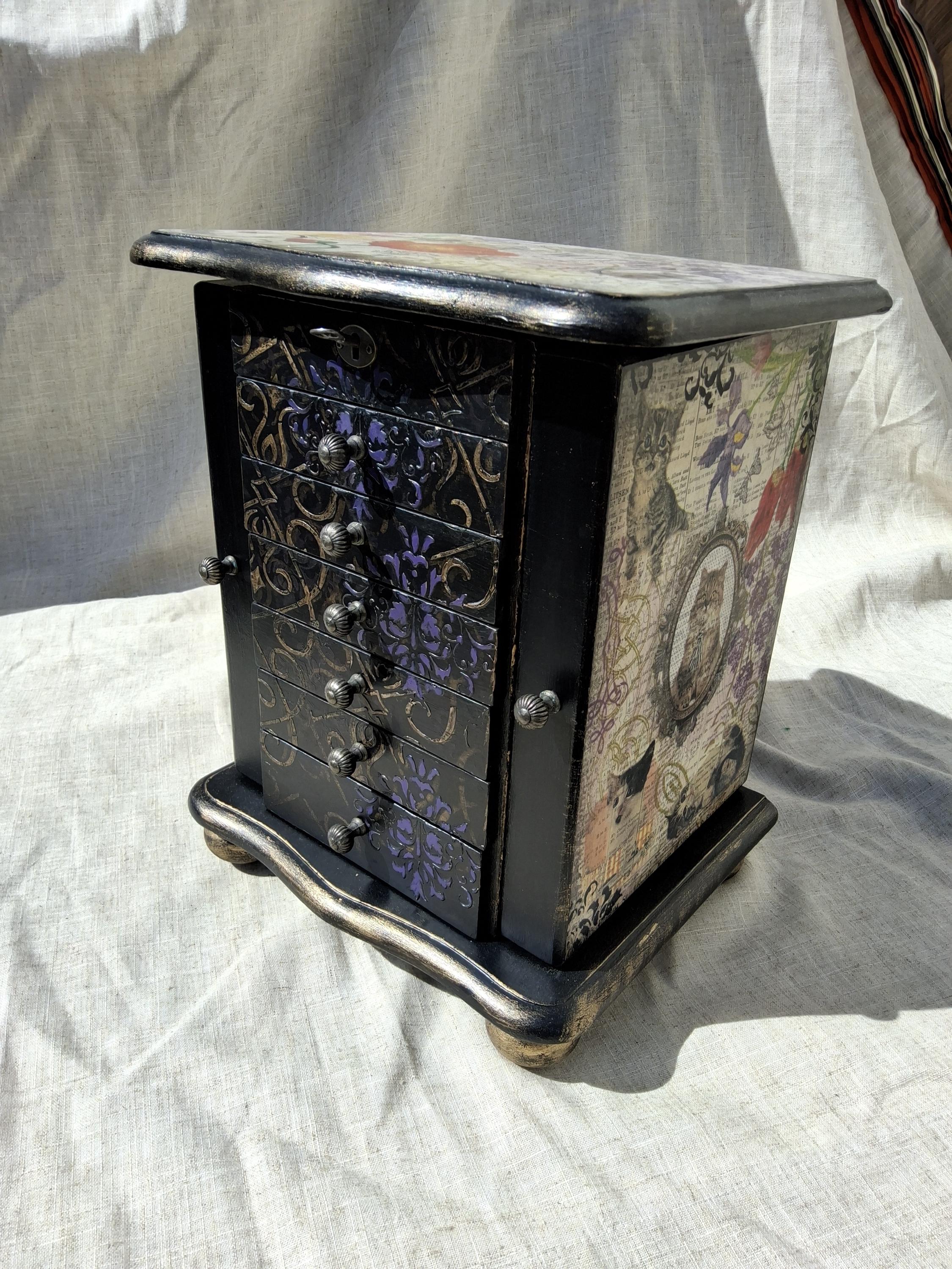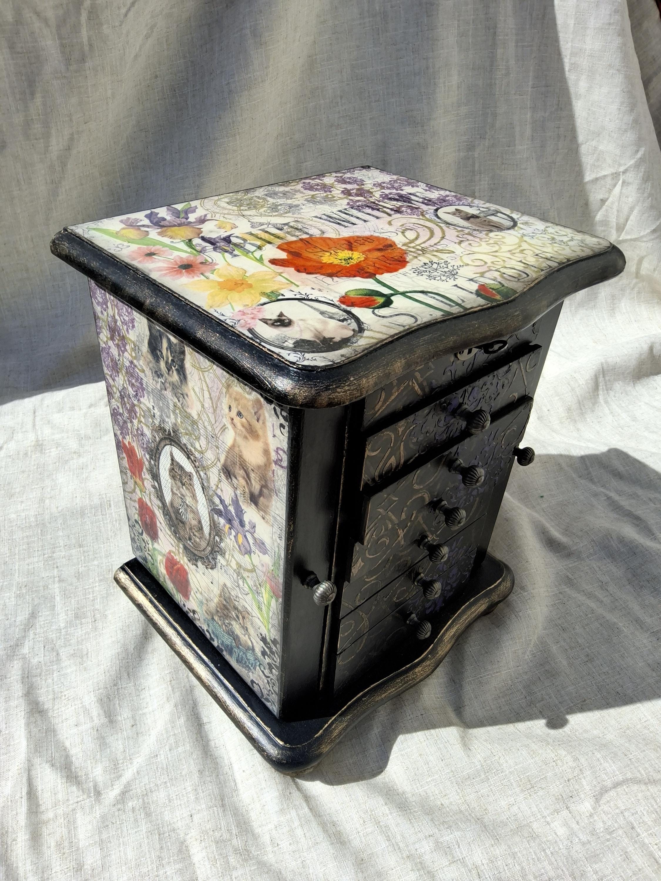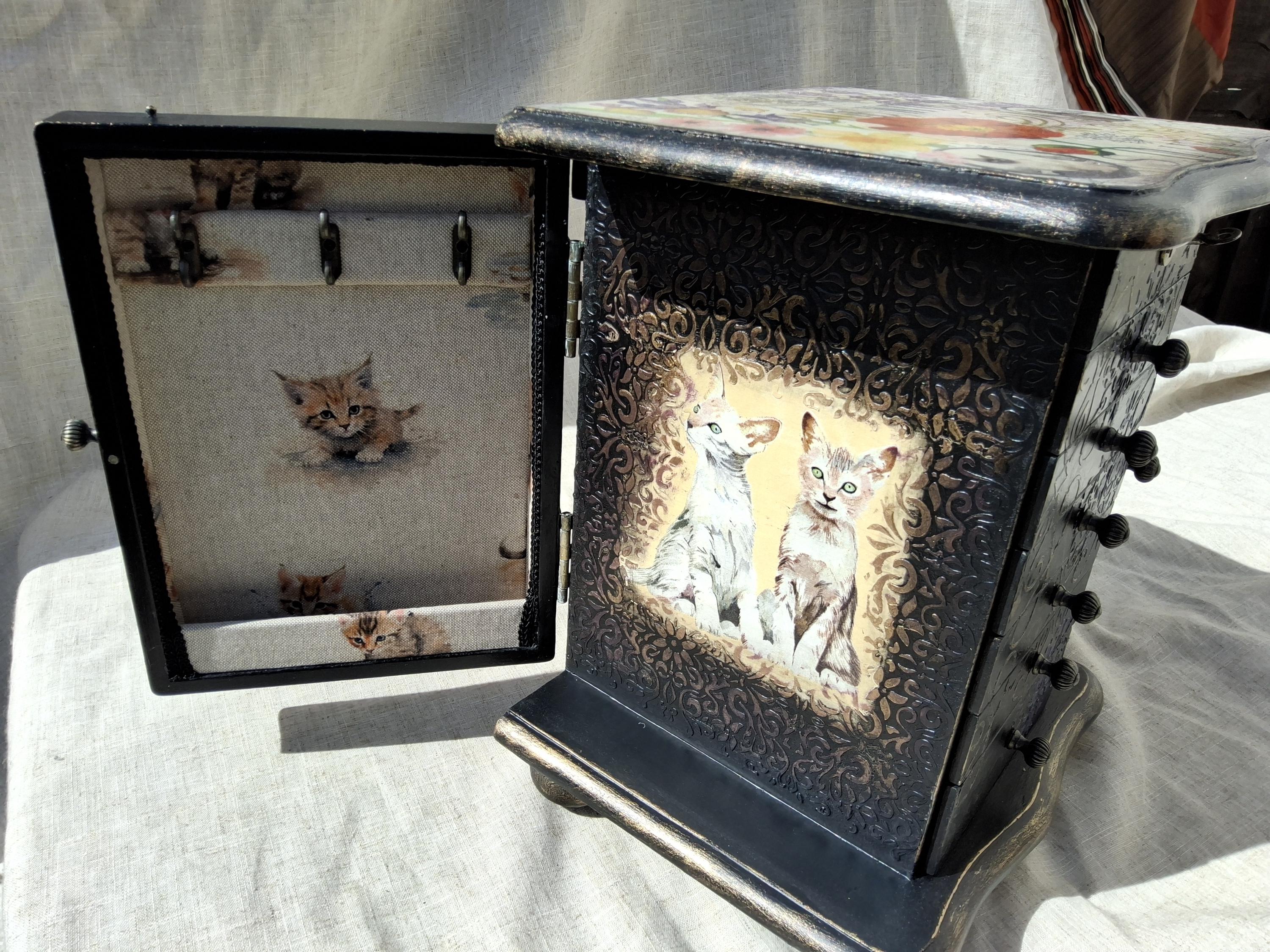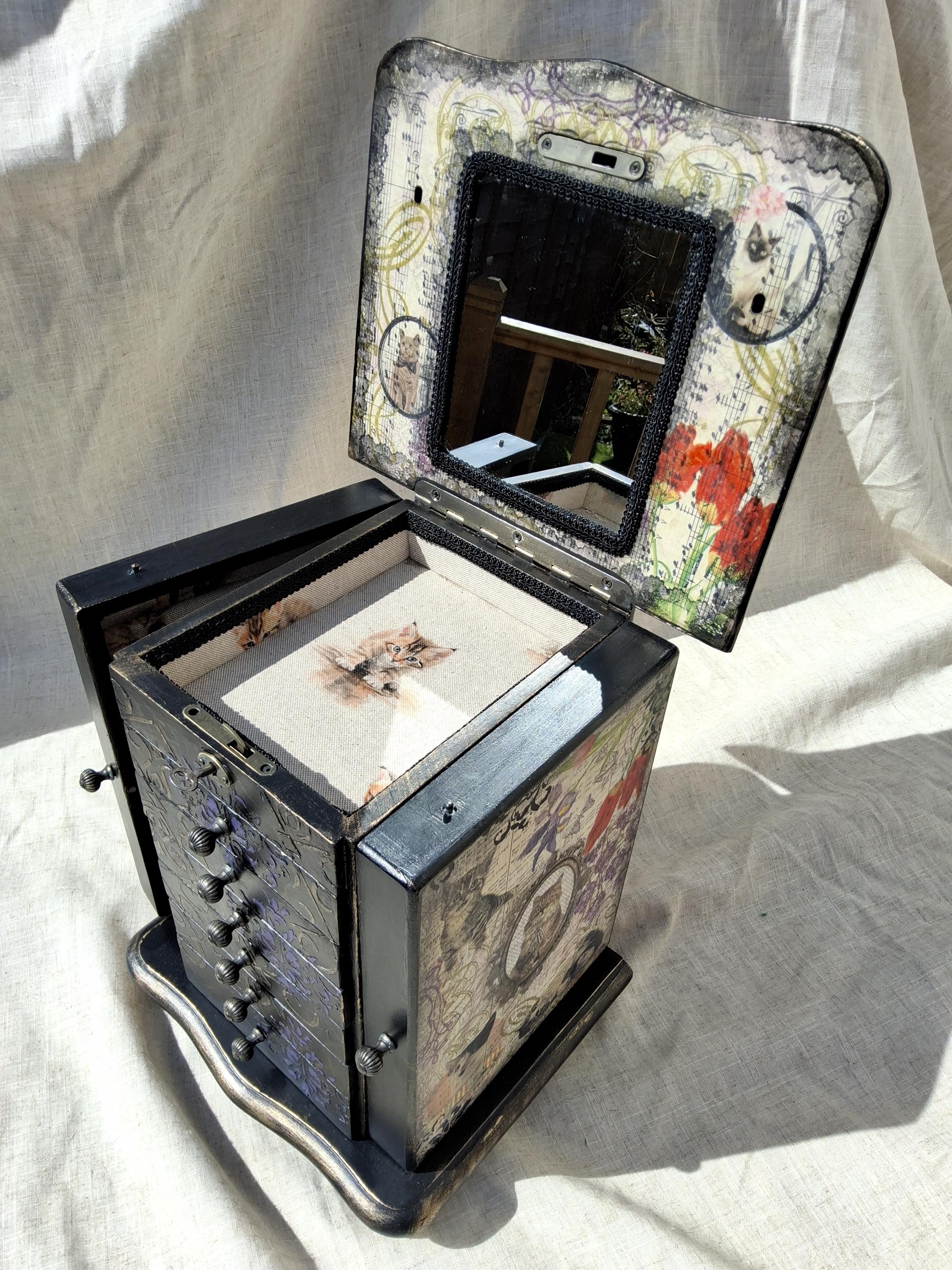 I have have hand decorated this box with decoupaged cats and kittens, along with floral patterns on the top and sides of doors. Inside the doors has been relined and has hooks for necklaces. Also decorated on the inside when you open the doors with raised stencil effect. The lid lifts up to reveal a mirror and a storage area inside. There is also drawers and each has been relined with kitten printed heavy cotton, and silk twist cord trim.