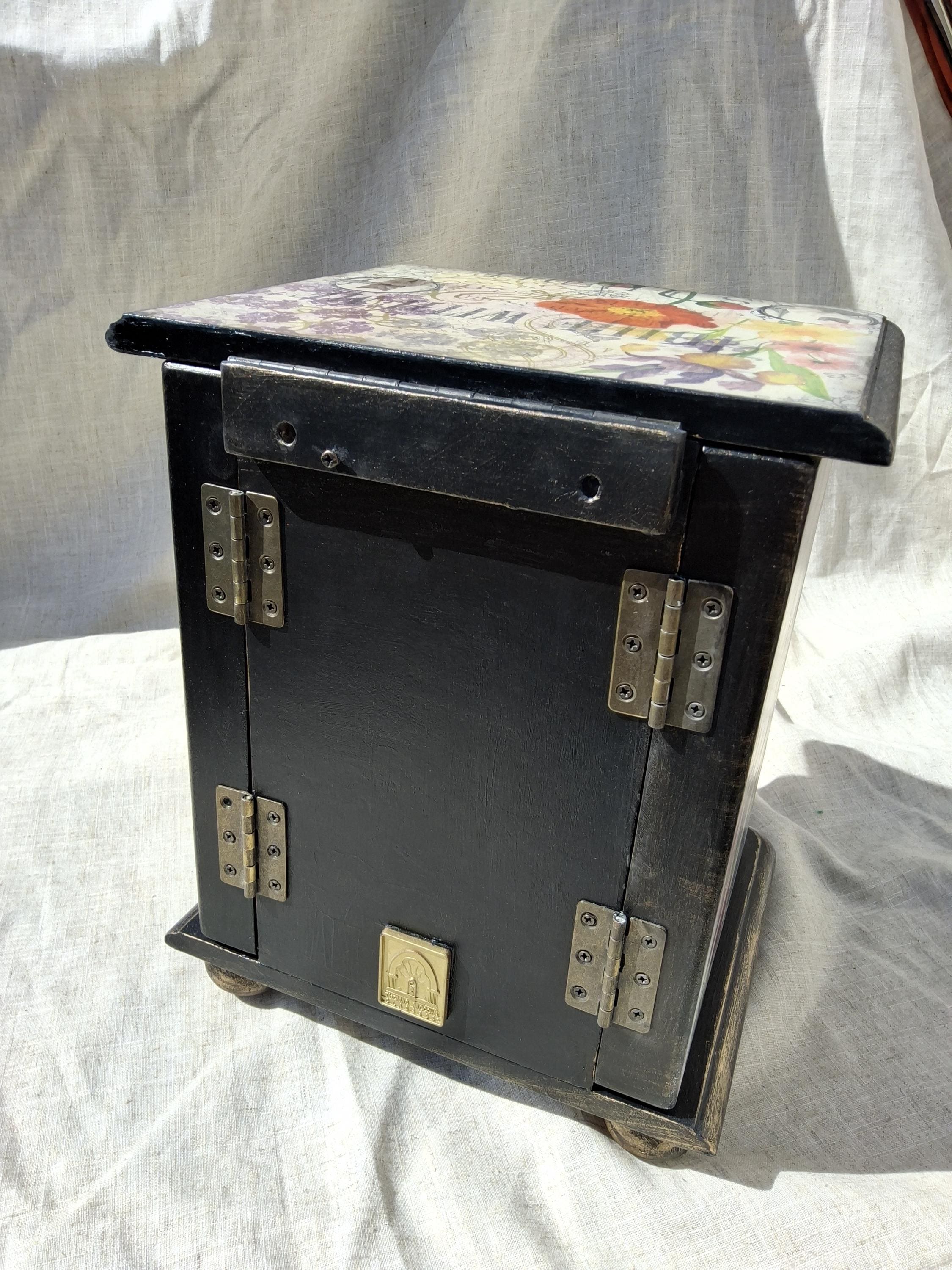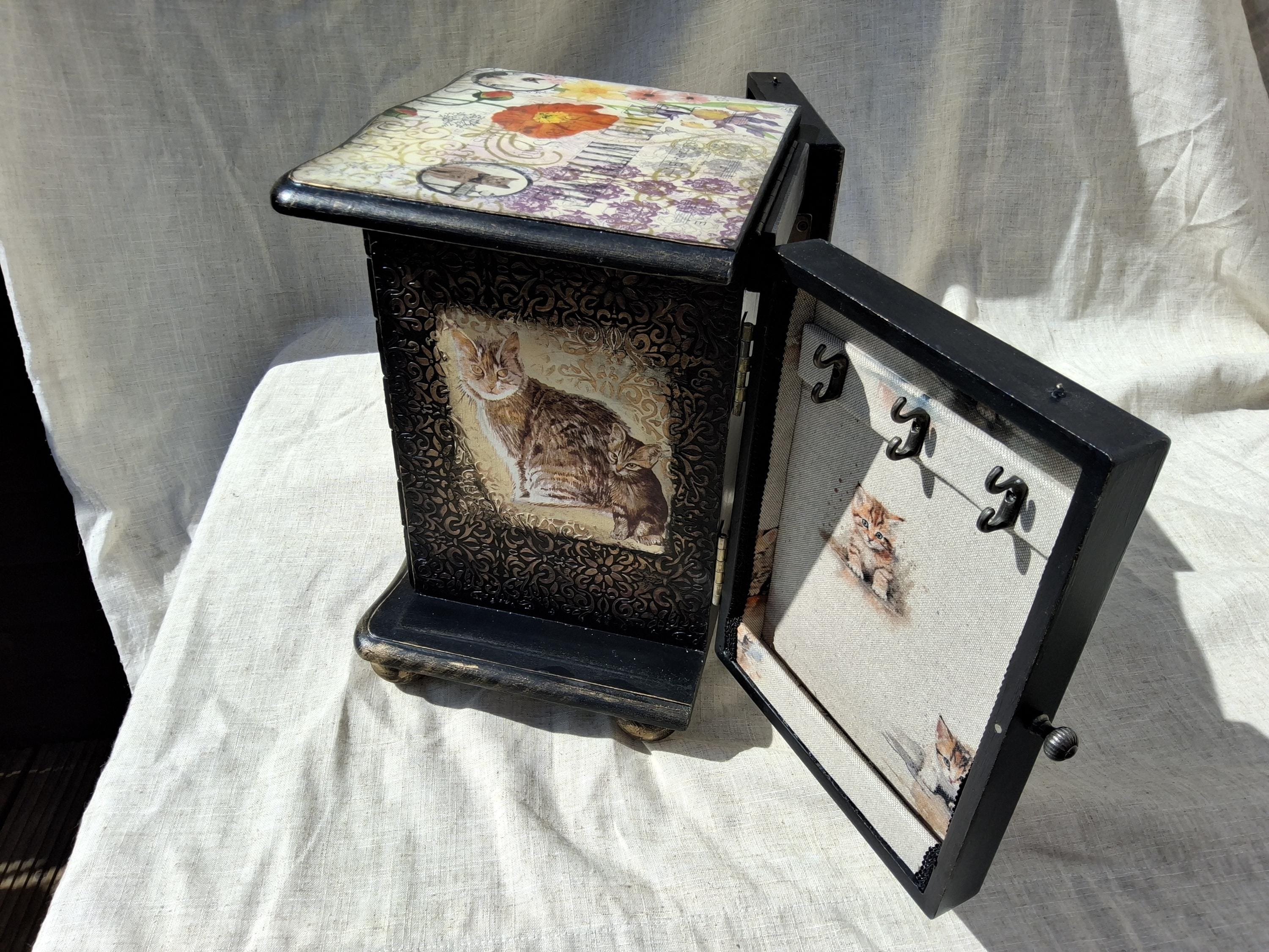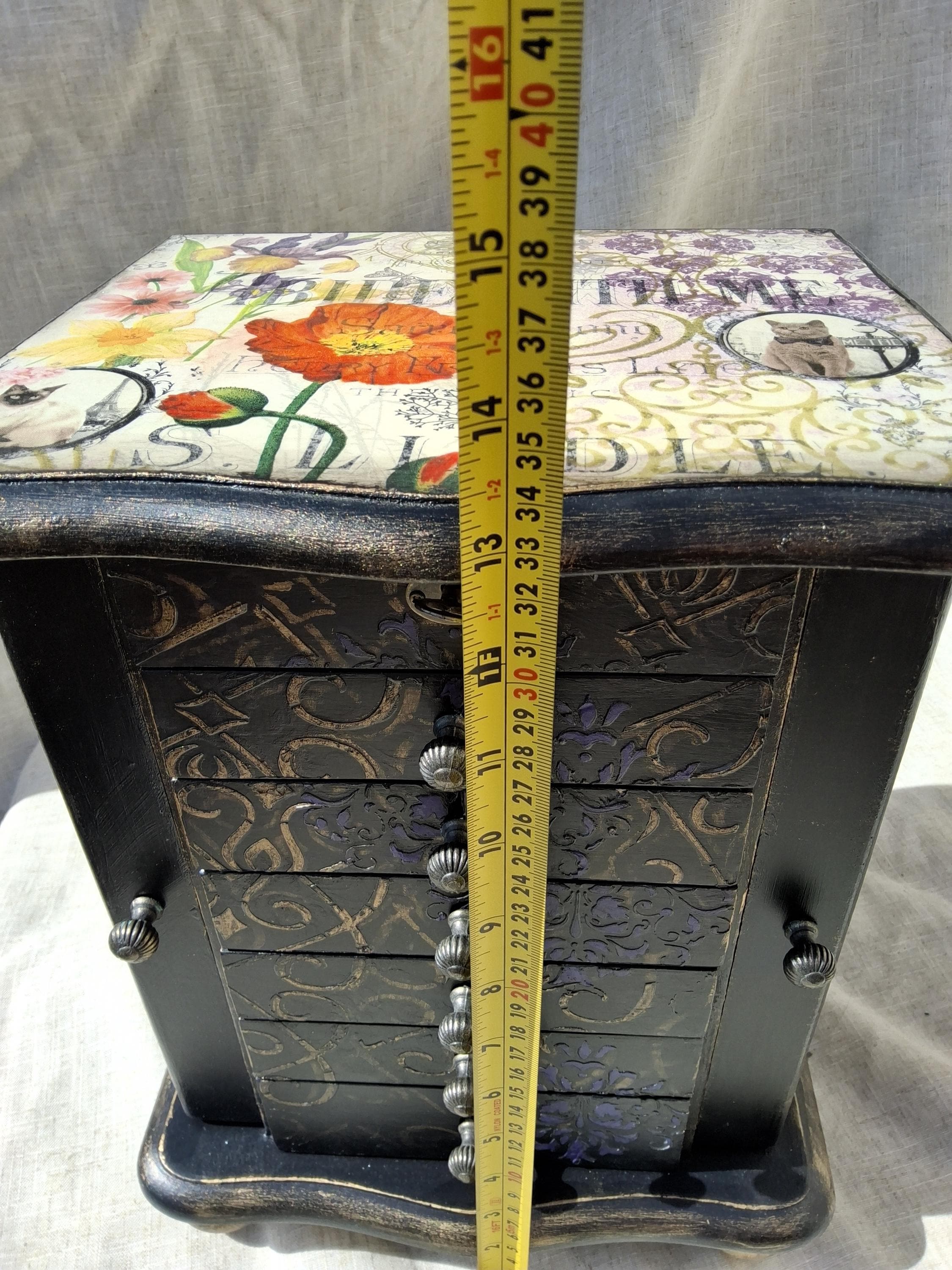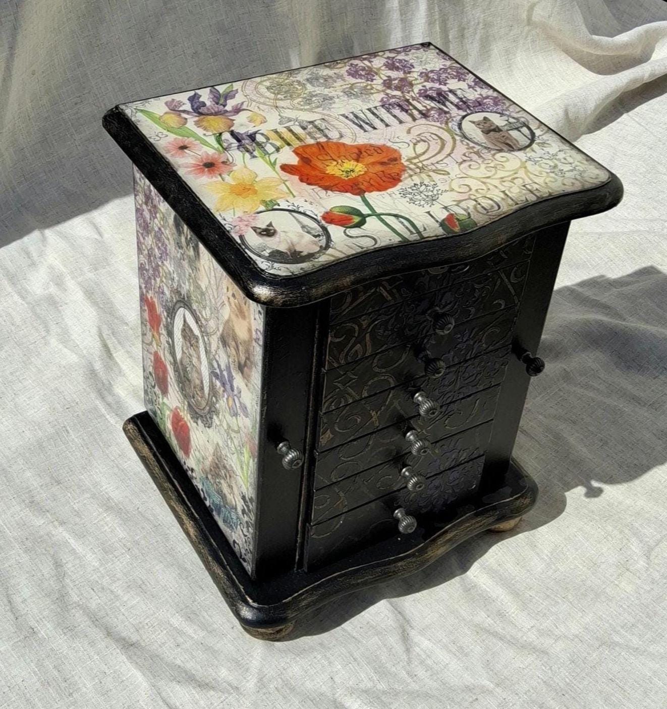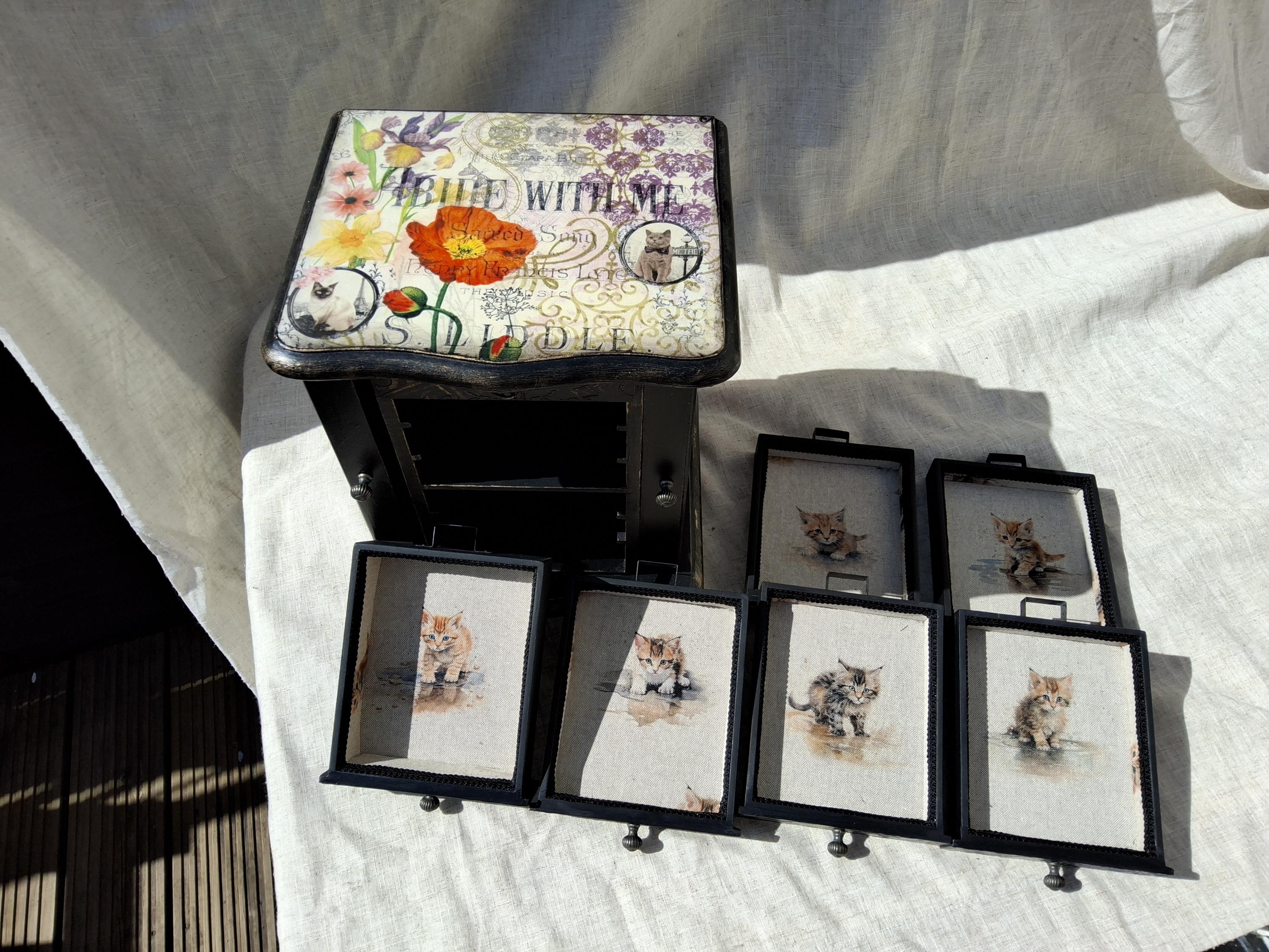I have have hand decorated this box with decoupaged cats and kittens, along with floral patterns on the top and sides of doors. Inside the doors has been relined and has hooks for necklaces. Also decorated on the inside when you open the doors with raised stencil effect. The lid lifts up to reveal a mirror and a storage area inside. There is also drawers and each has been relined with kitten printed heavy cotton, and silk twist cord trim.