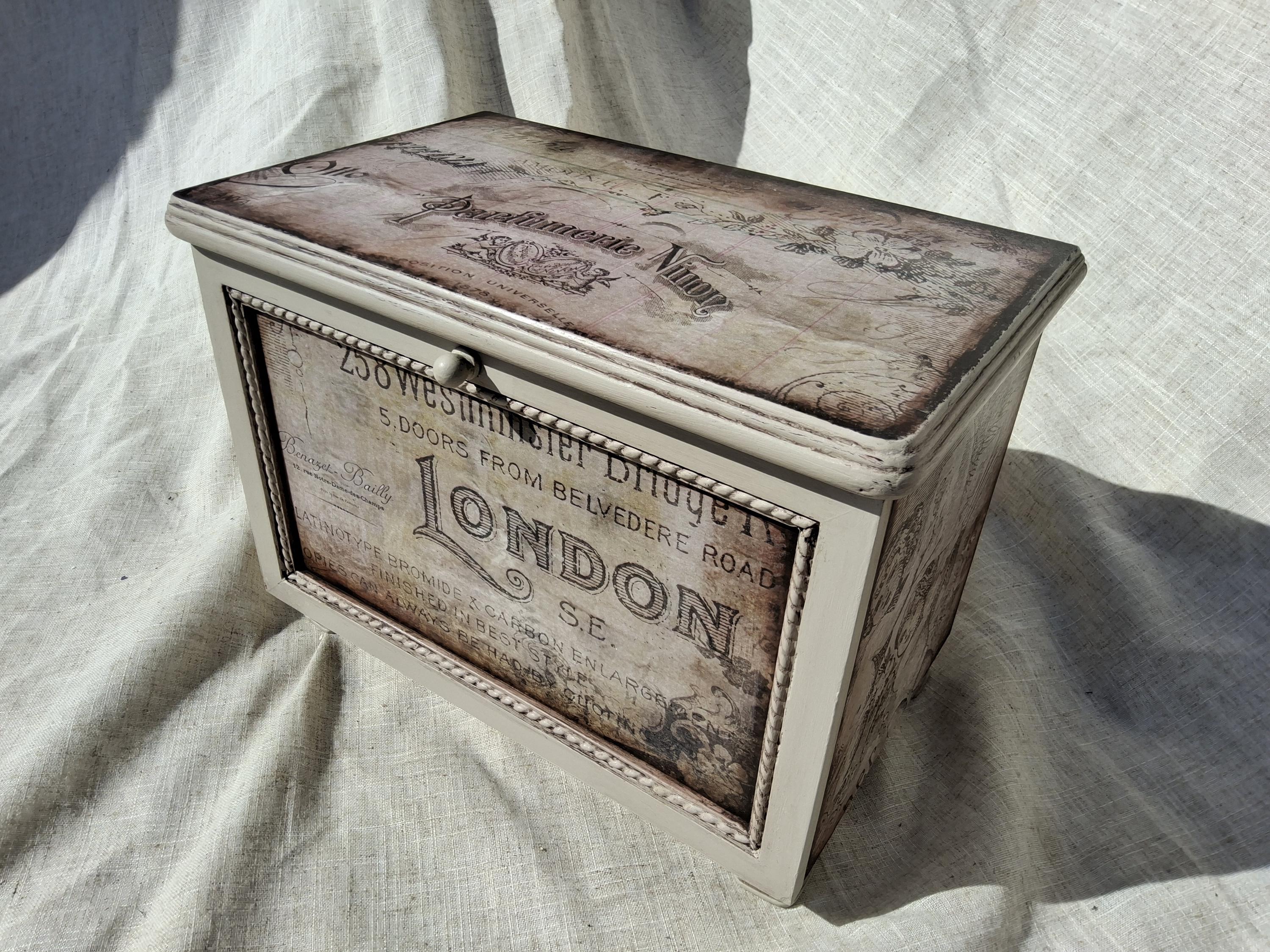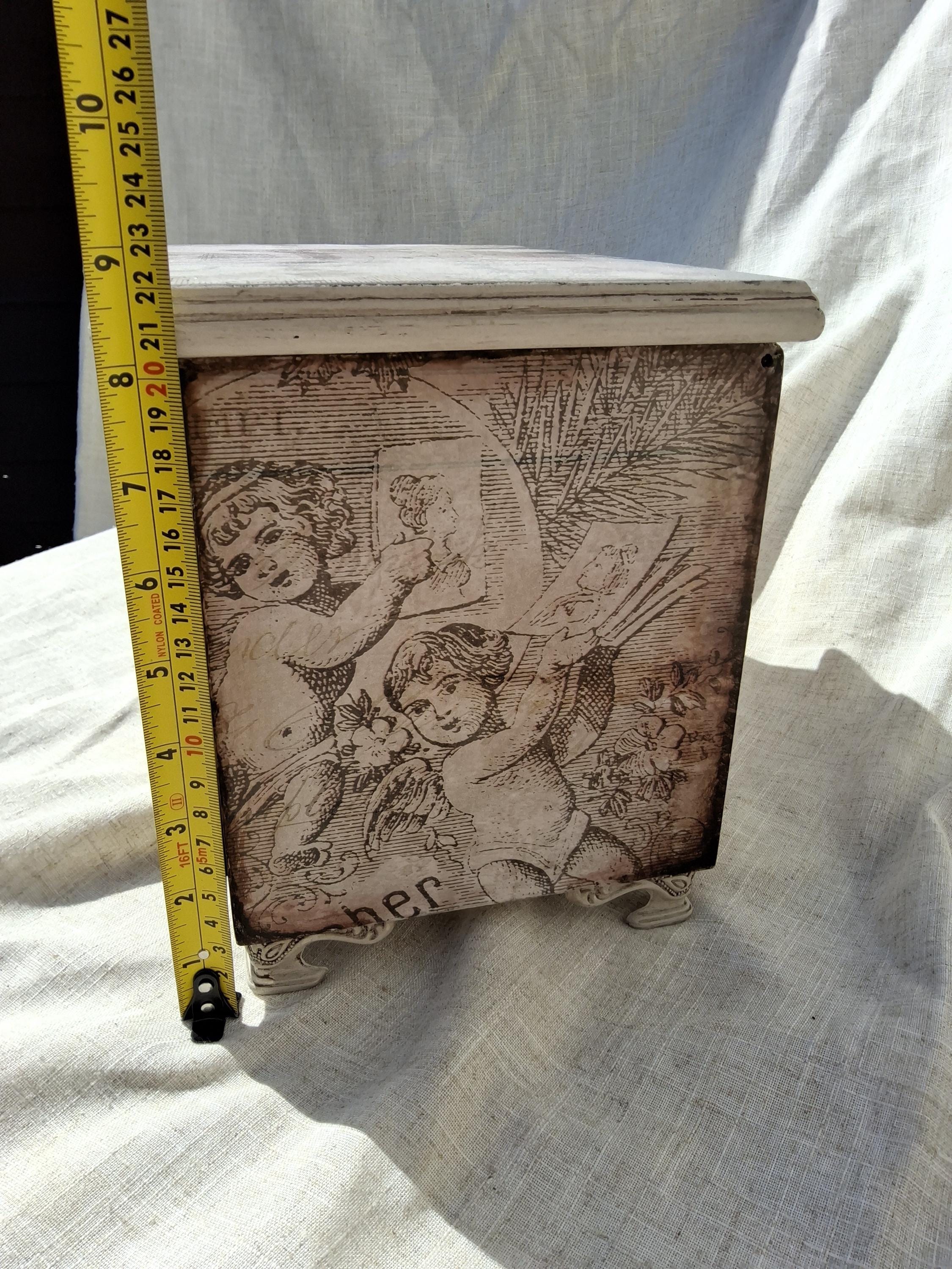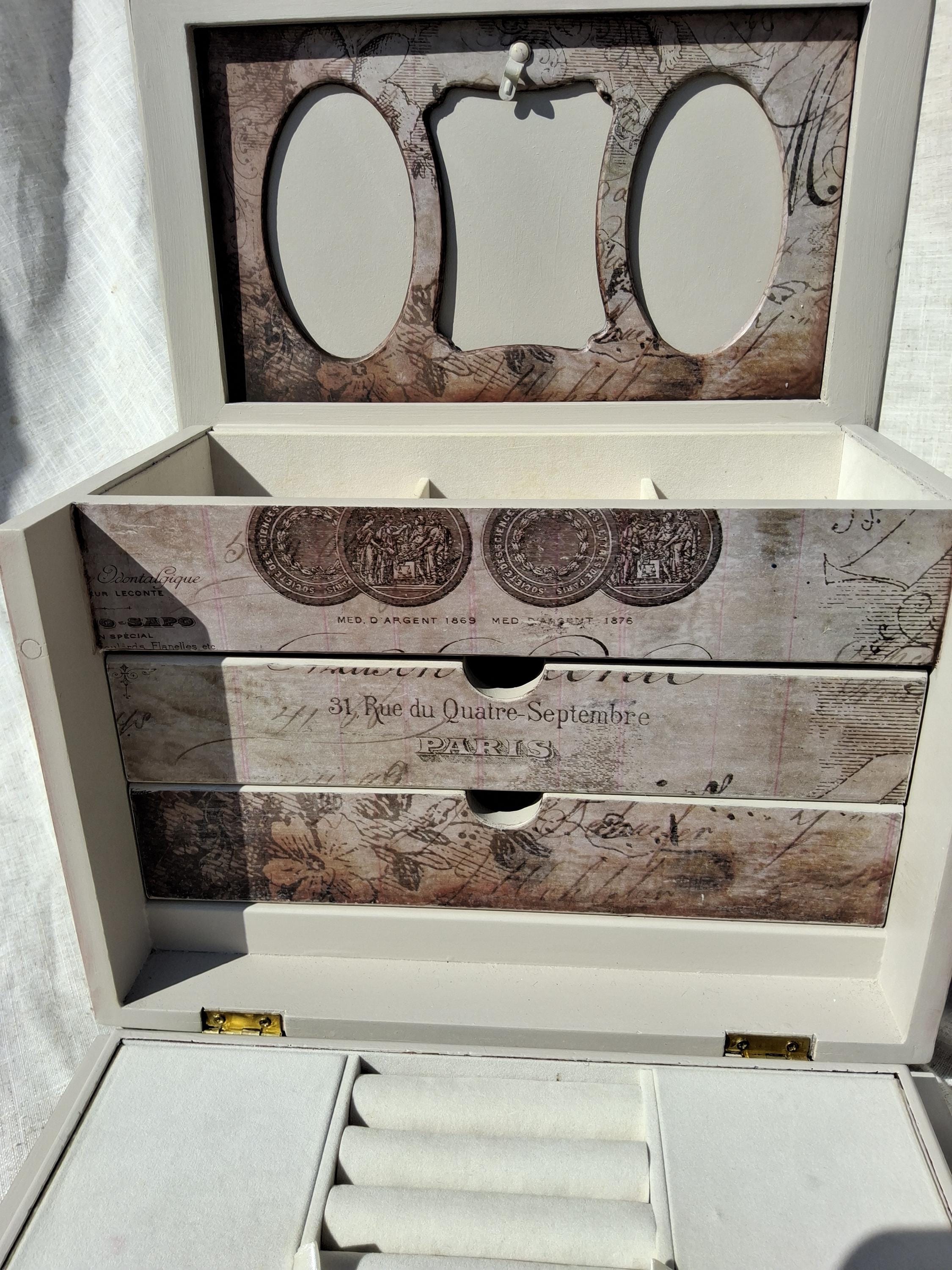 This is a fantastically different box with decoupaged papper on the lift up lid and the framed picture insert inside. This insert has a slide fastening to keep in place.