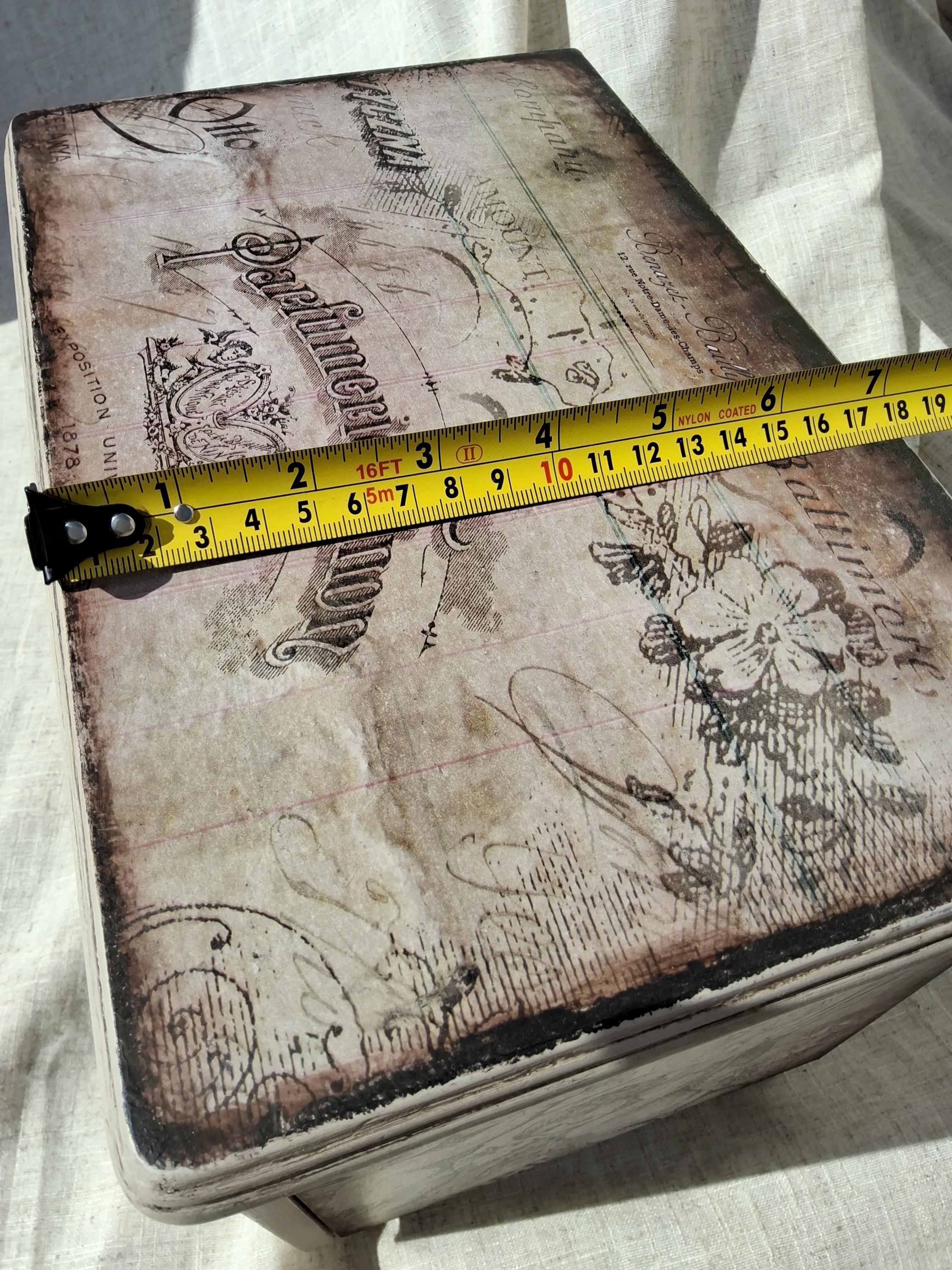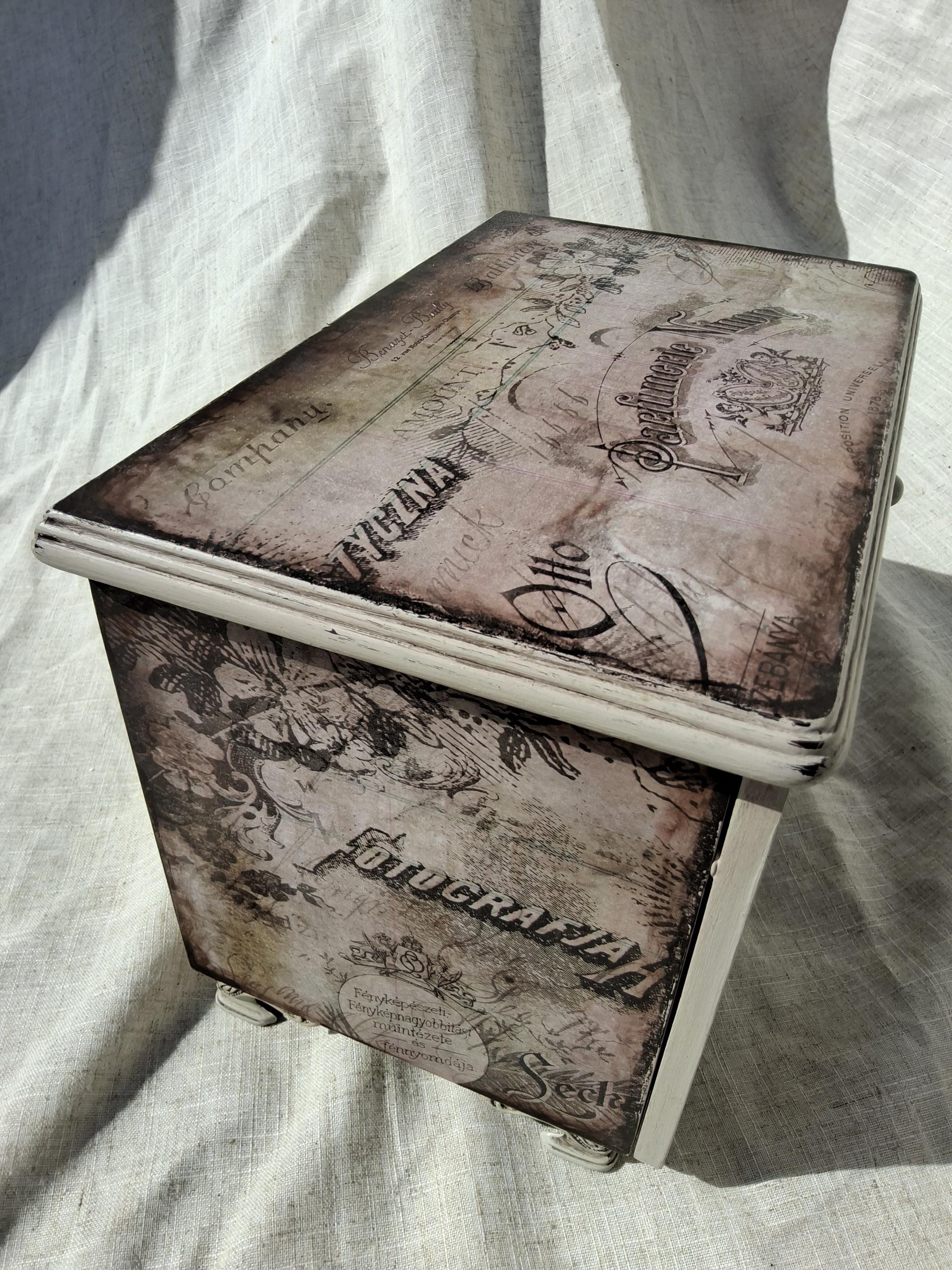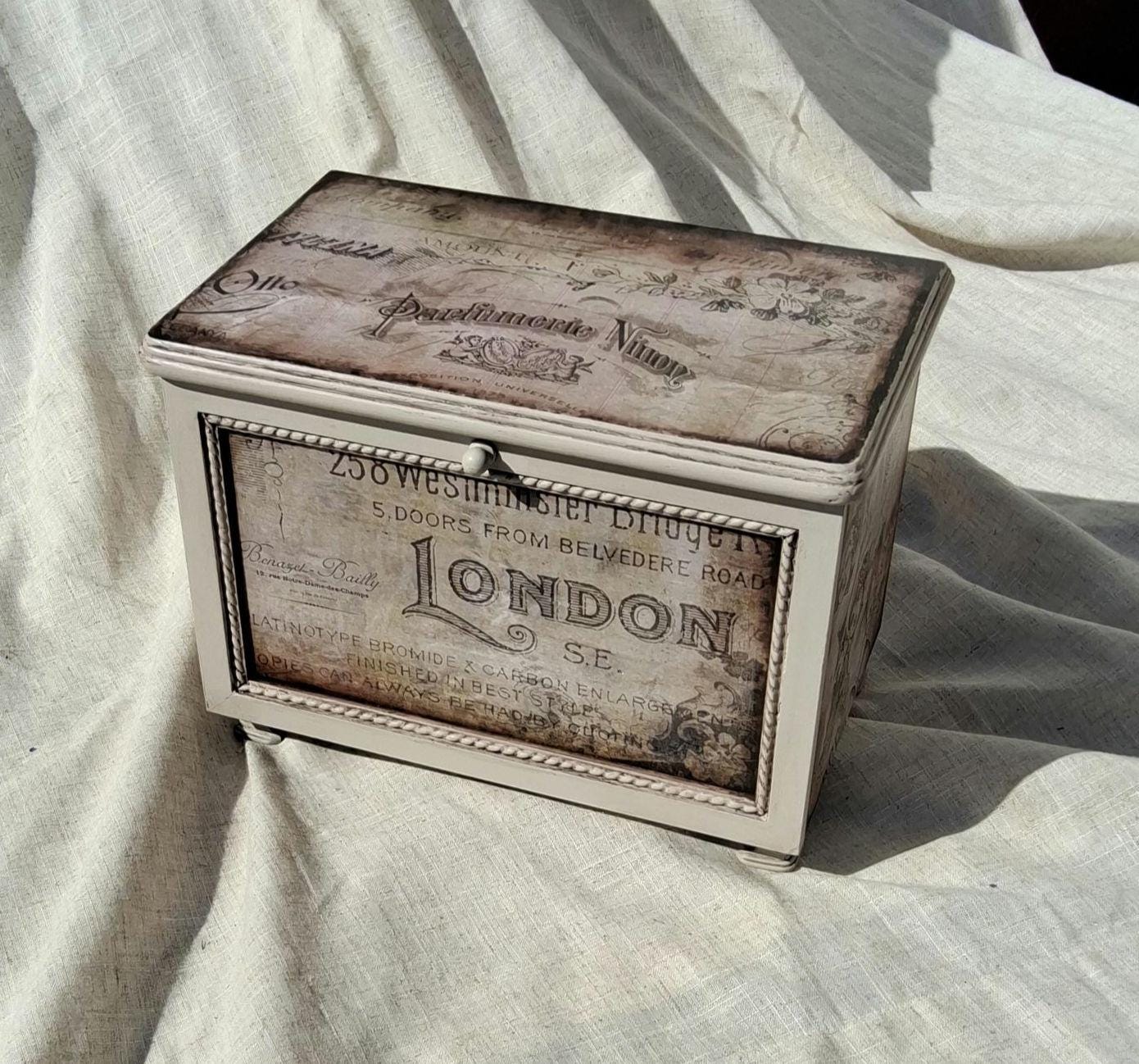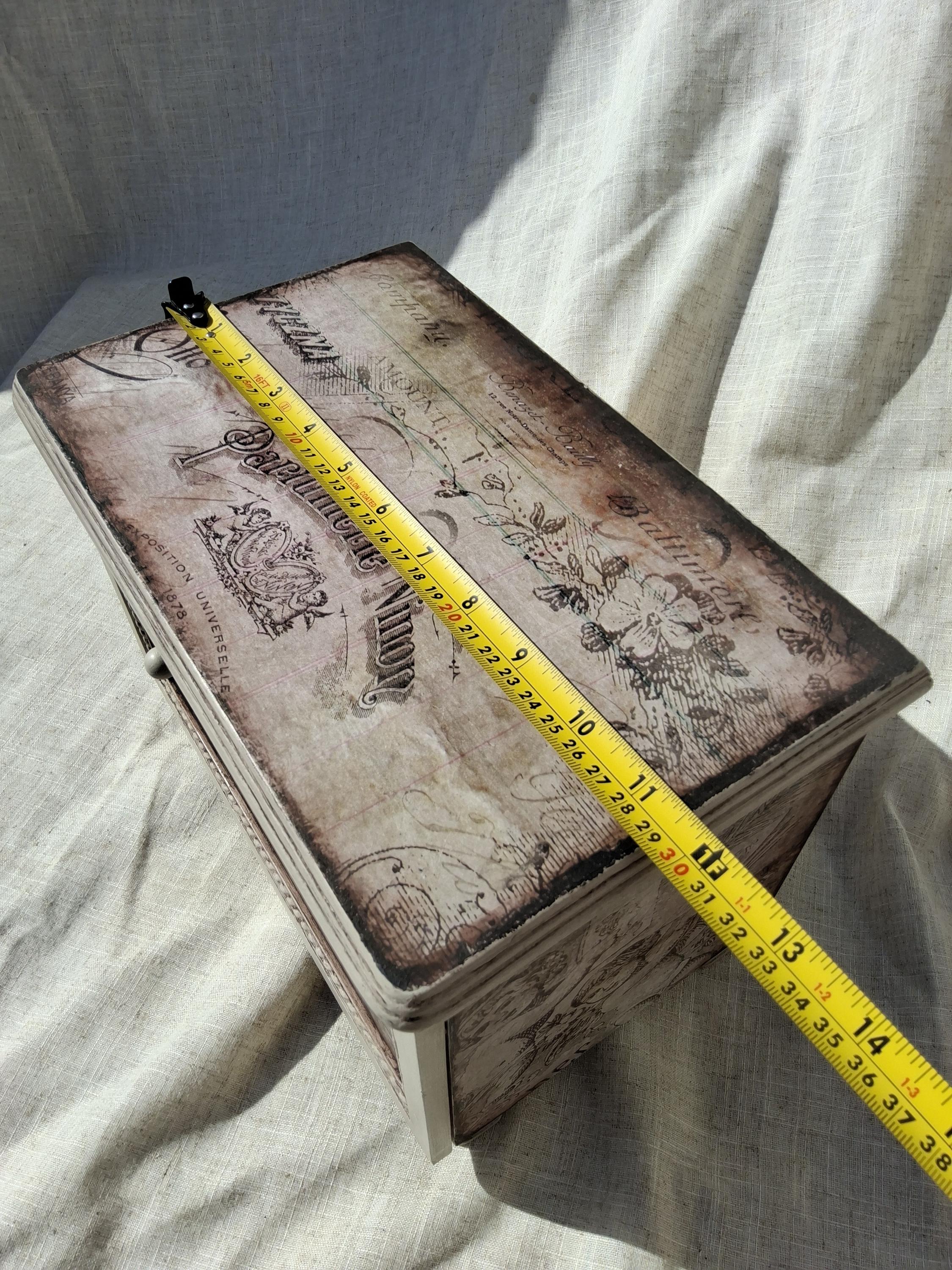 This is a fantastically different box with decoupaged papper on the lift up lid and the framed picture insert inside. This insert has a slide fastening to keep in place.