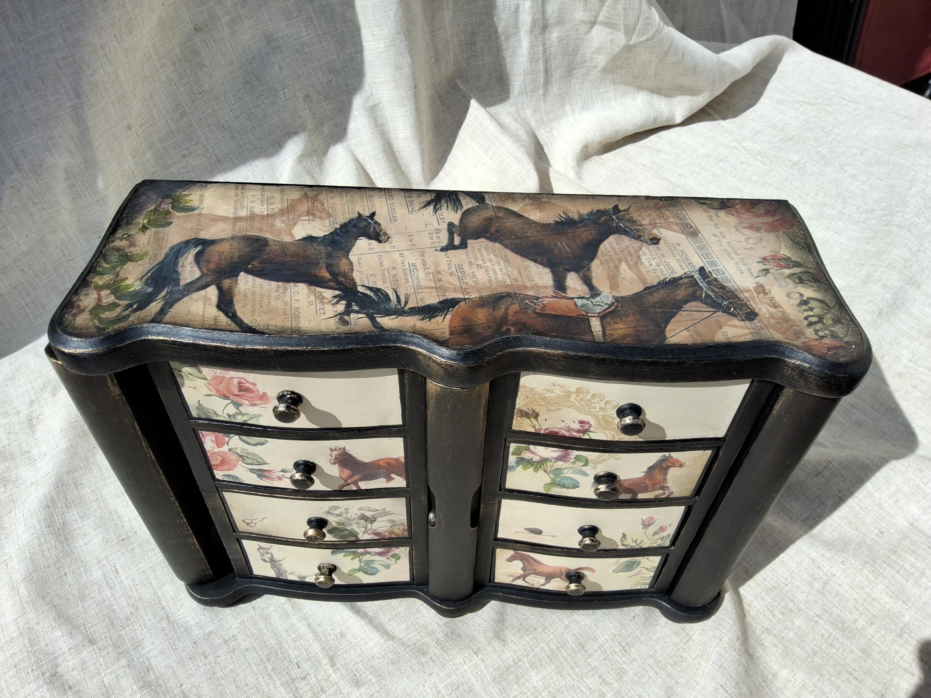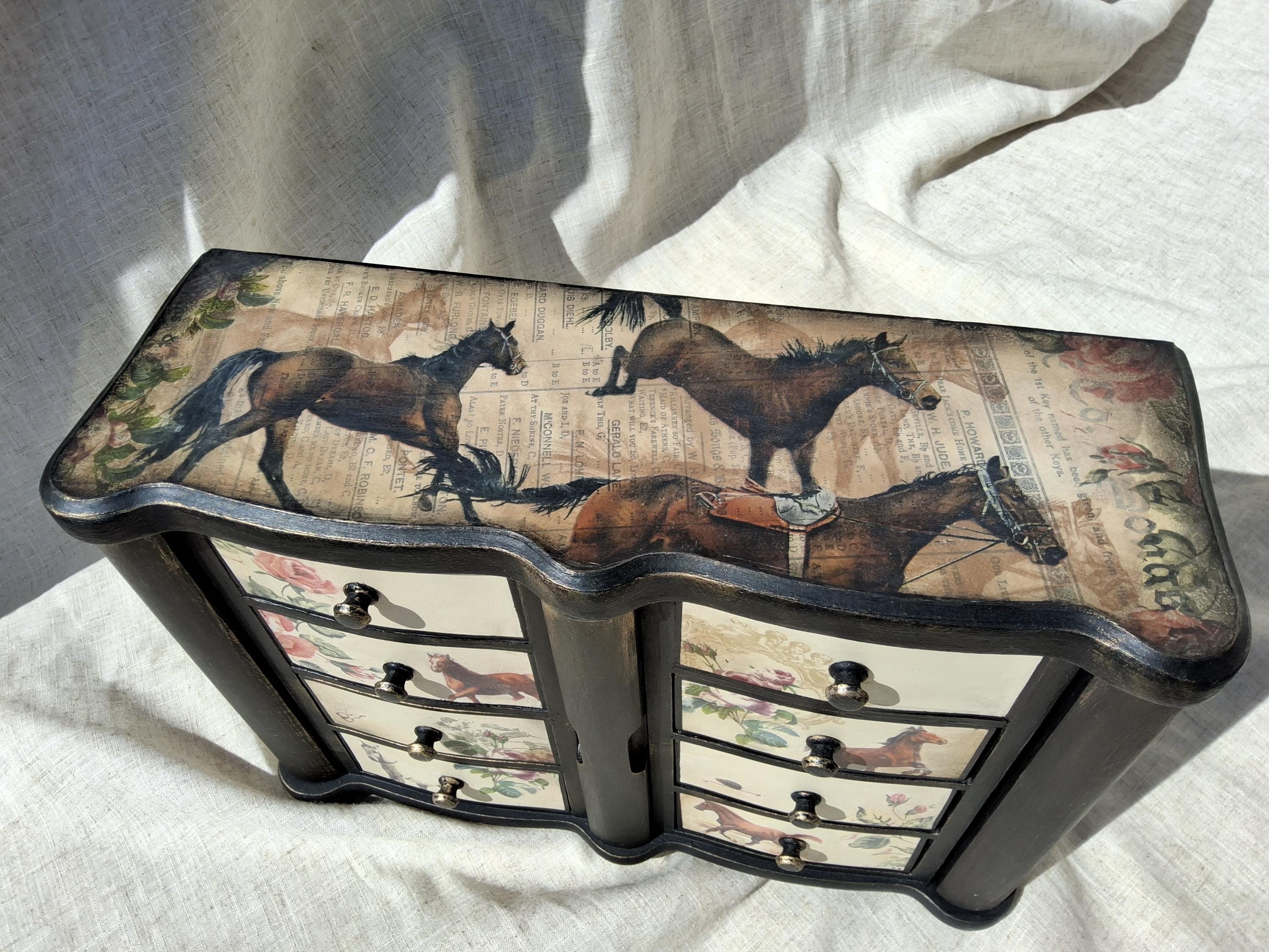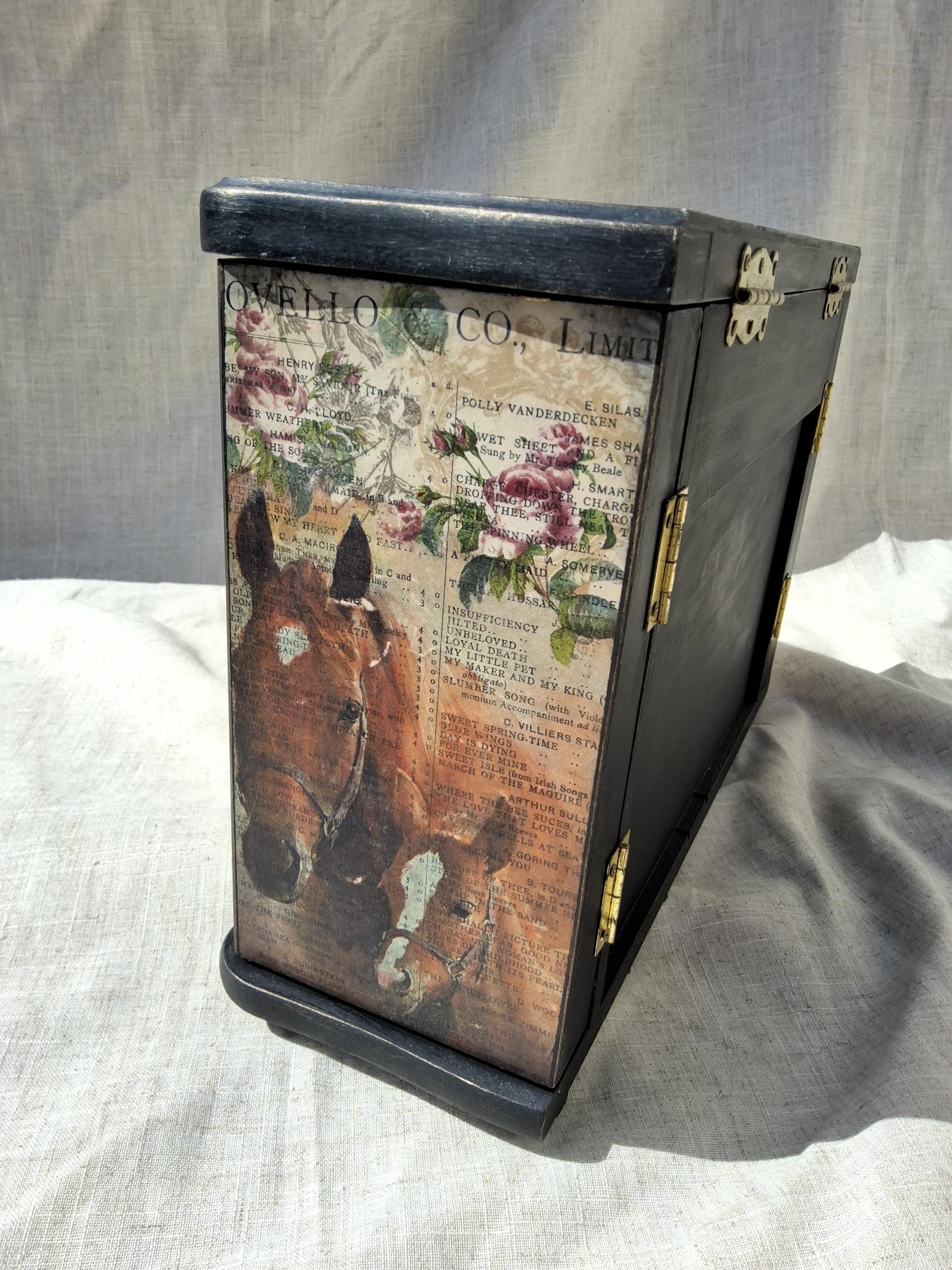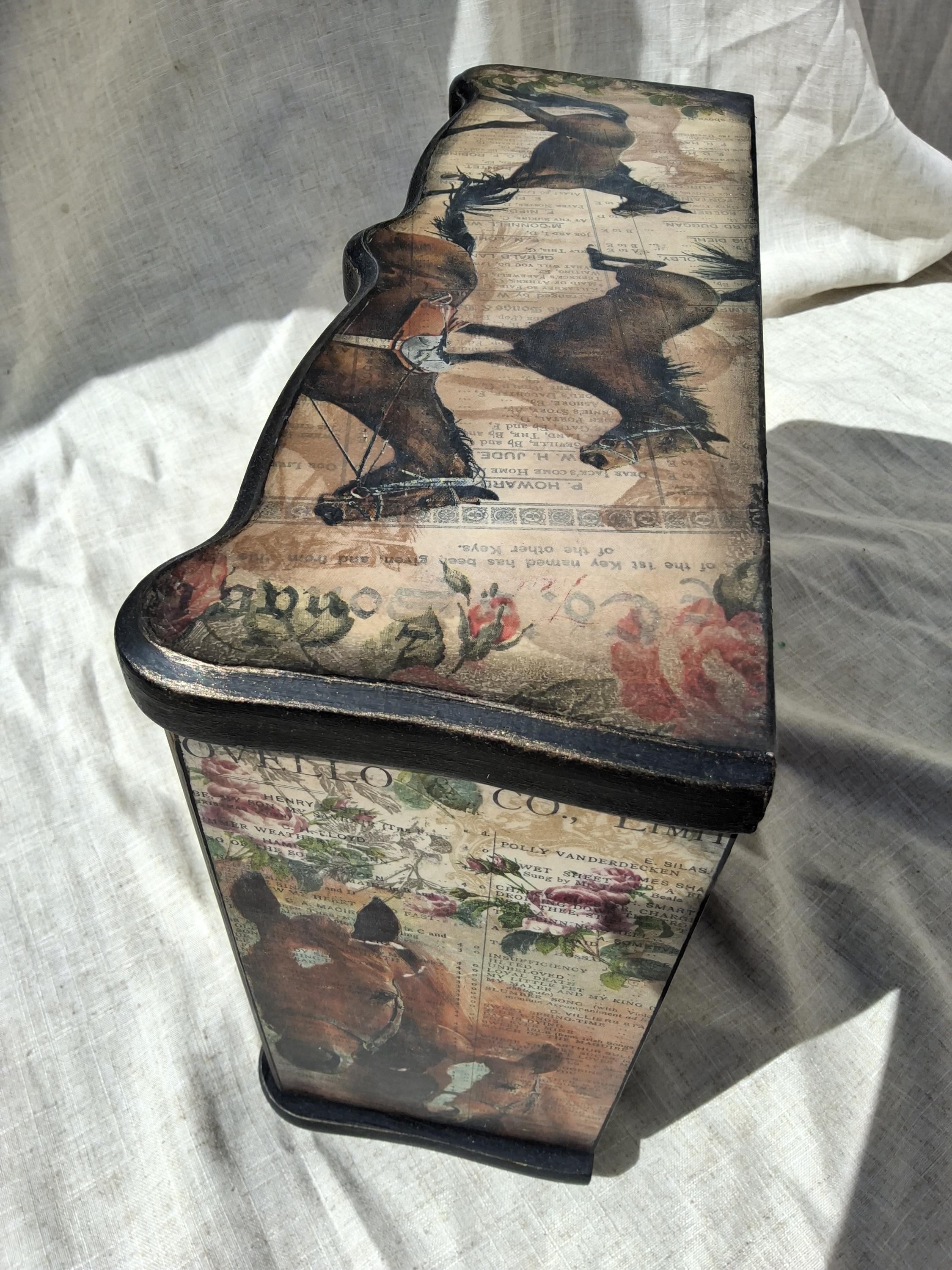 Lovely horse theme large jewellery box,the lid and sides is decorated with vintage music paper and decoupaged horses. the front is decoupaged on cream colour background.
