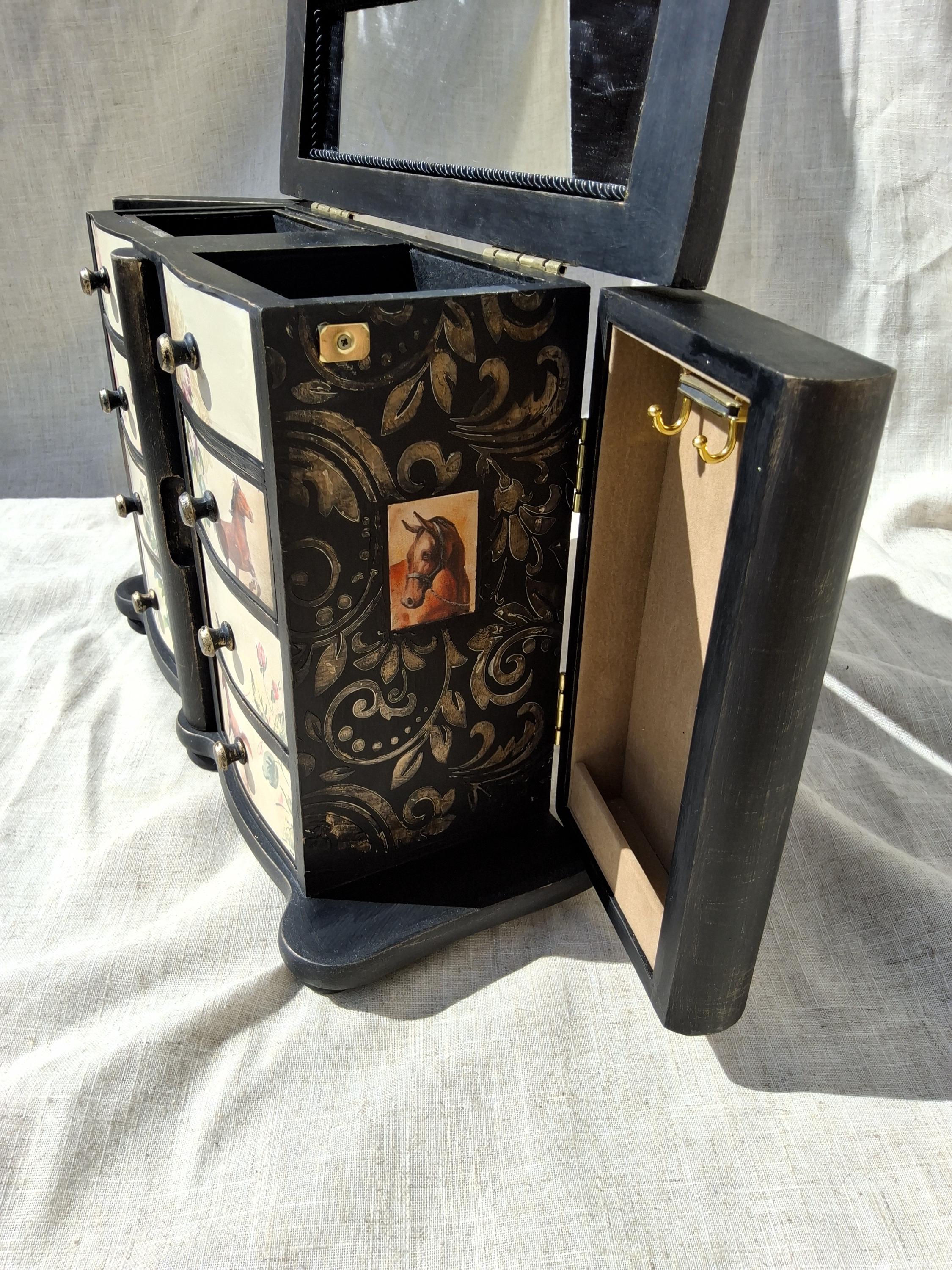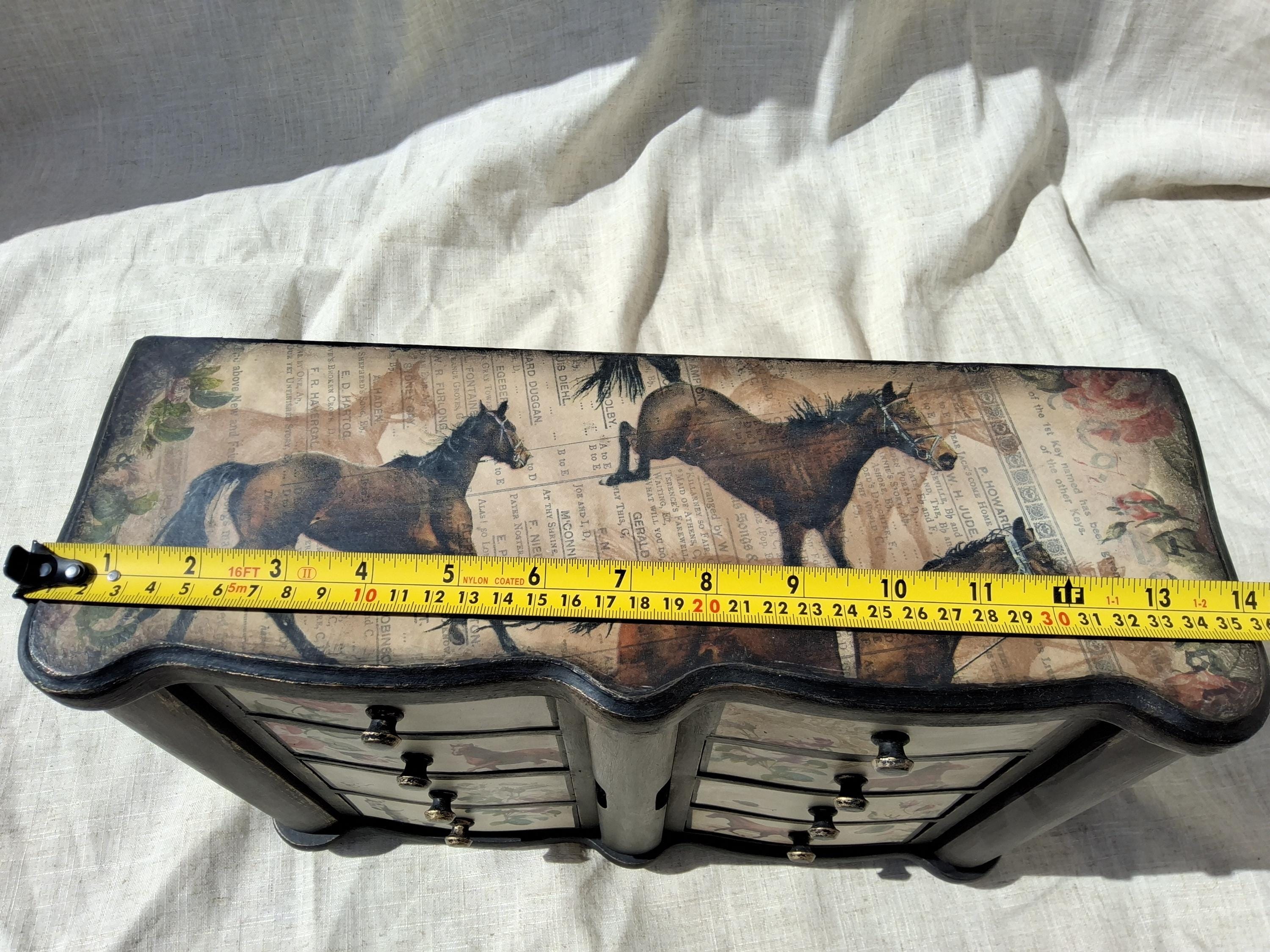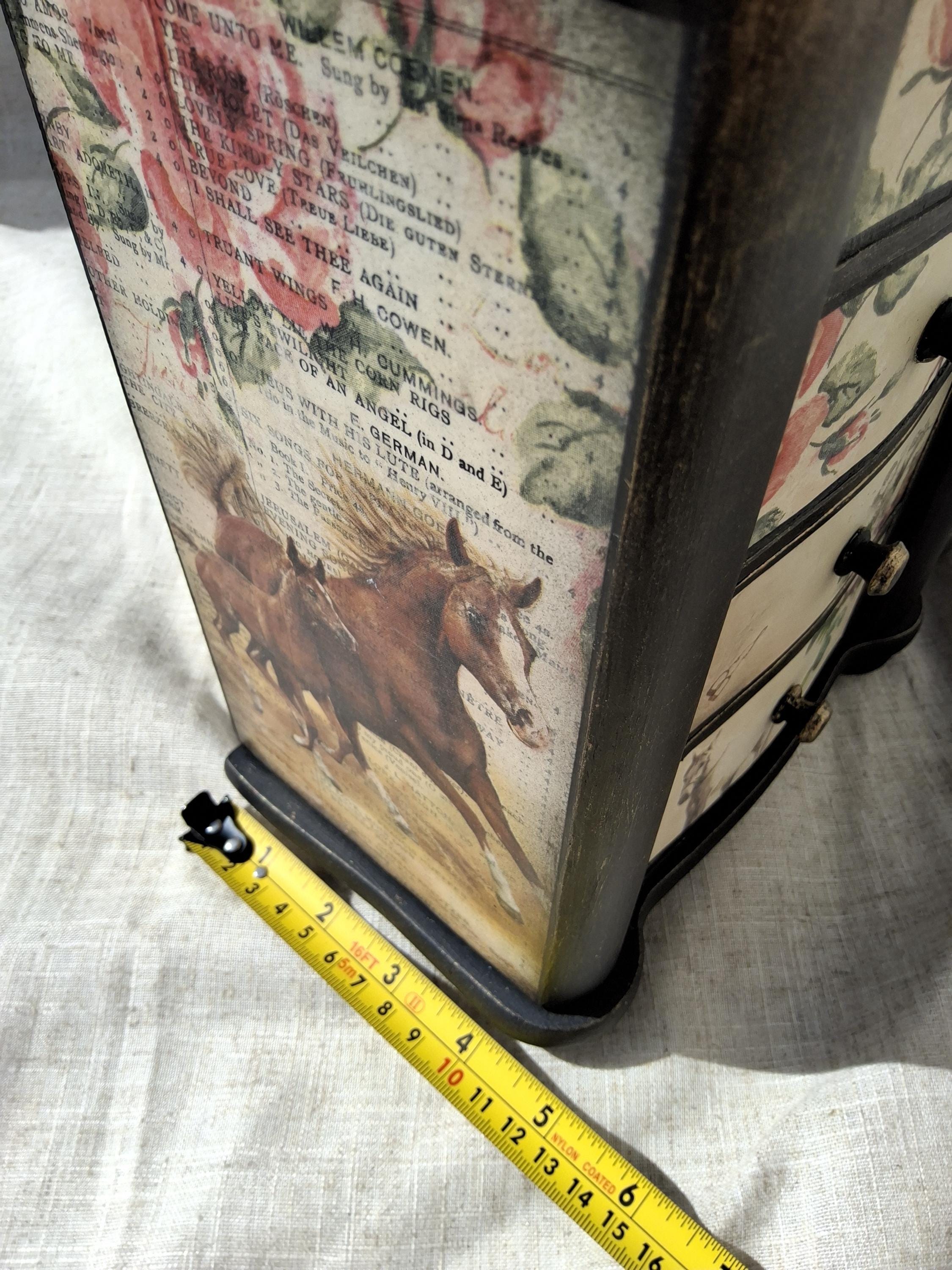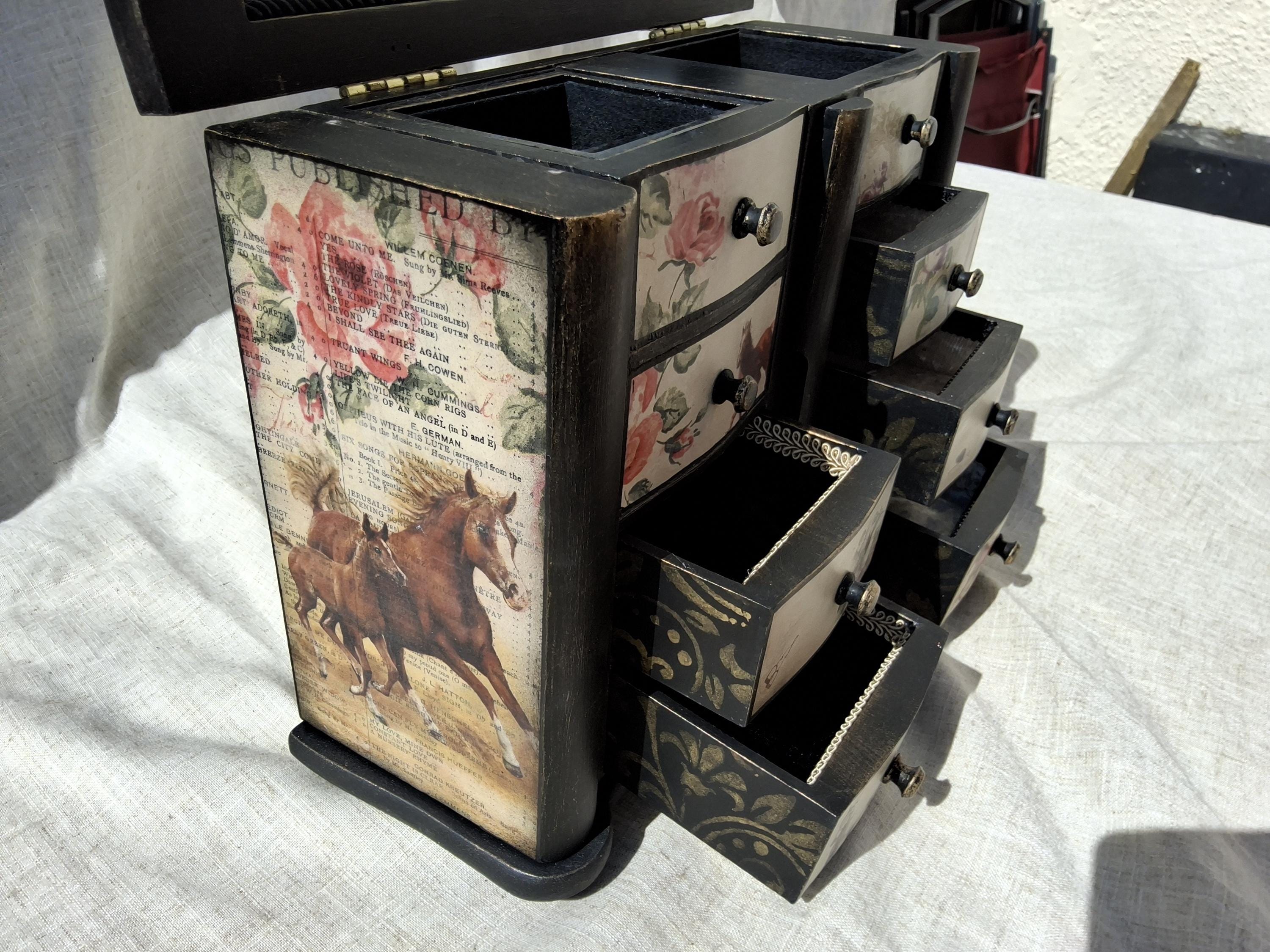 Lovely horse theme large jewellery box,the lid and sides is decorated with vintage music paper and decoupaged horses. the front is decoupaged on cream colour background.