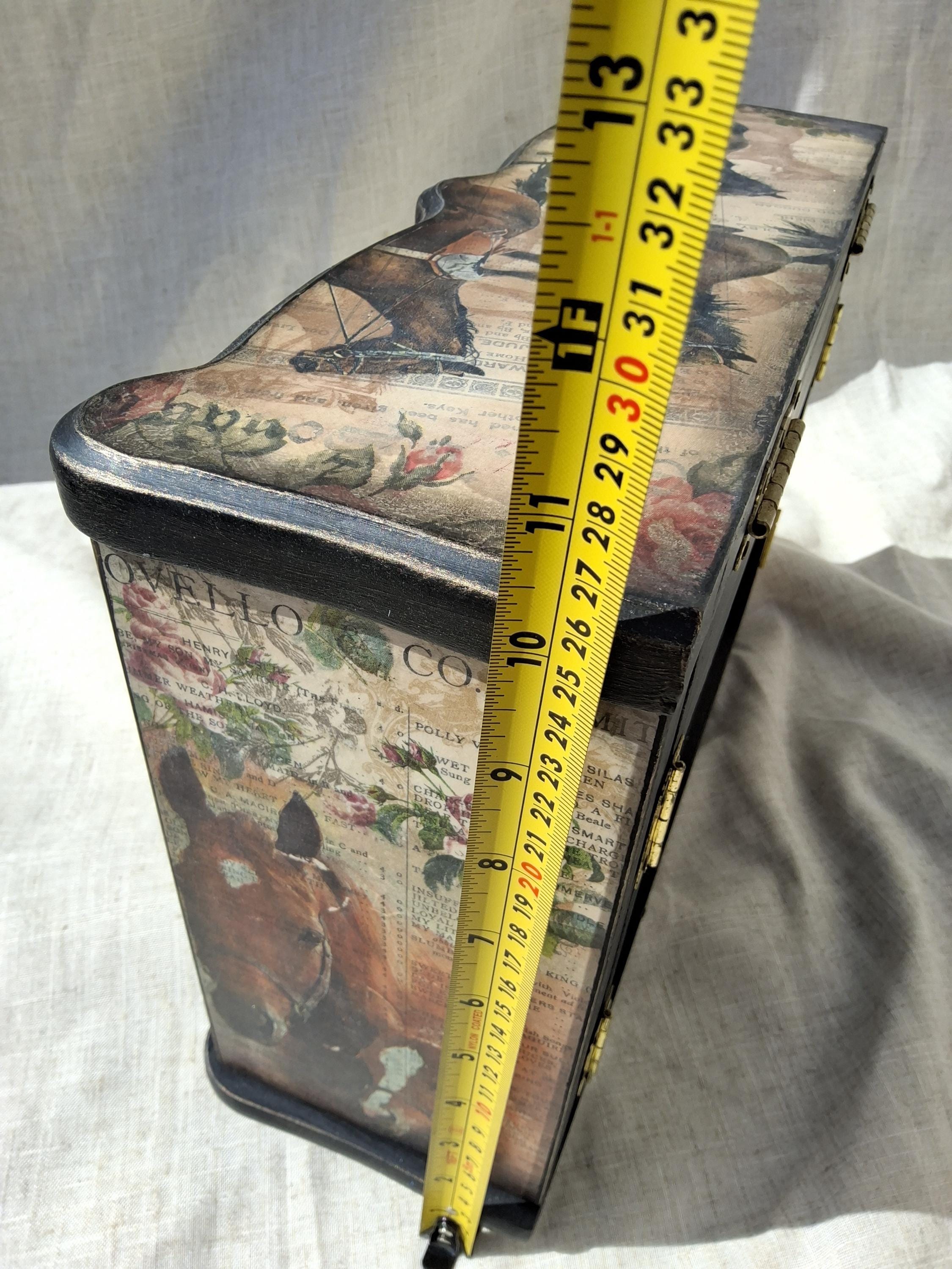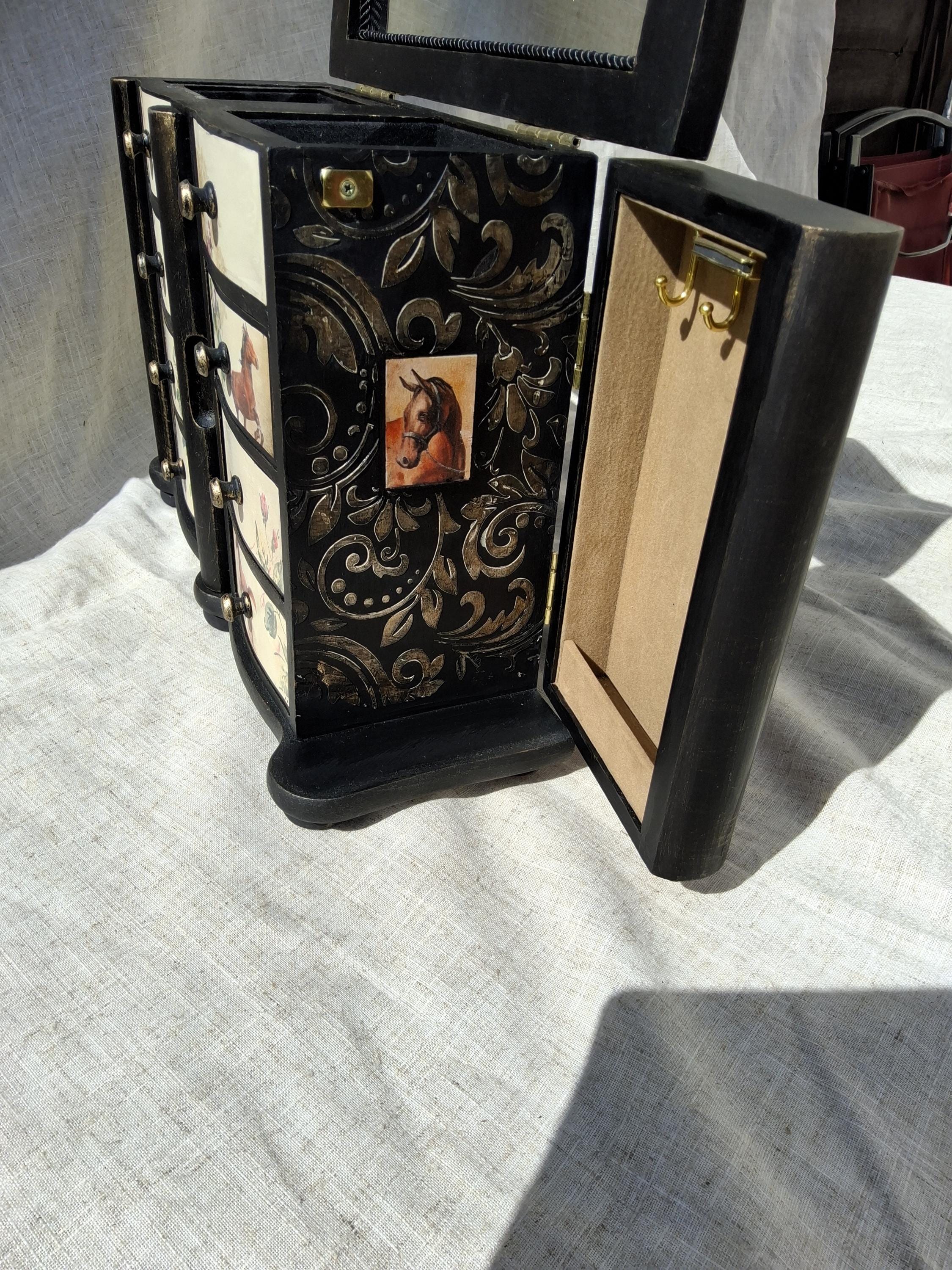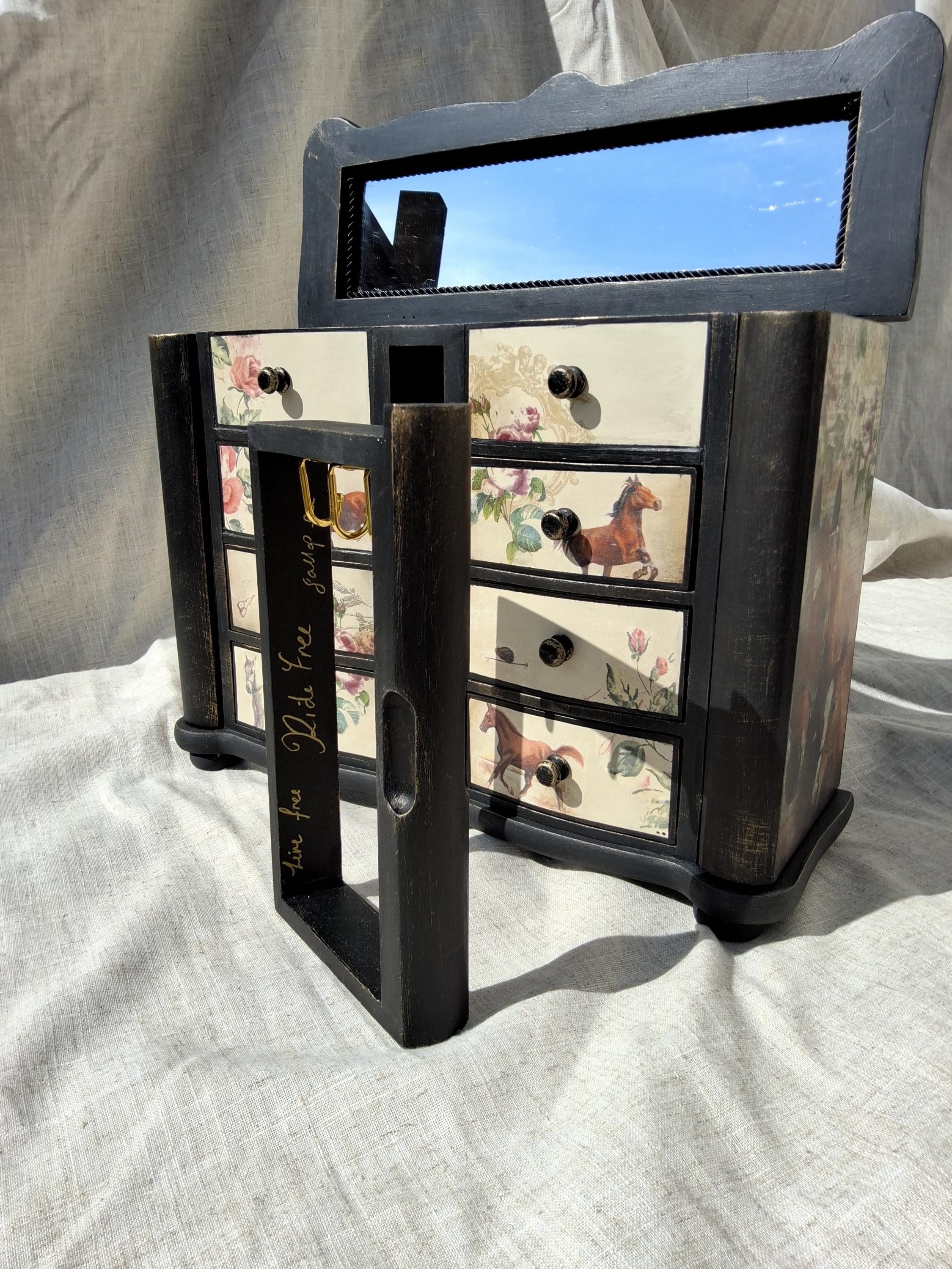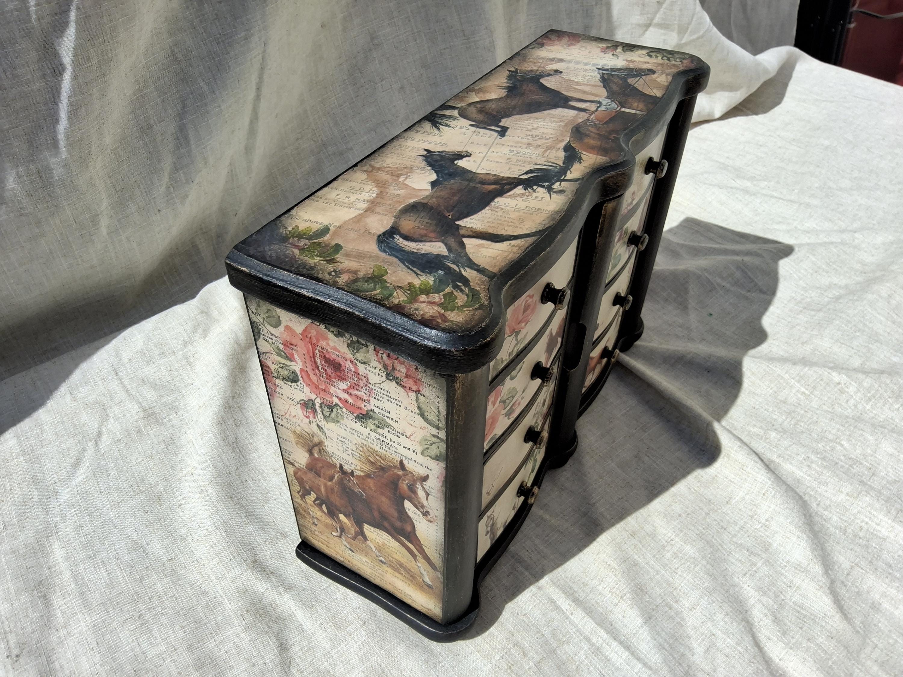 Lovely horse theme large jewellery box,the lid and sides is decorated with vintage music paper and decoupaged horses. the front is decoupaged on cream colour background.