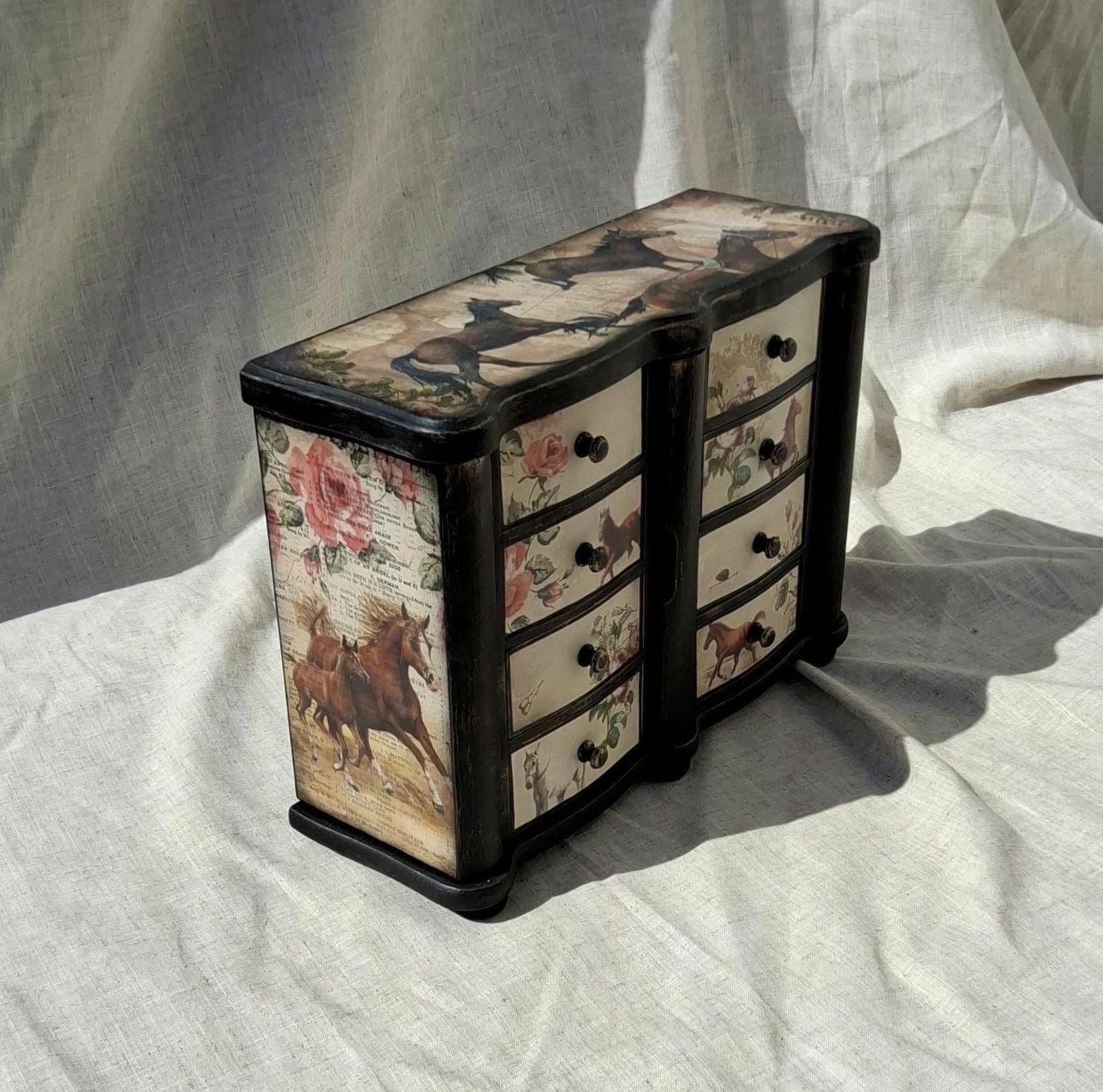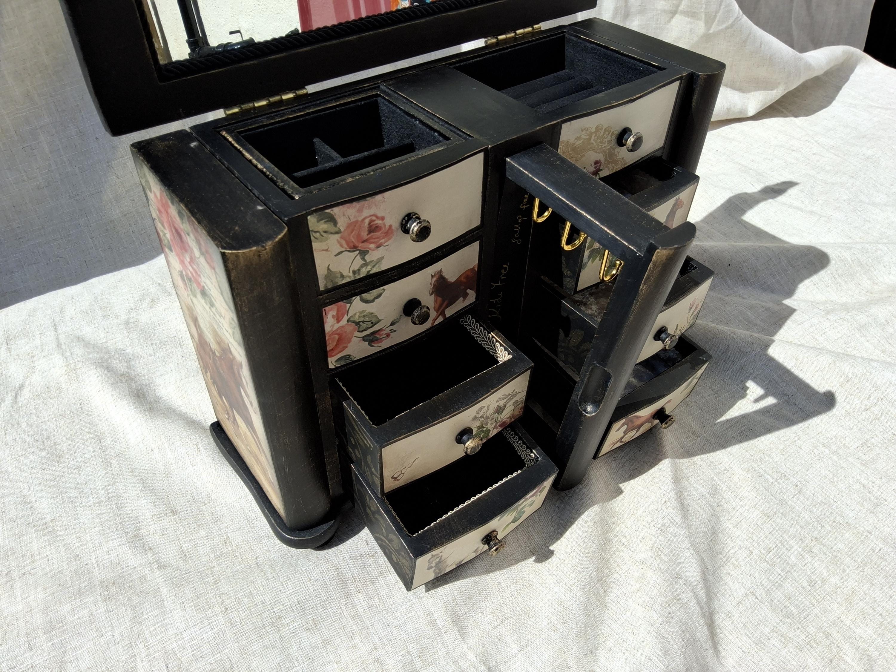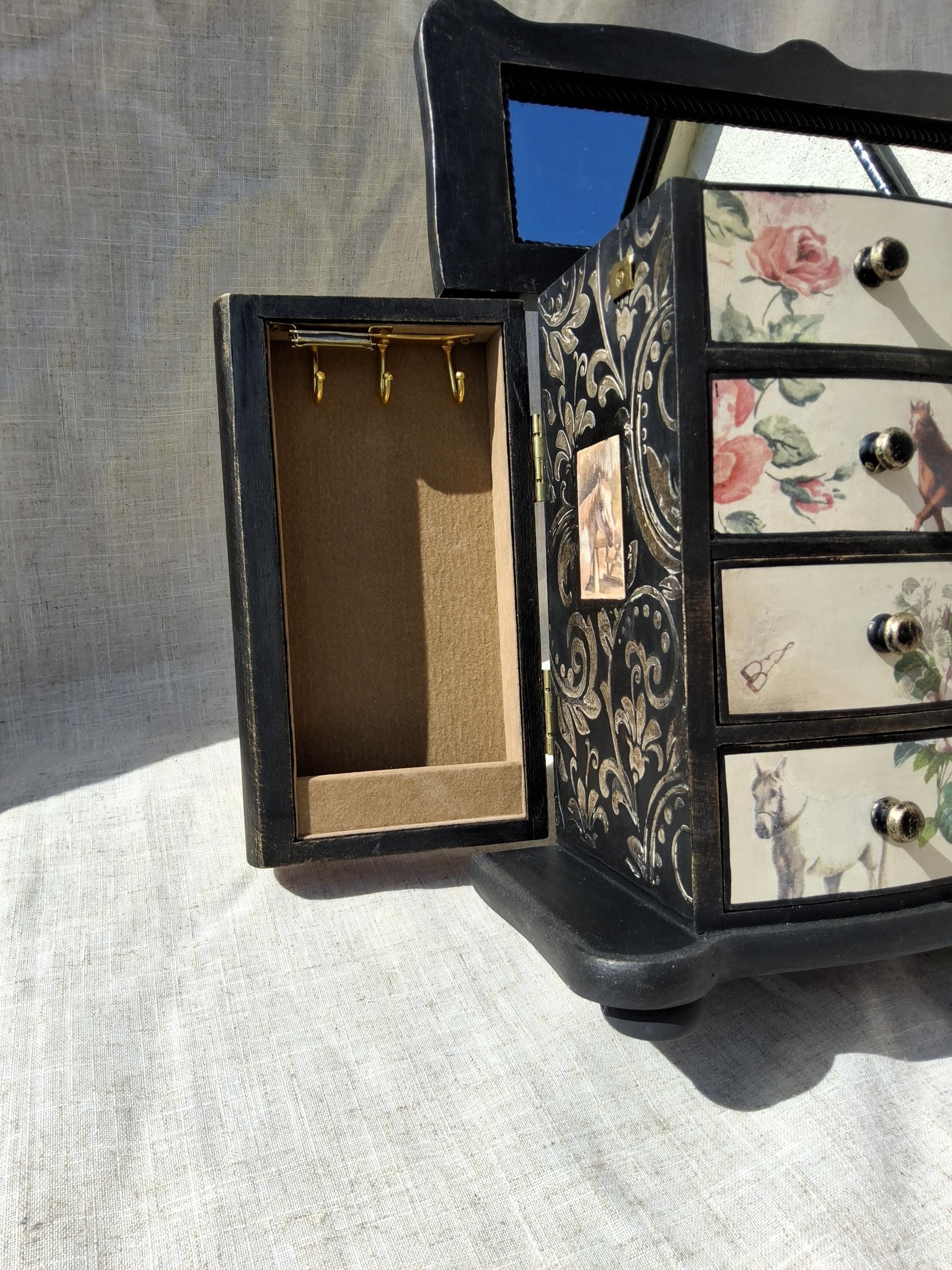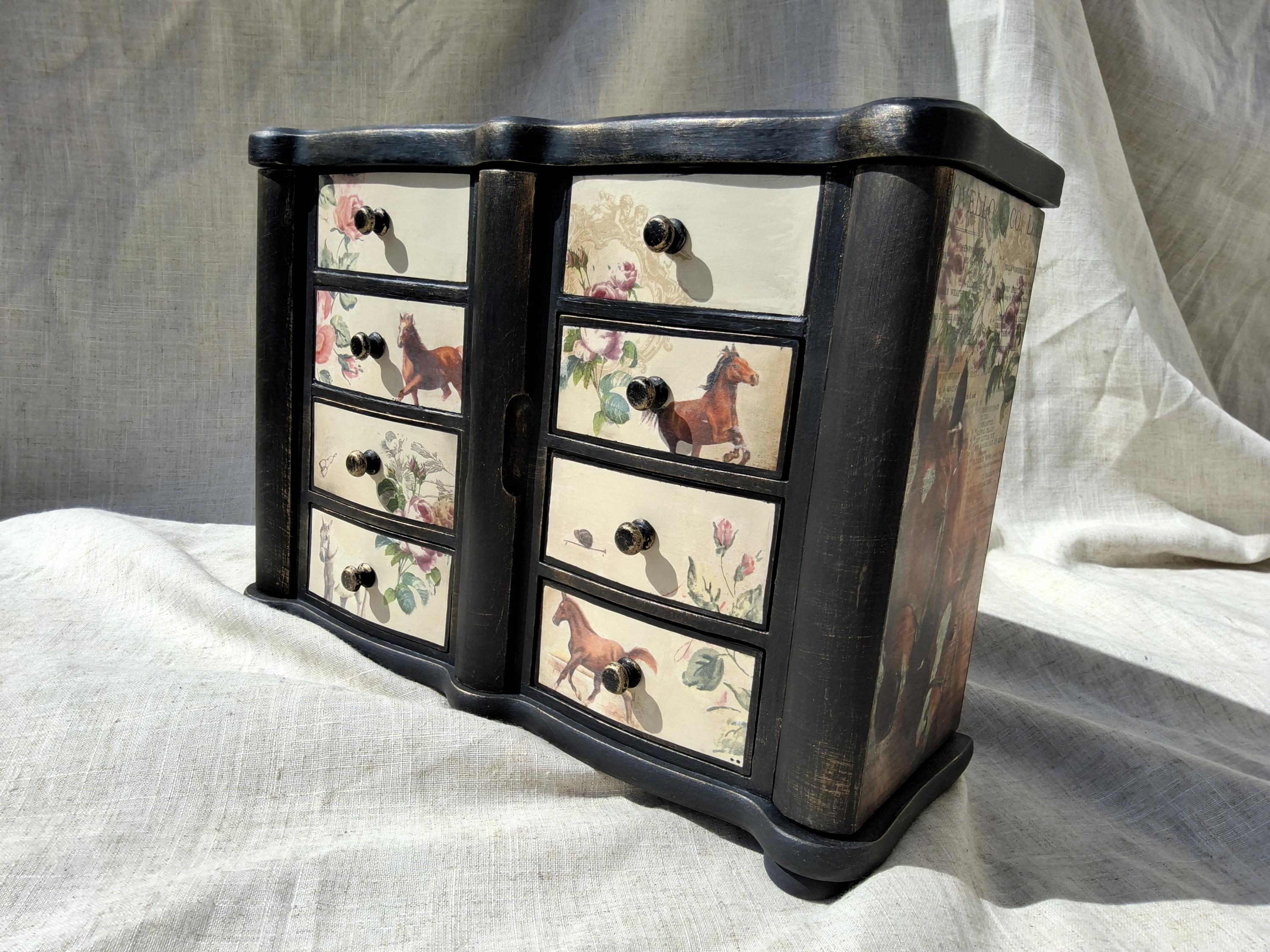 Lovely horse theme large jewellery box,the lid and sides is decorated with vintage music paper and decoupaged horses. the front is decoupaged on cream colour background.