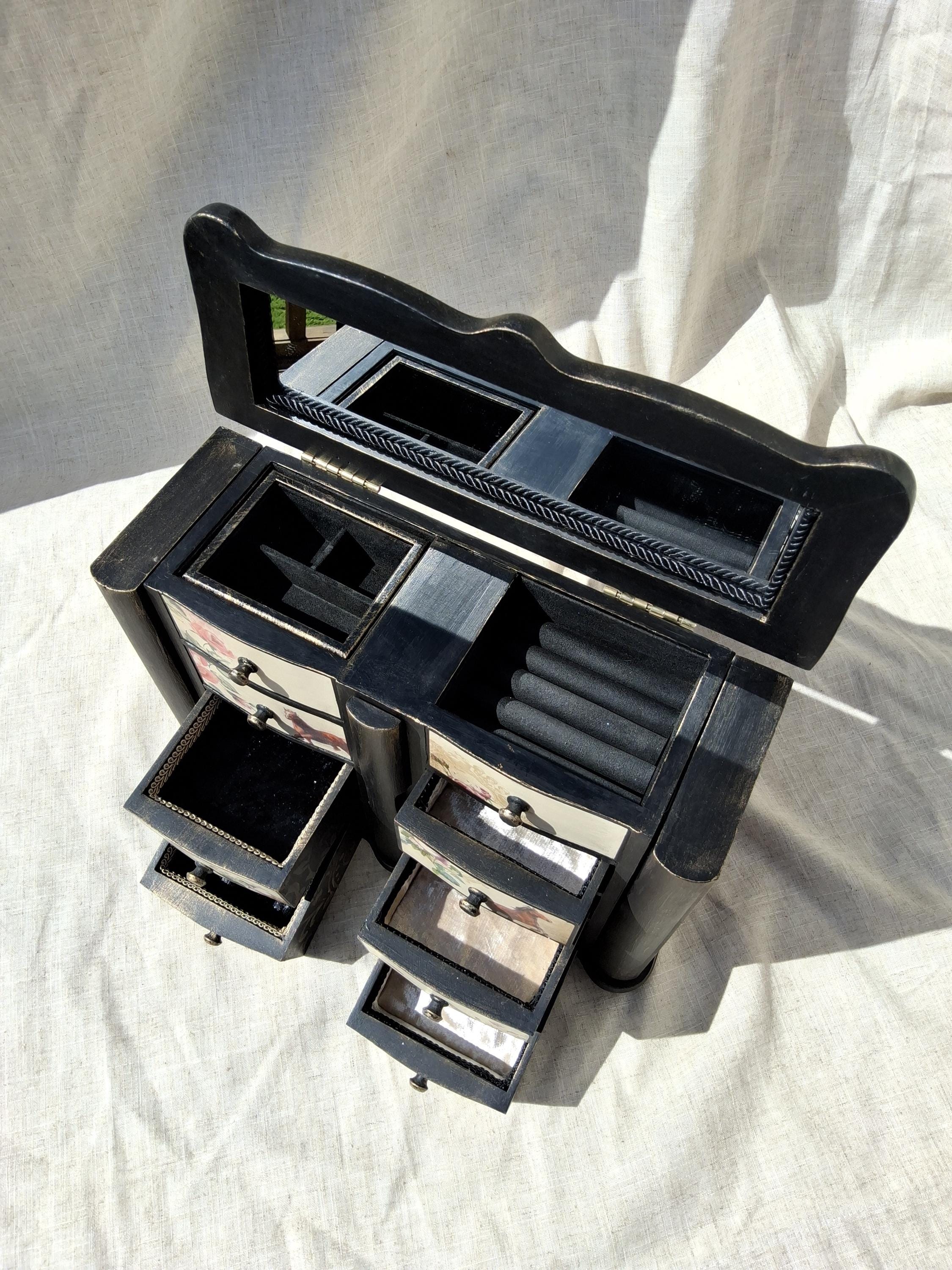 the lid lifts up to reveal a mirror and a storage section. it has 2 doors that reveal necklace storage and also a pull out central storage. original felt in doors but relined everywhere else.