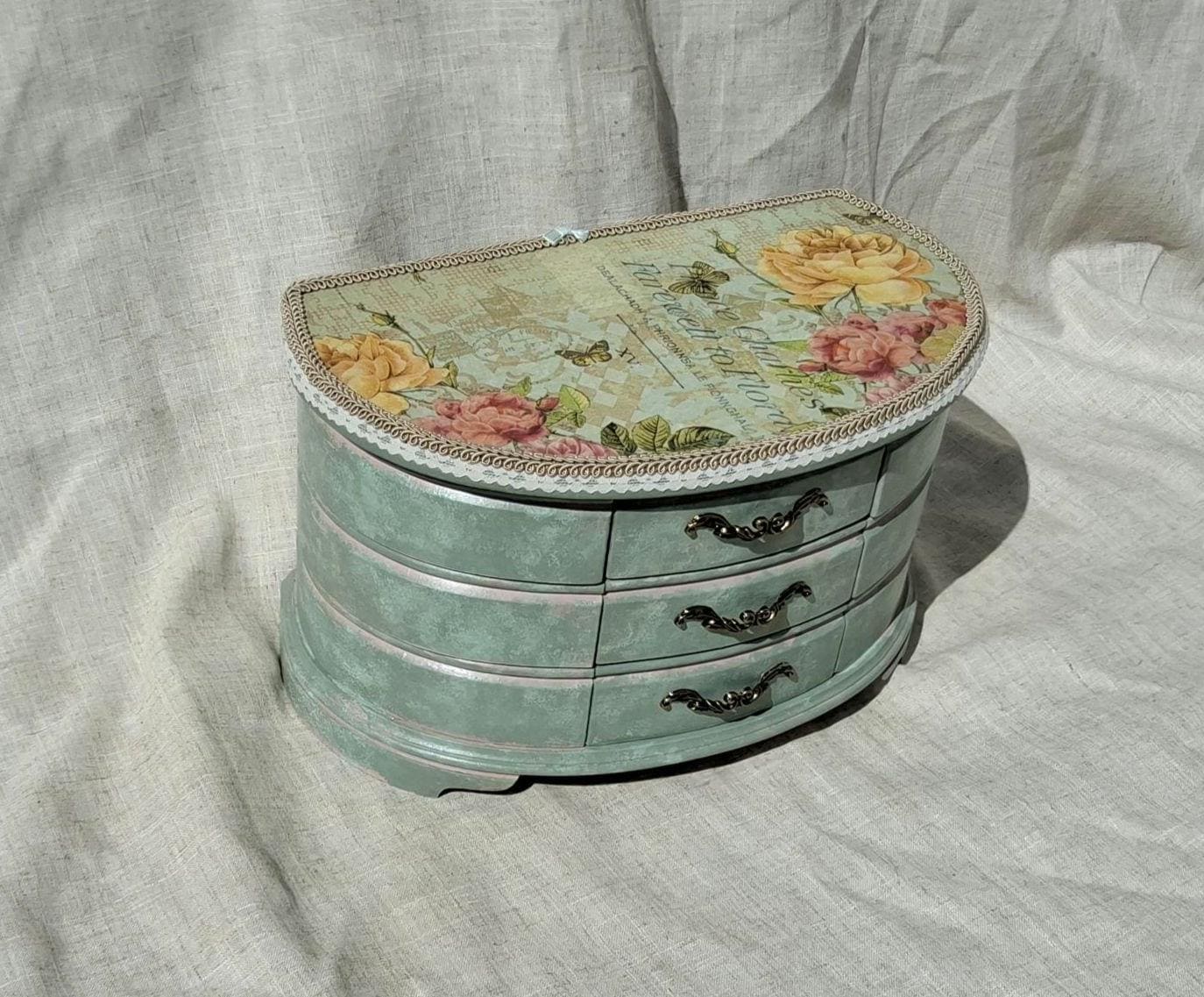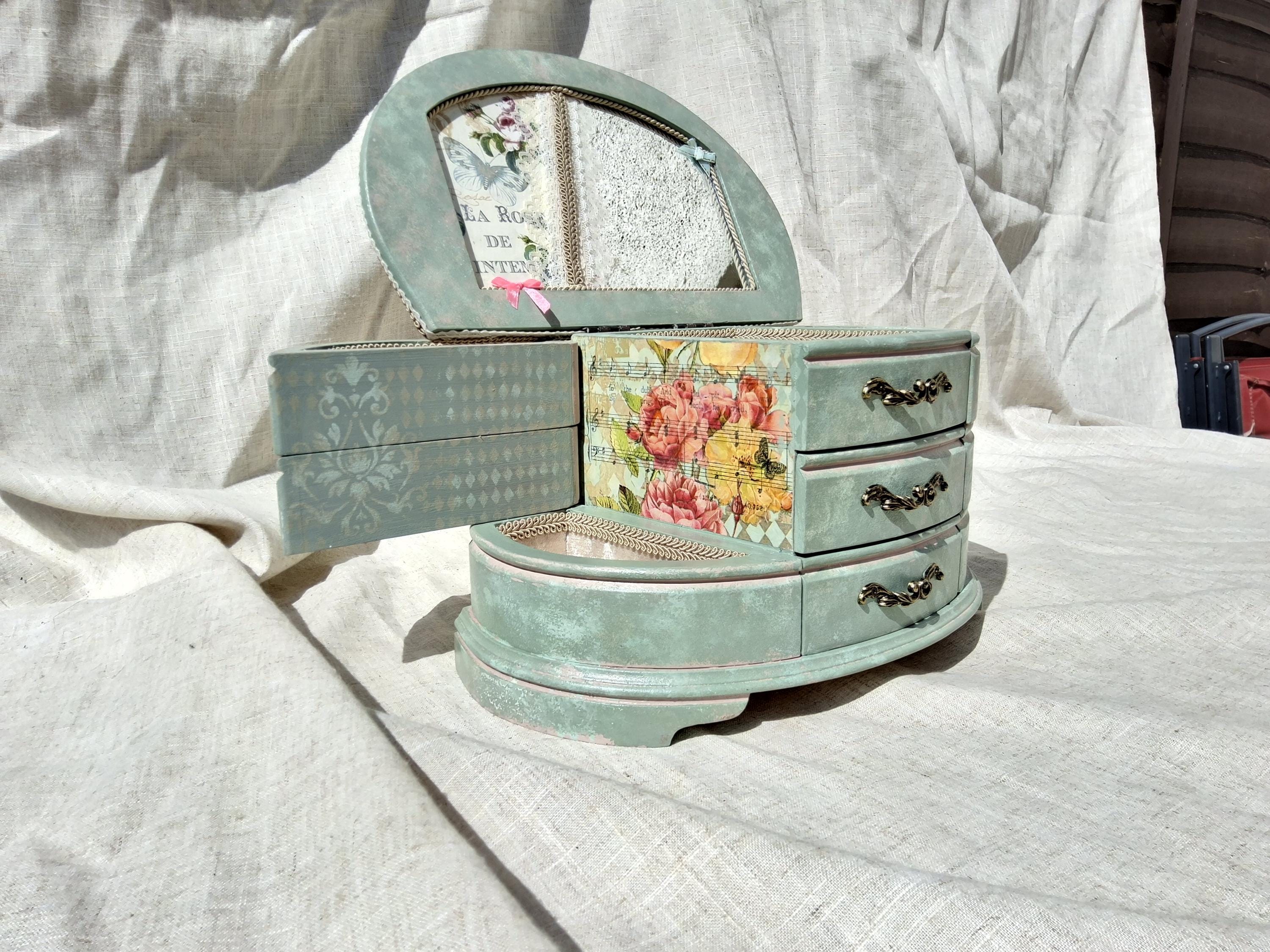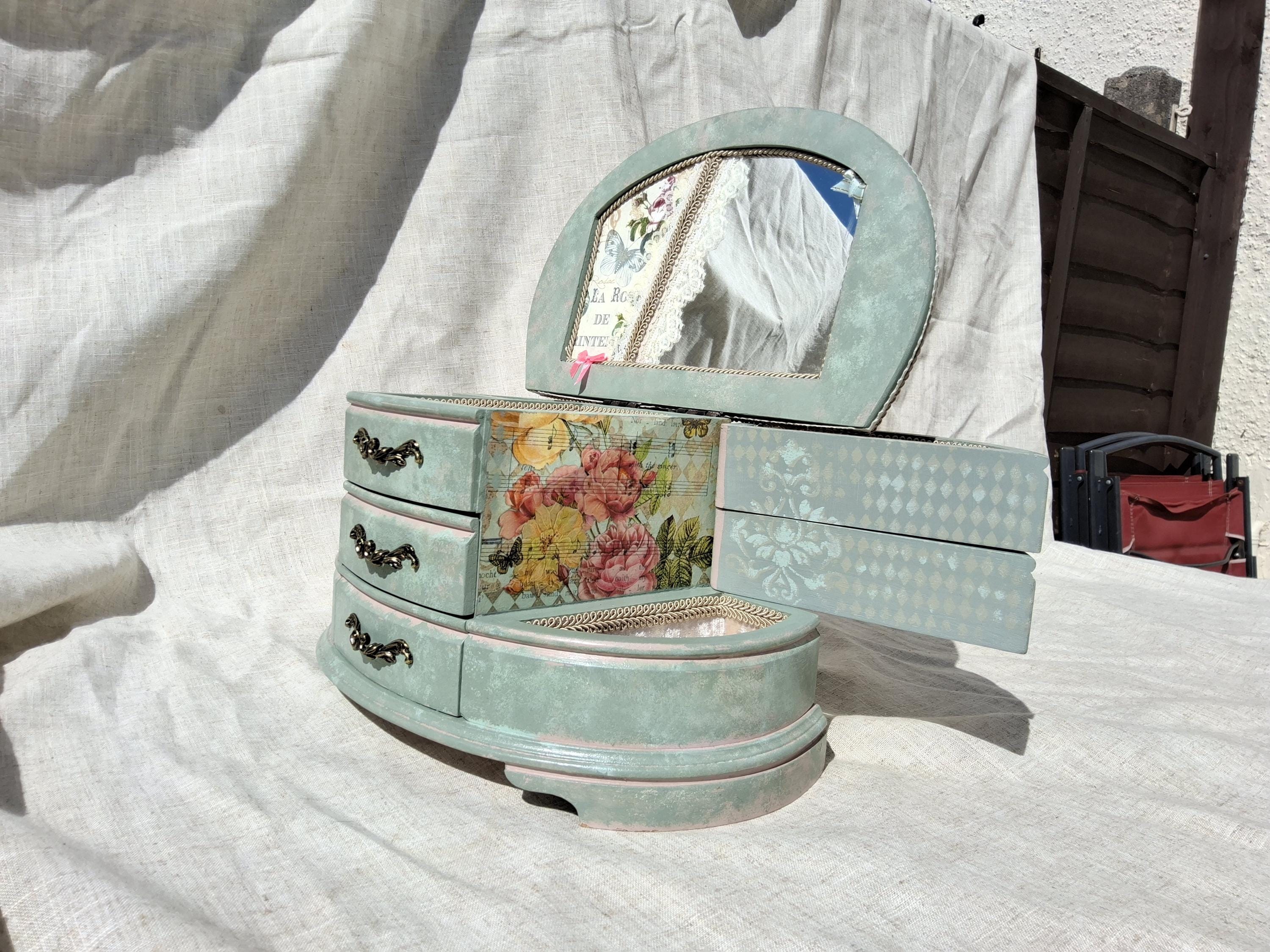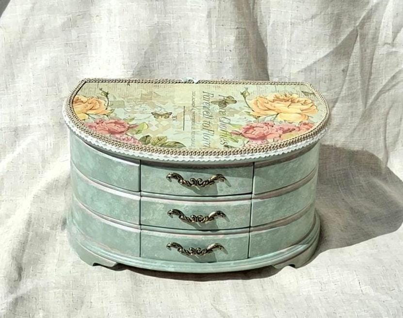 Extra large shabby chic jewellery box hand decorated with decoupage roses painted in mixture of duck egg and pink.