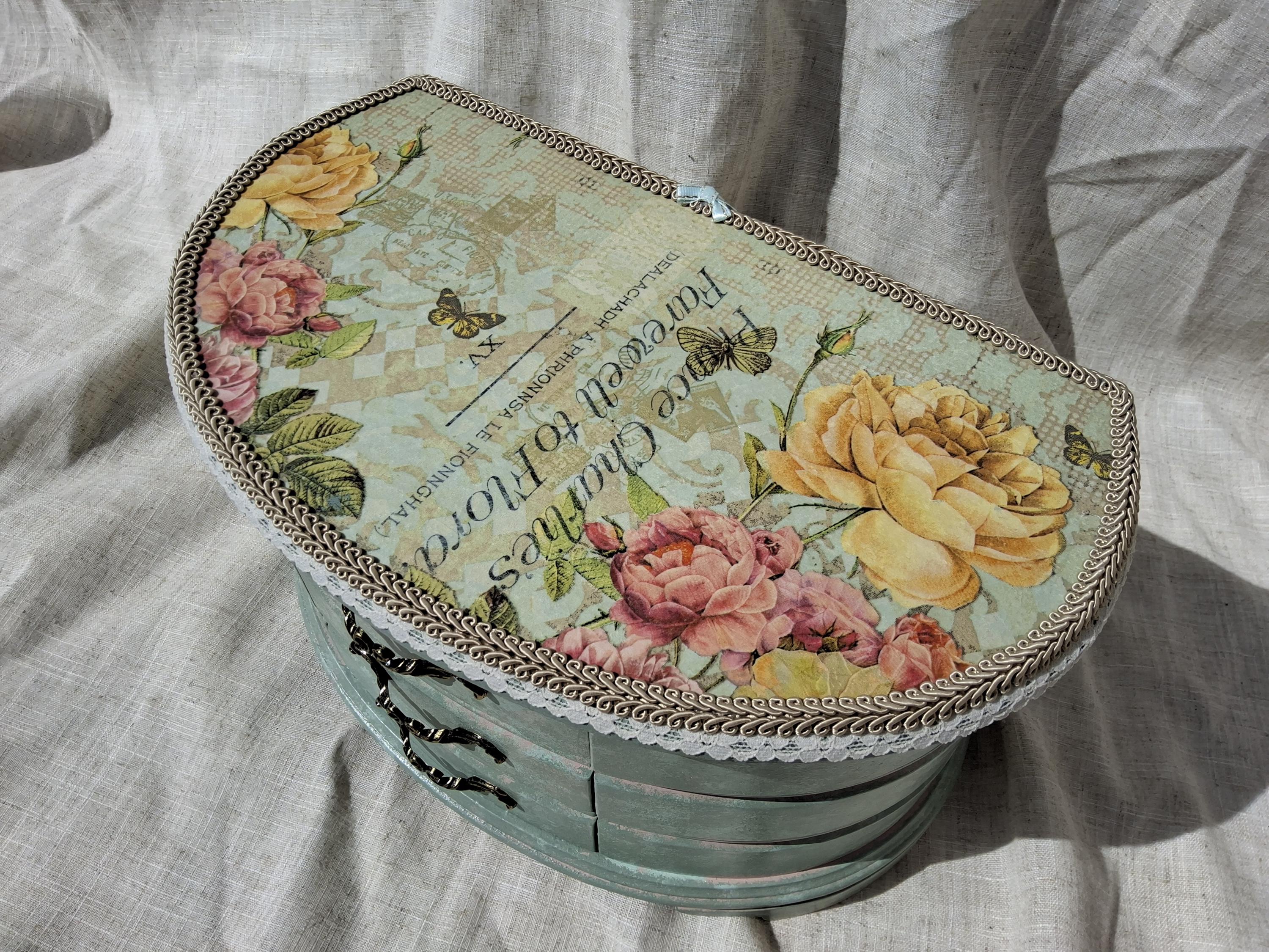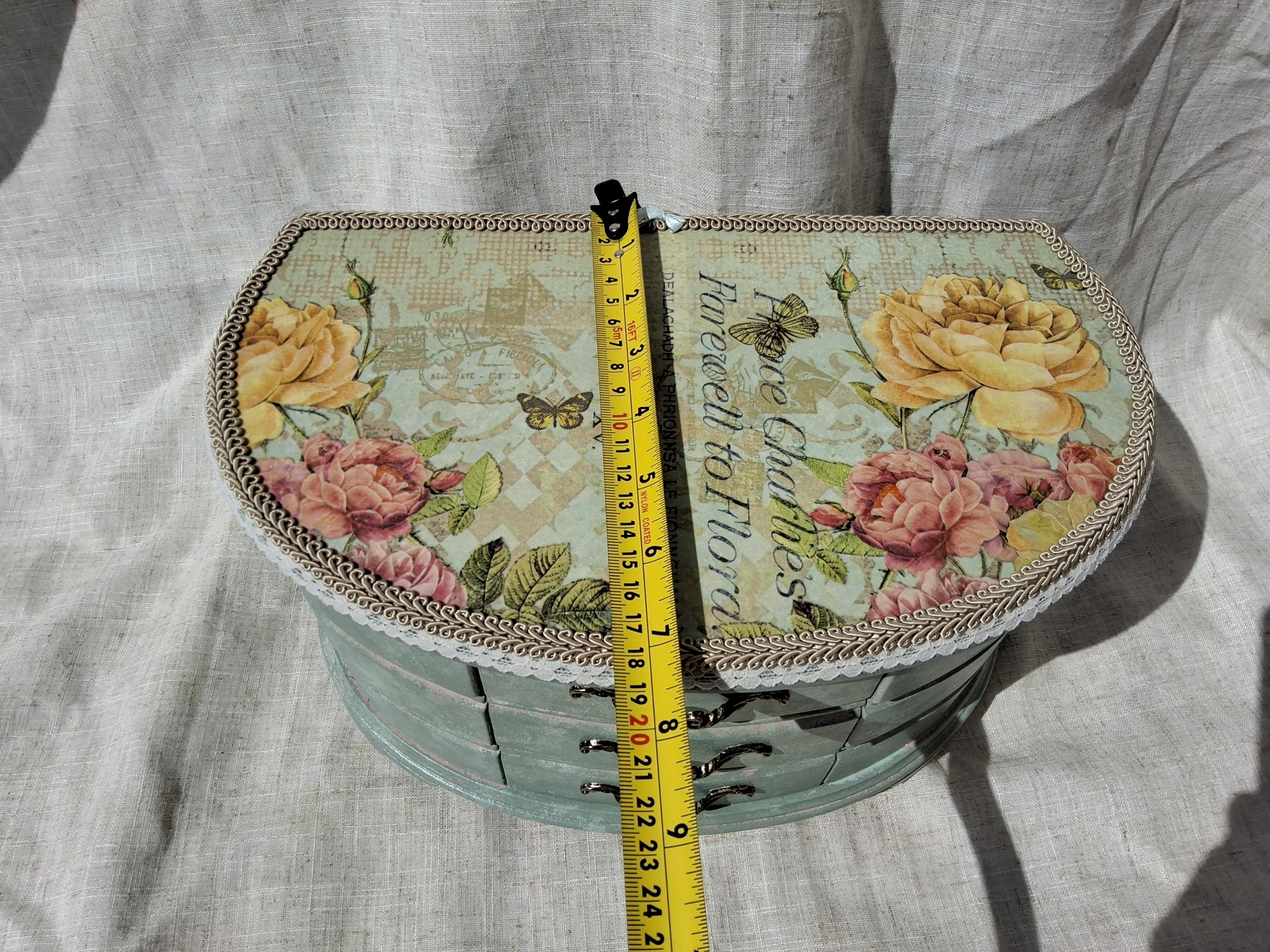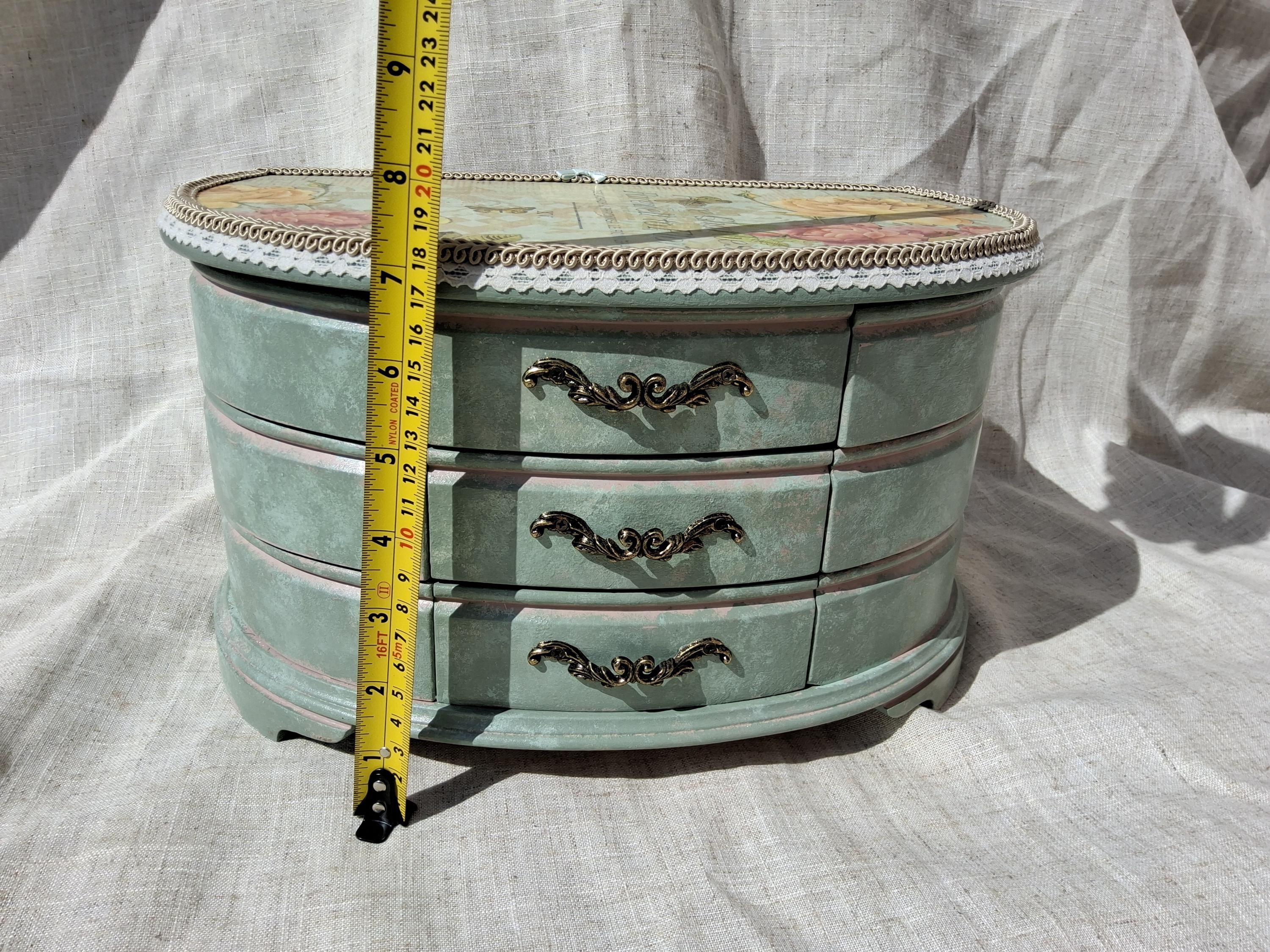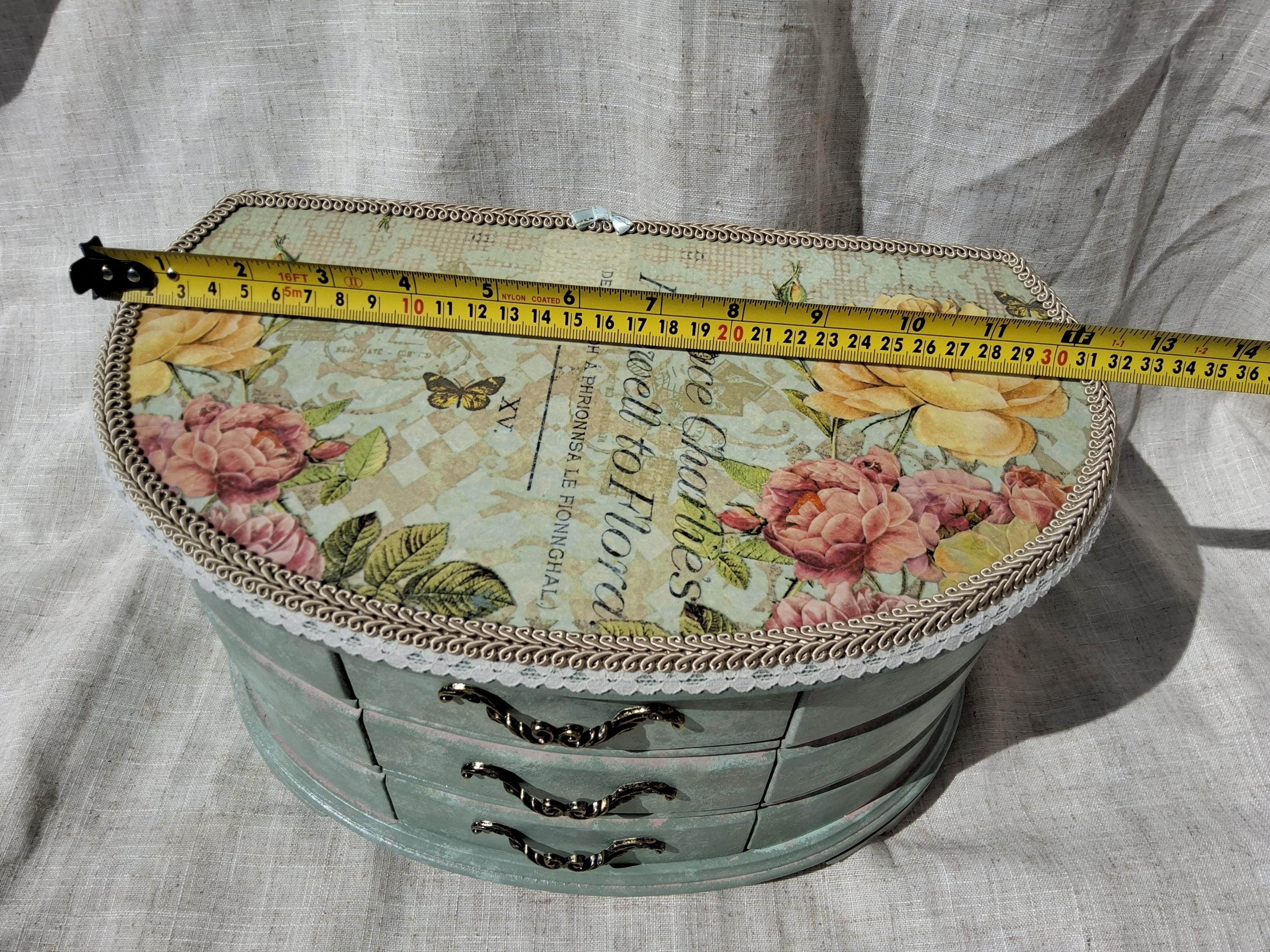 Extra large shabby chic jewellery box hand decorated with decoupage roses painted in mixture of duck egg and pink.