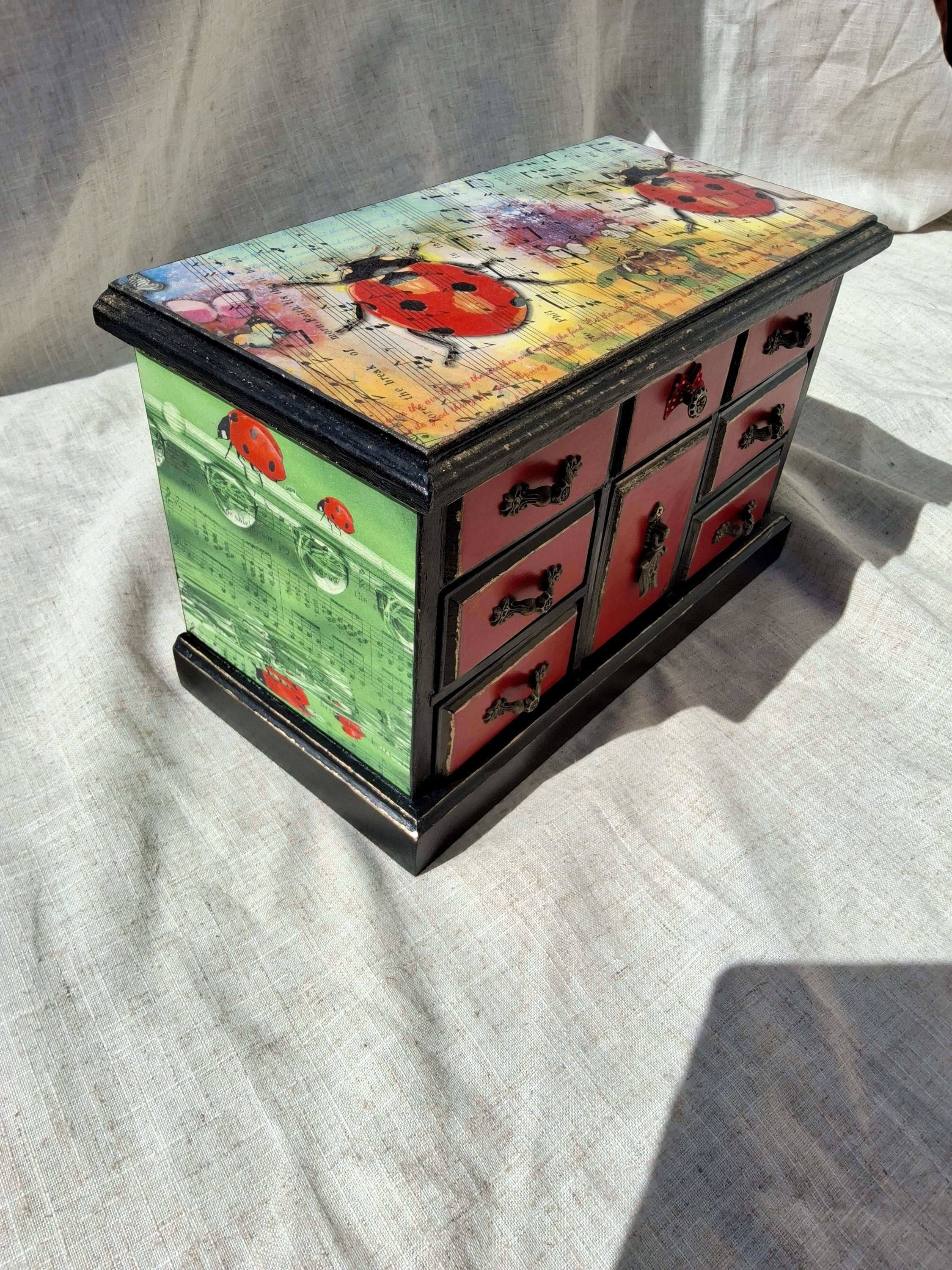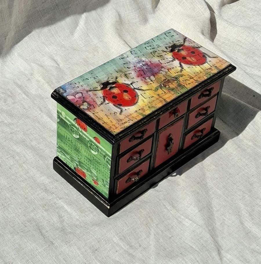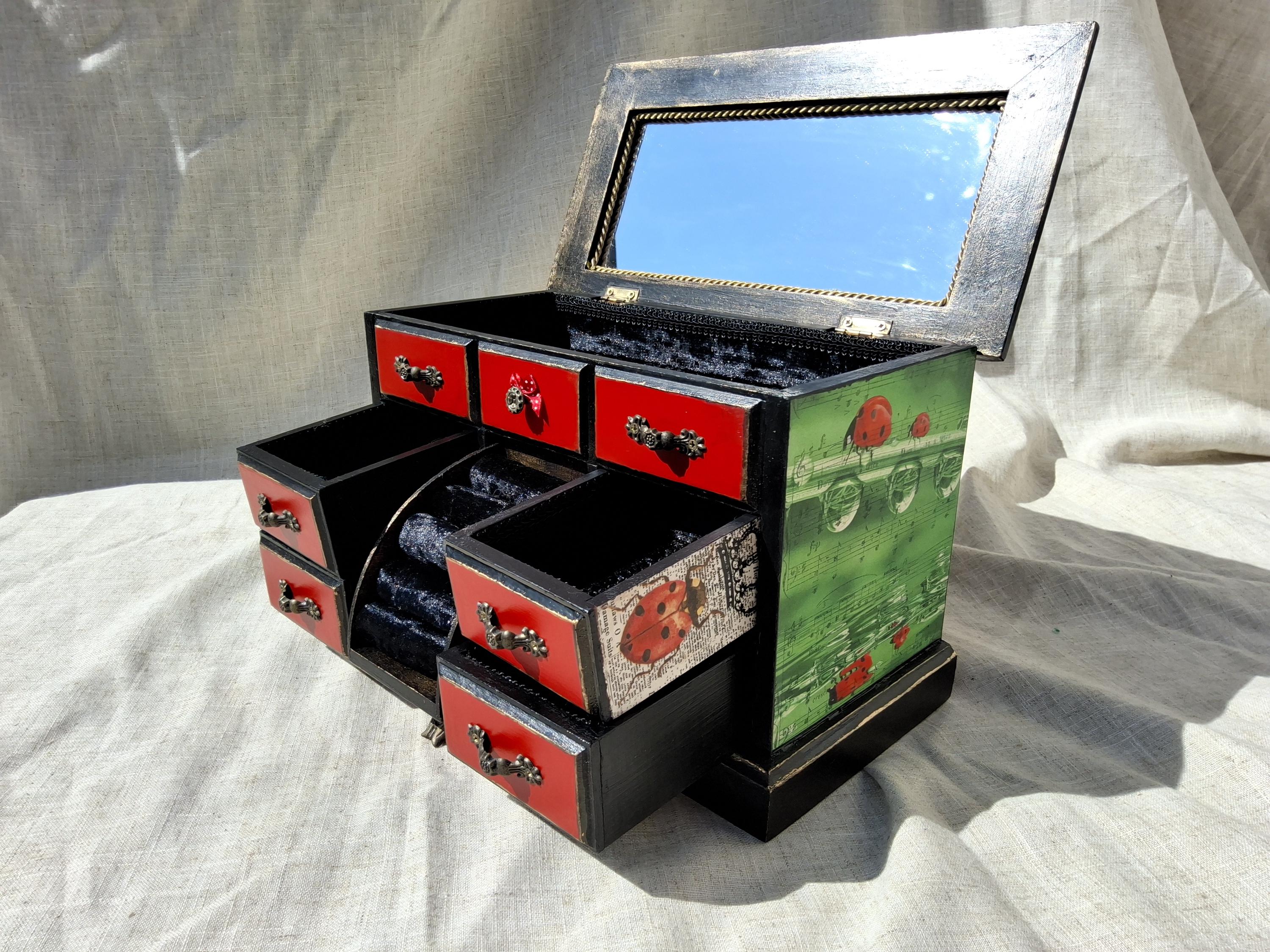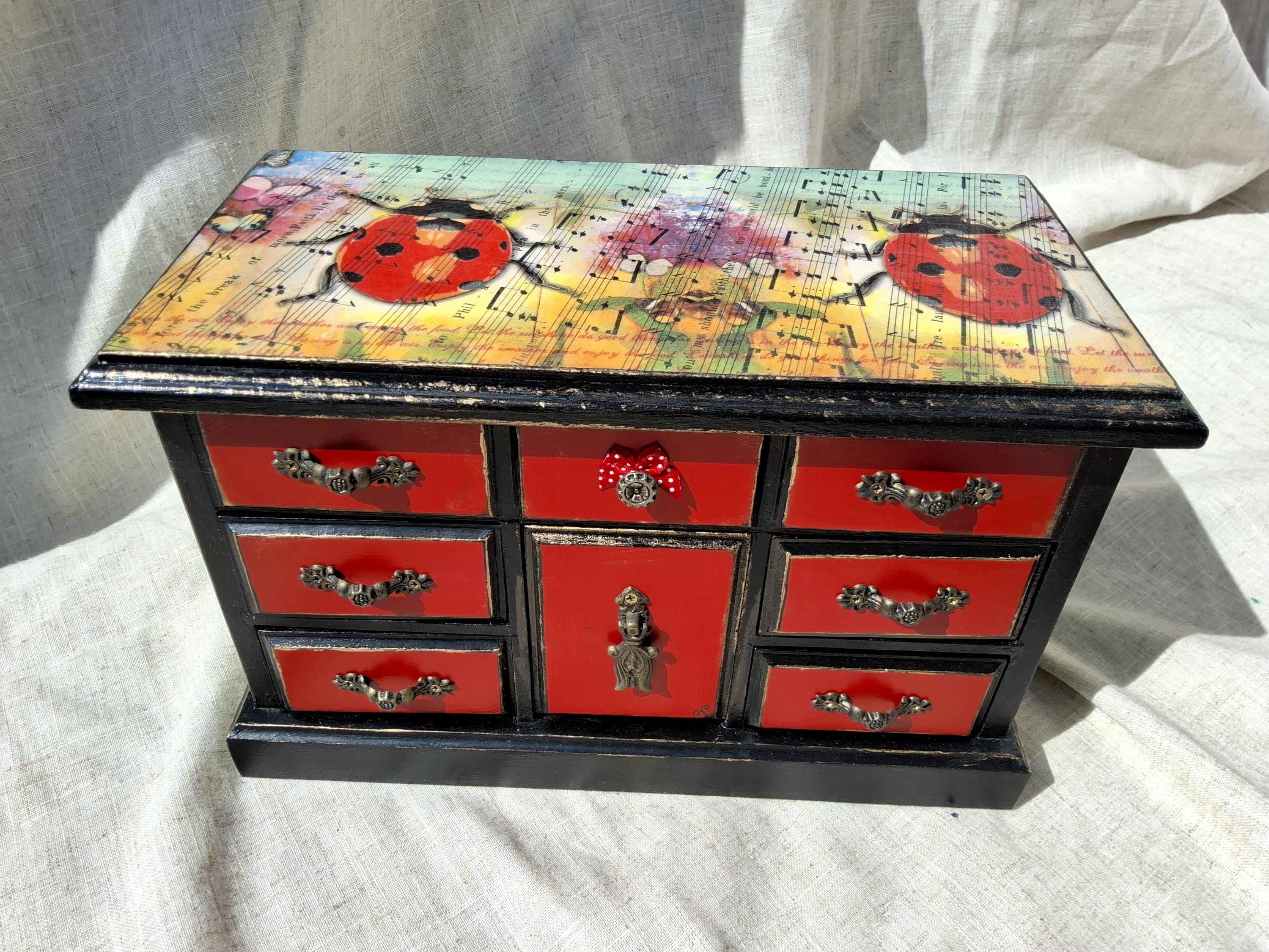Lovely ladybird theme handmade vintage jewellery box hand painted in a black and vibrant red and distressed gold highlights,also decoupaged top and sides,with a lift up lid and pull out ring holders and drawers.
