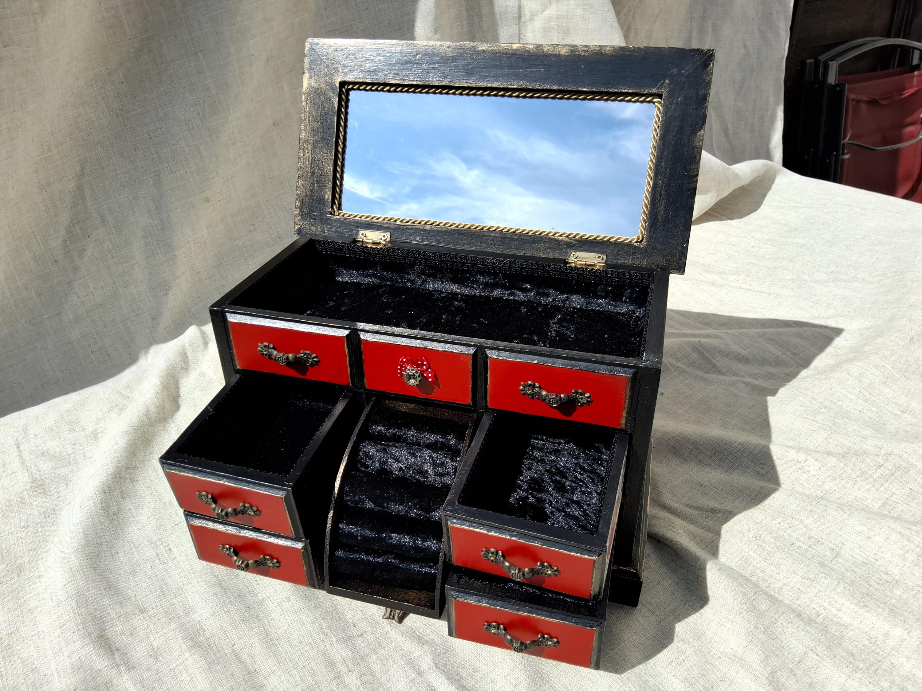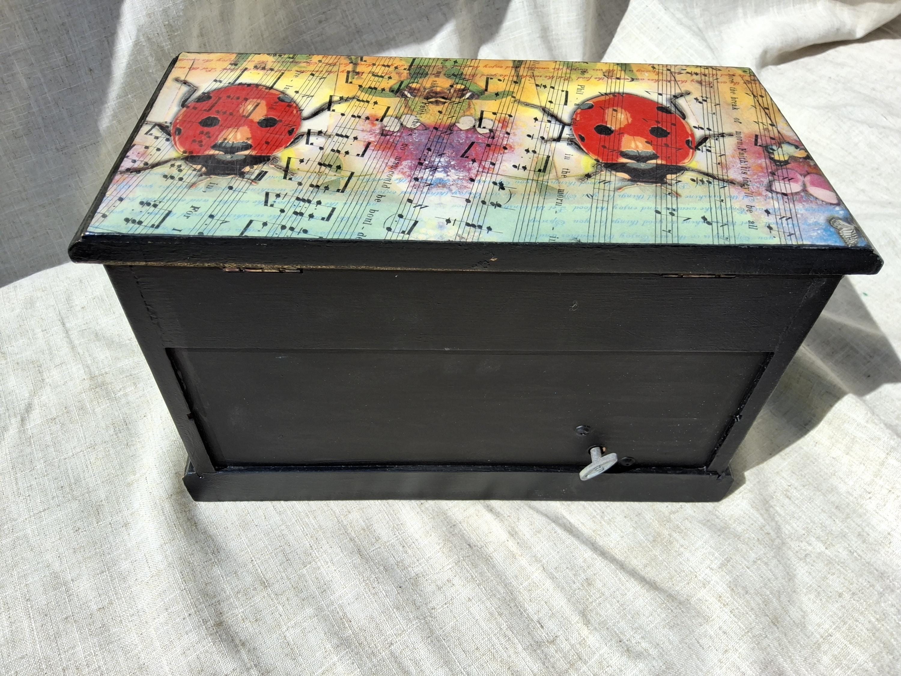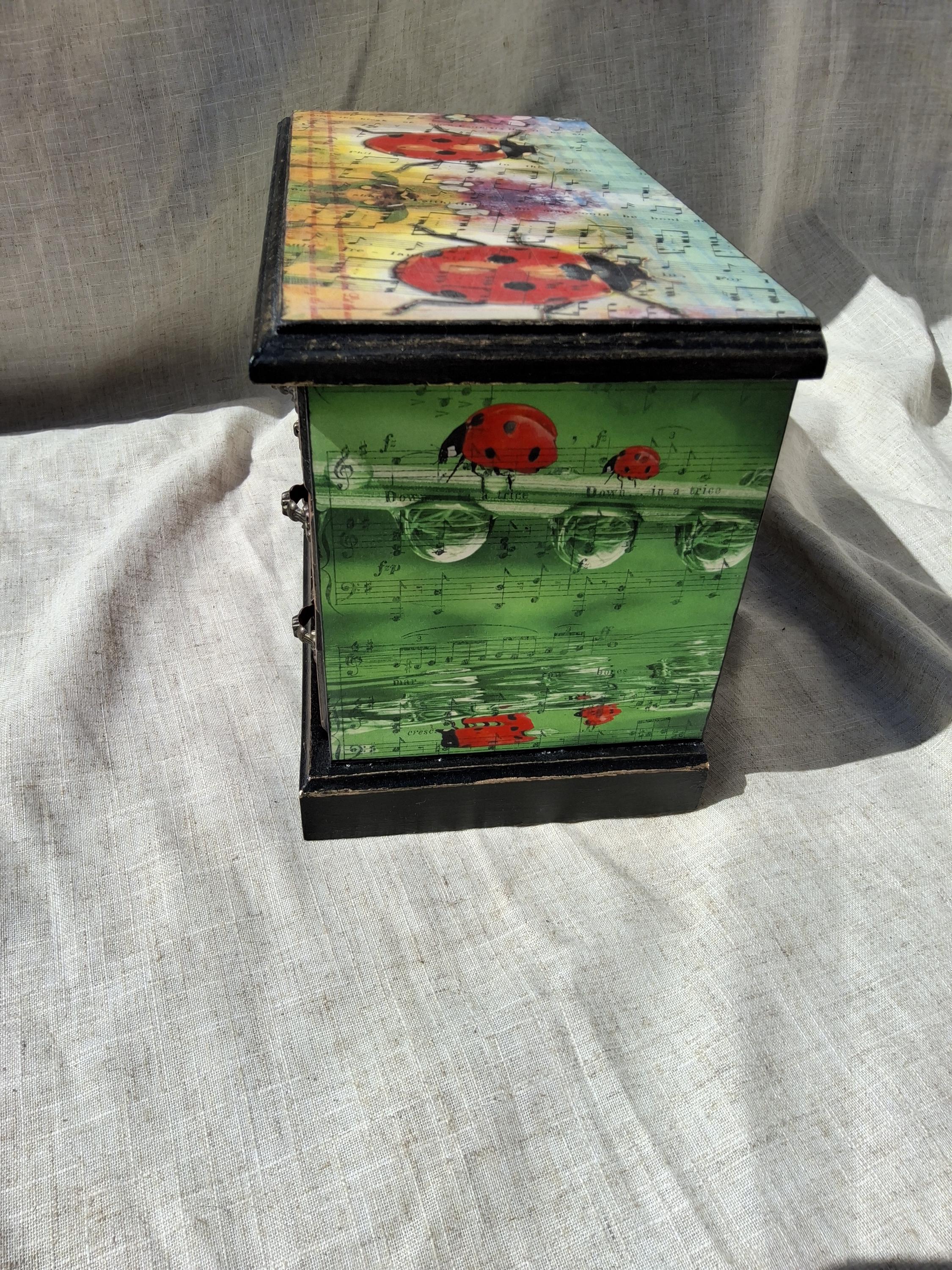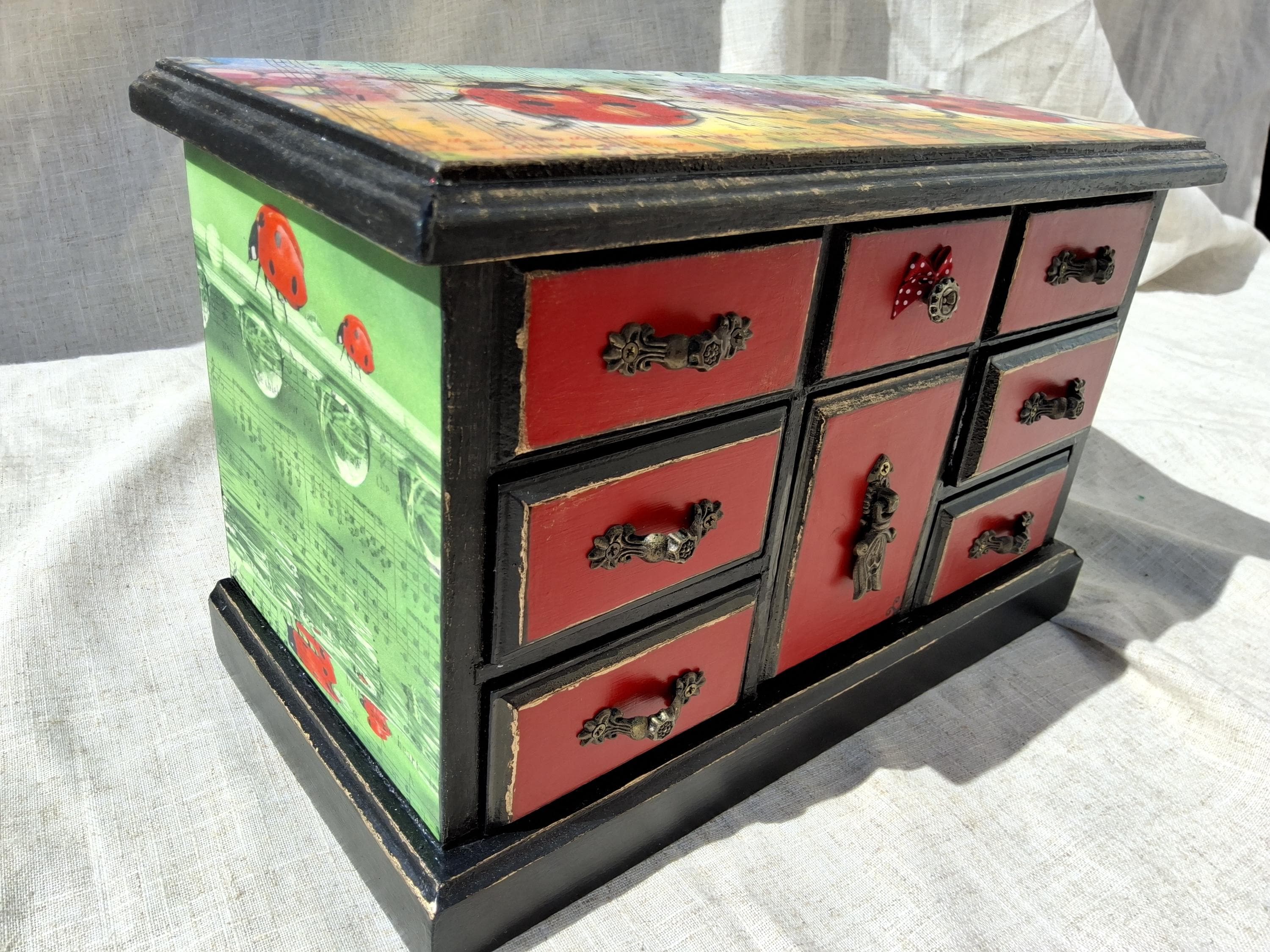 Lovely ladybird theme handmade vintage jewellery box hand painted in a black and vibrant red and distressed gold highlights,also decoupaged top and sides,with a lift up lid and pull out ring holders and drawers.
