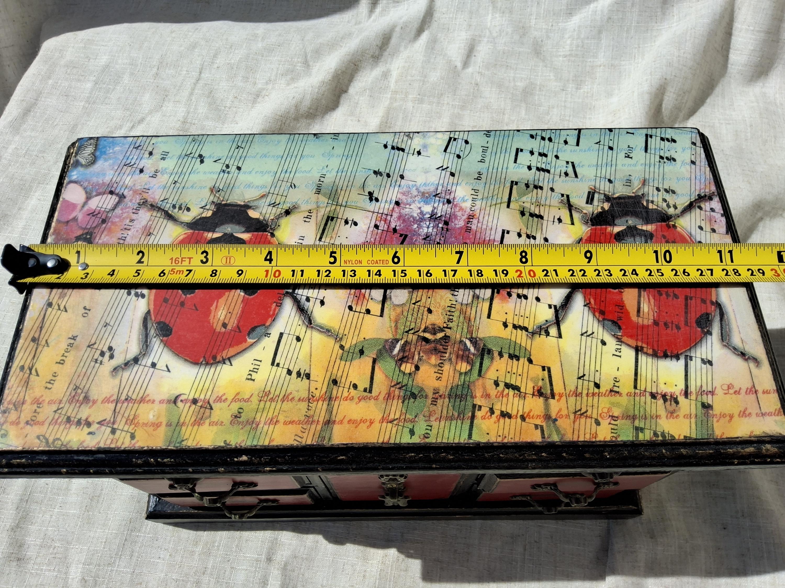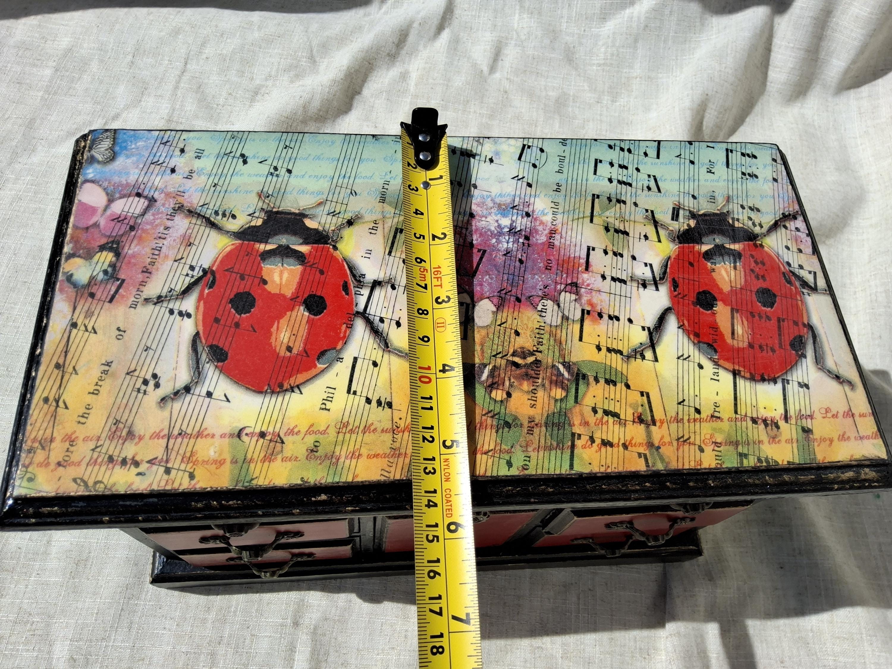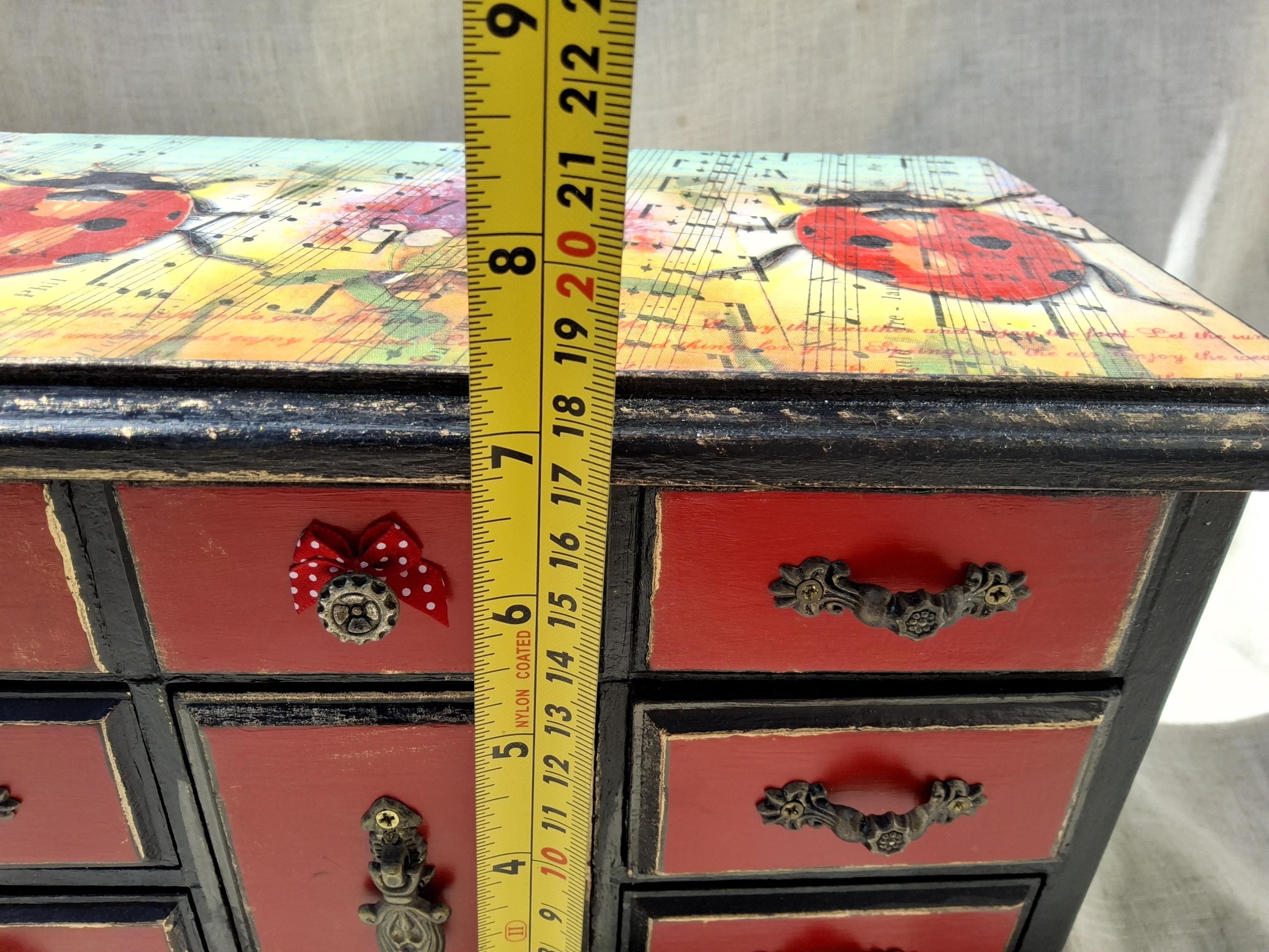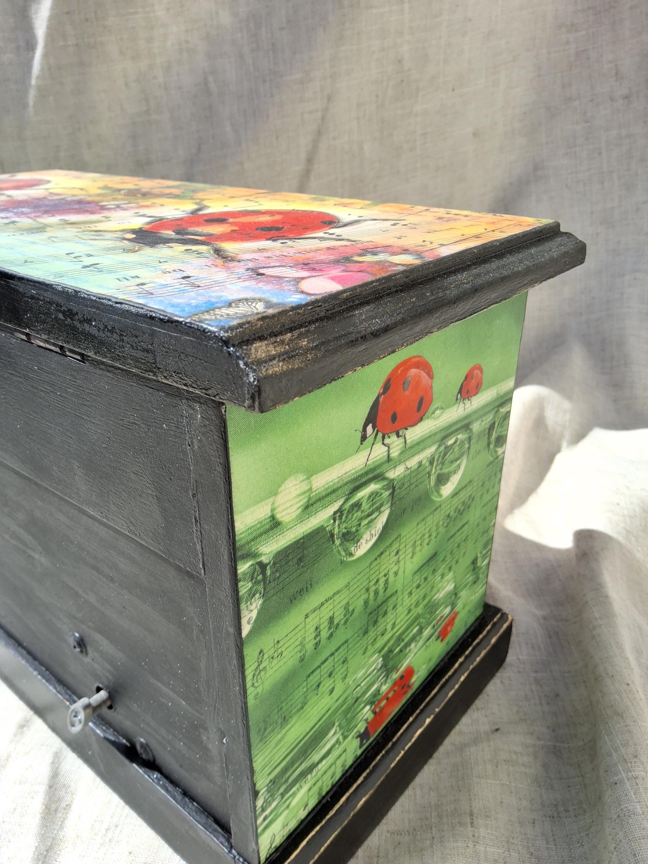 Lovely ladybird theme handmade vintage jewellery box hand painted in a black and vibrant red and distressed gold highlights,also decoupaged top and sides,with a lift up lid and pull out ring holders and drawers.