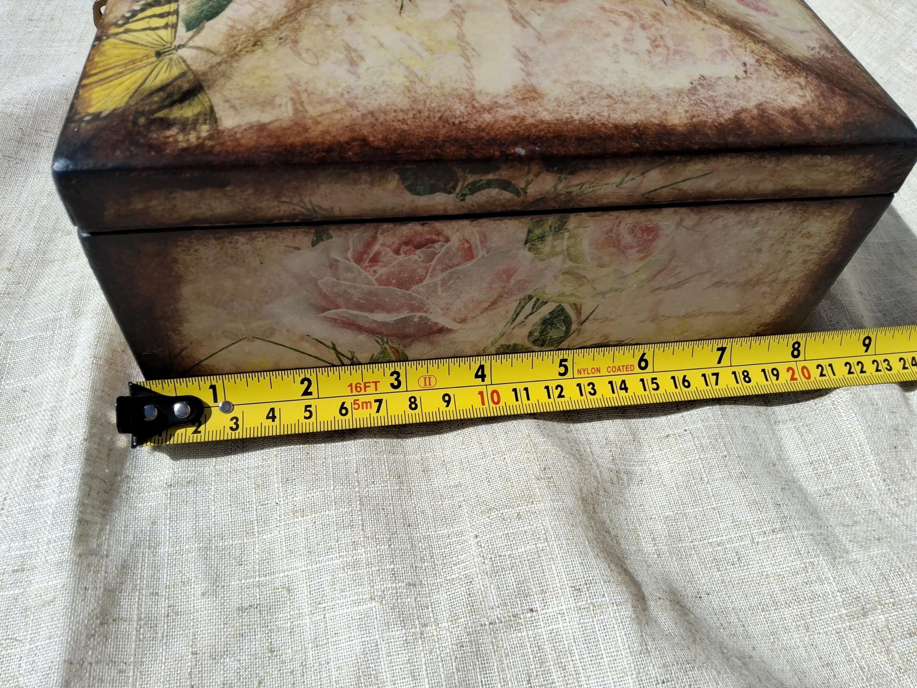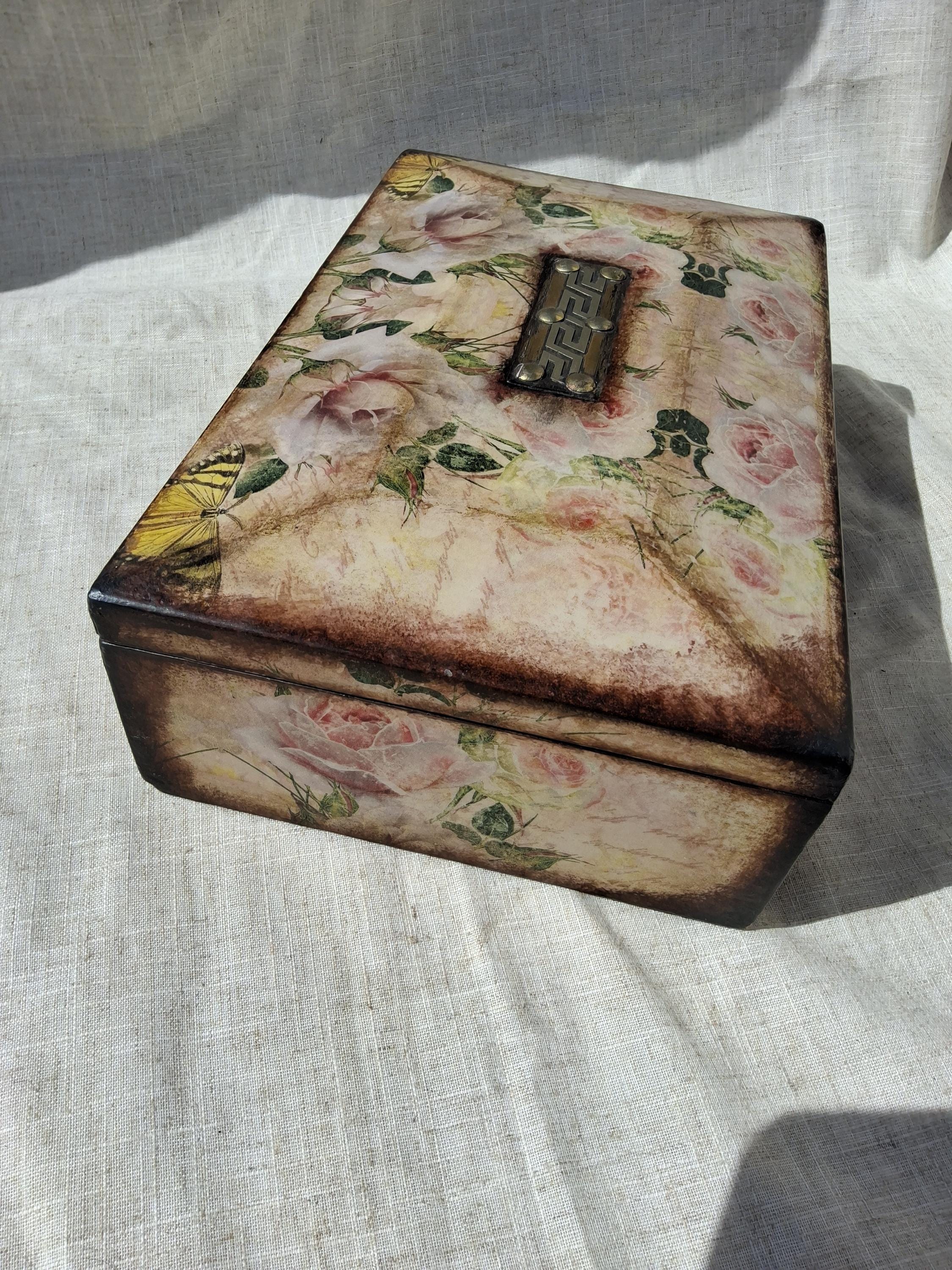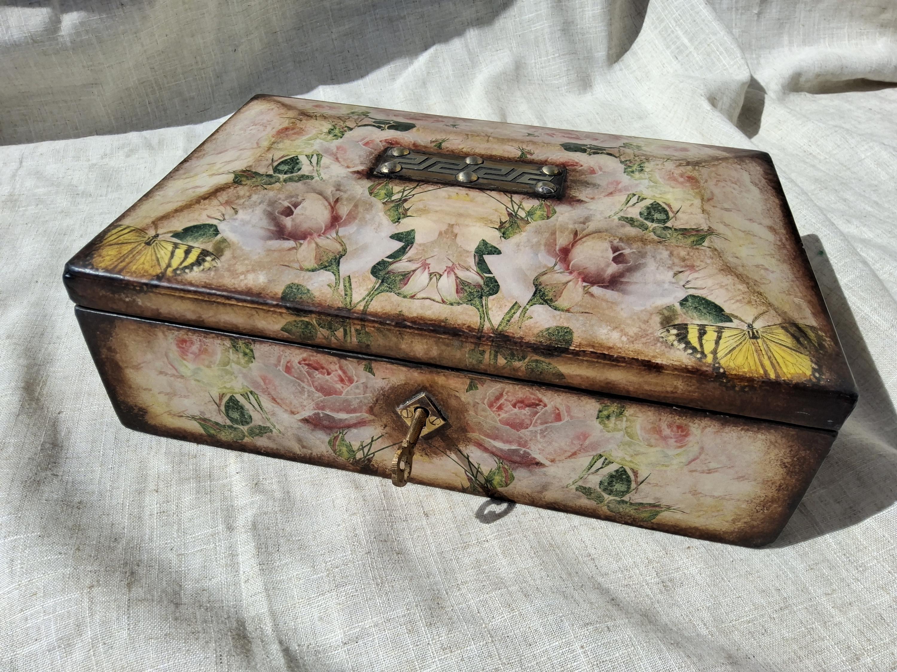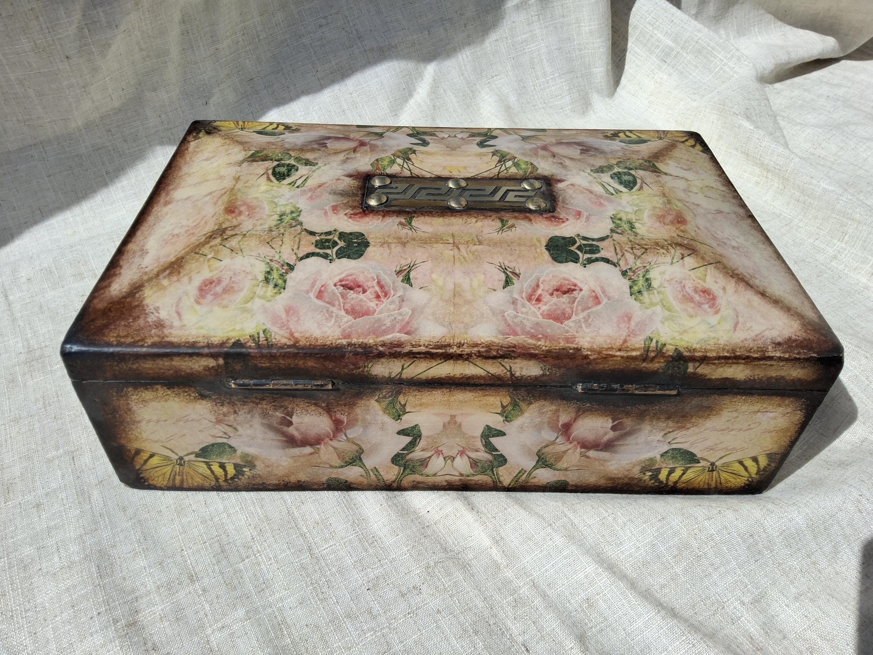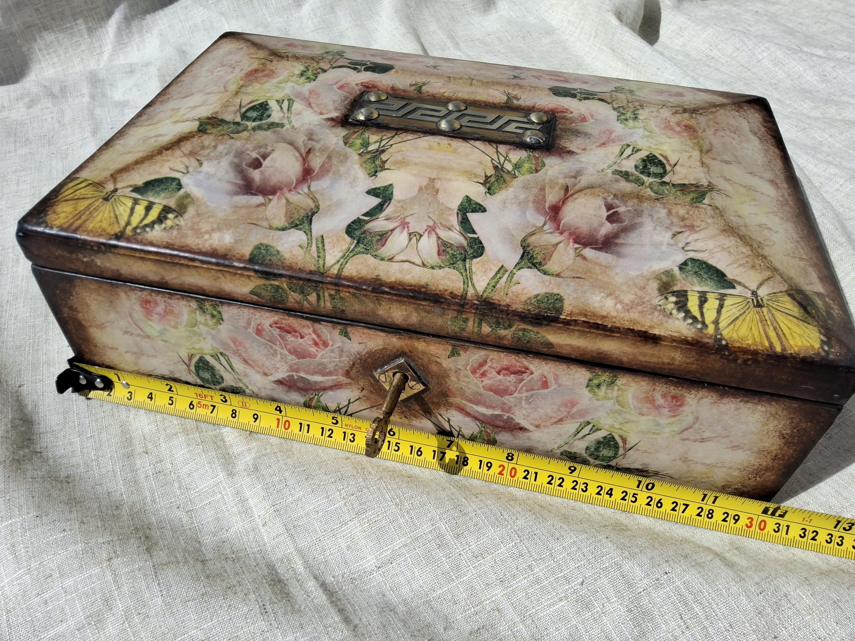 Lovely vintage theme slight rectangle domed chest vintage jewellery box decoupaged with matt finish an aged effect.