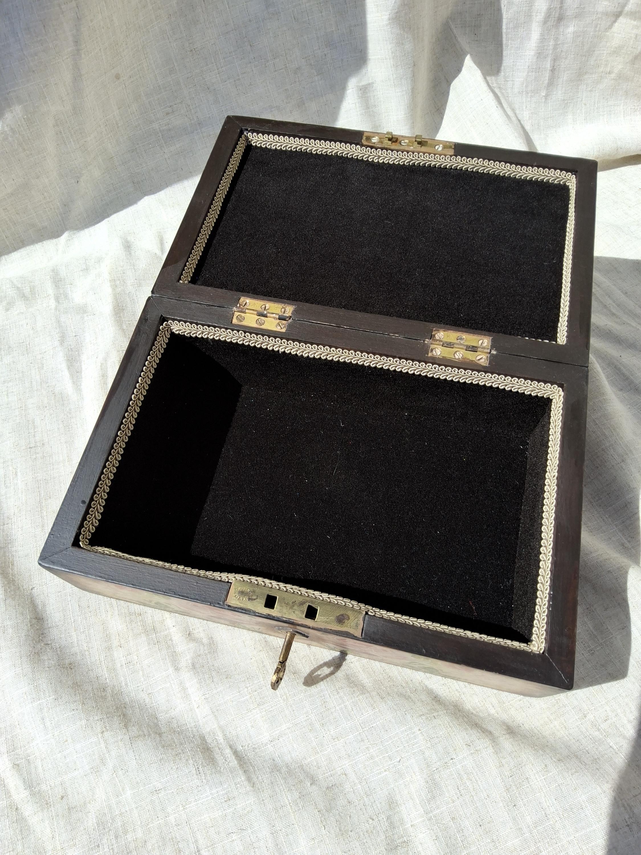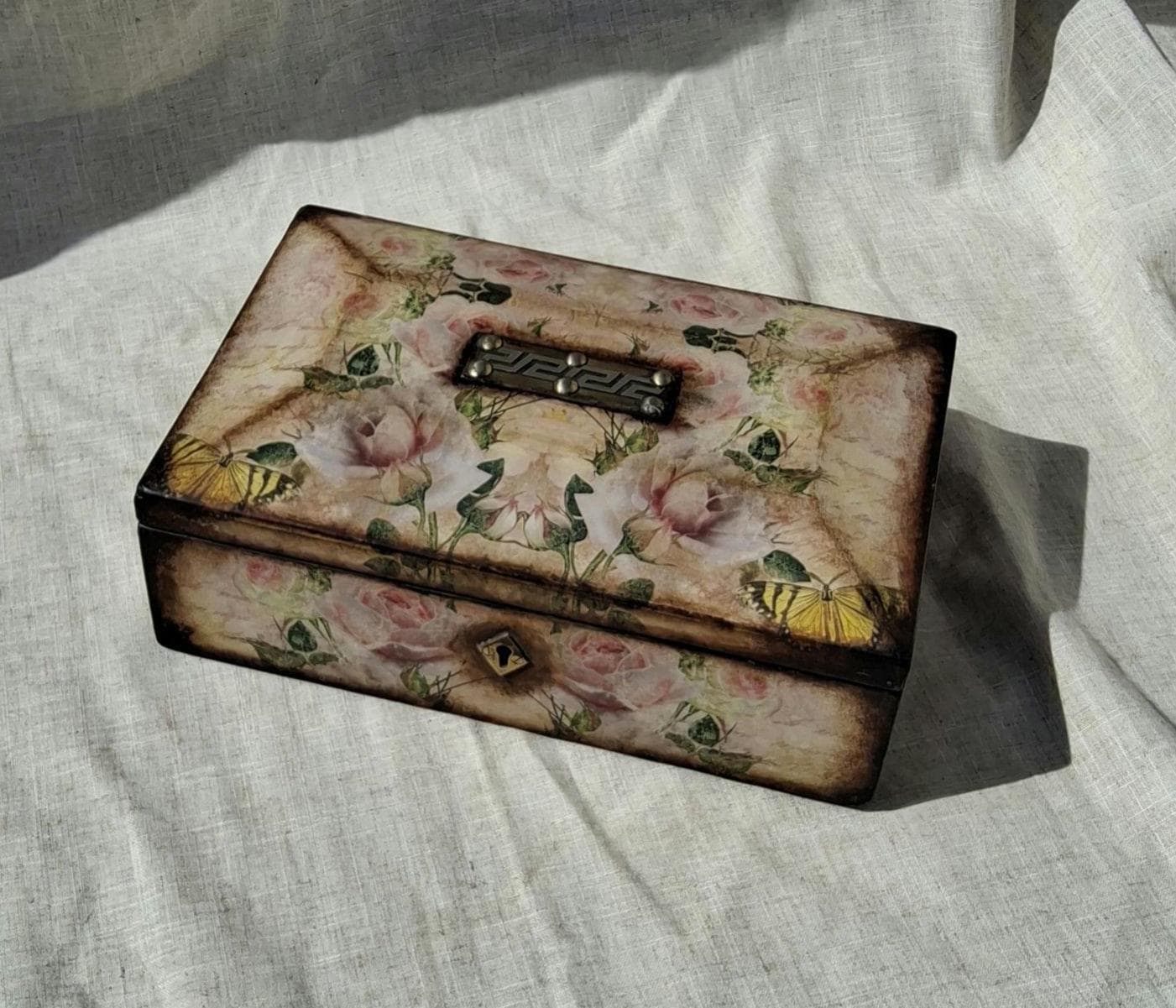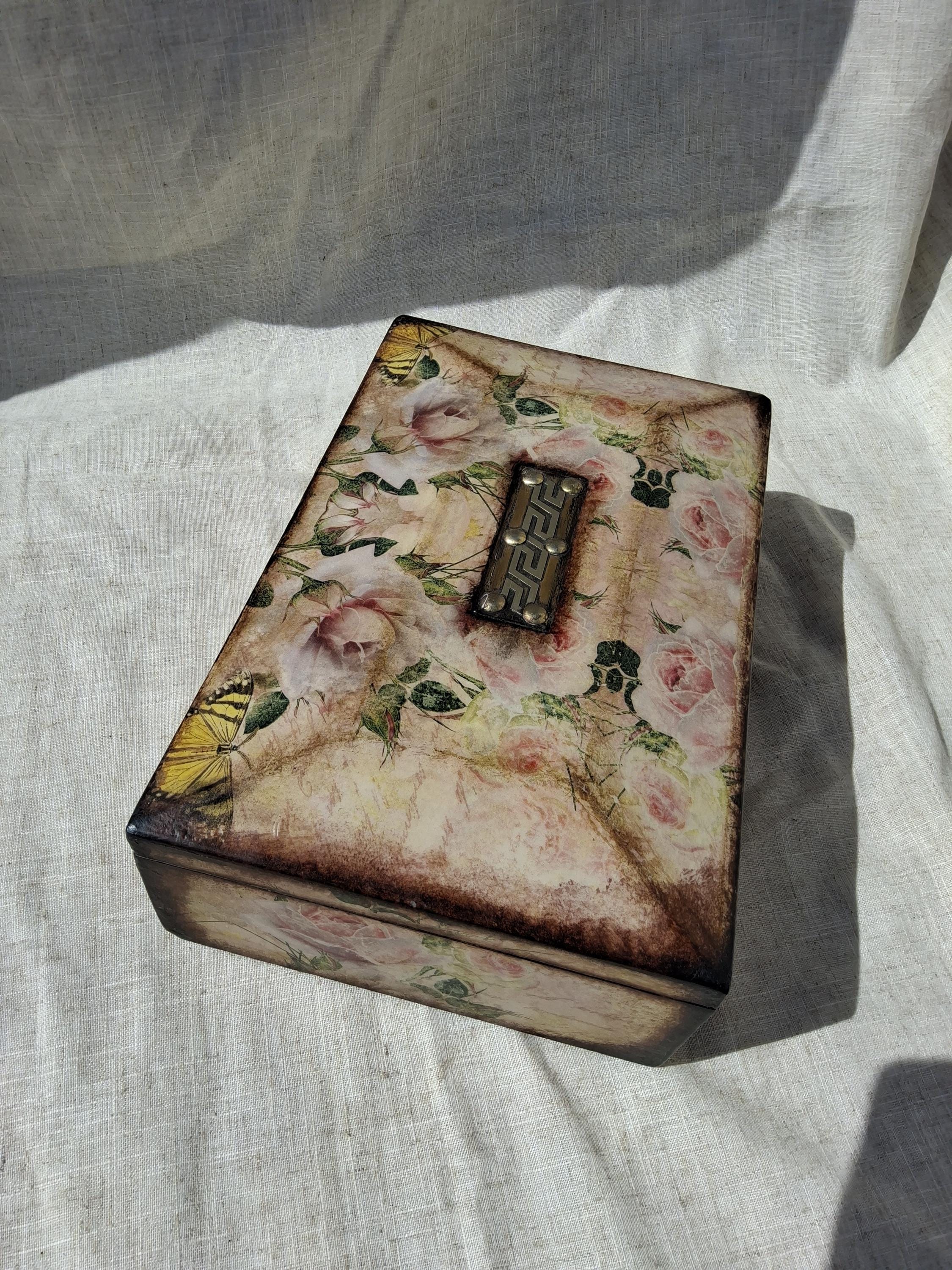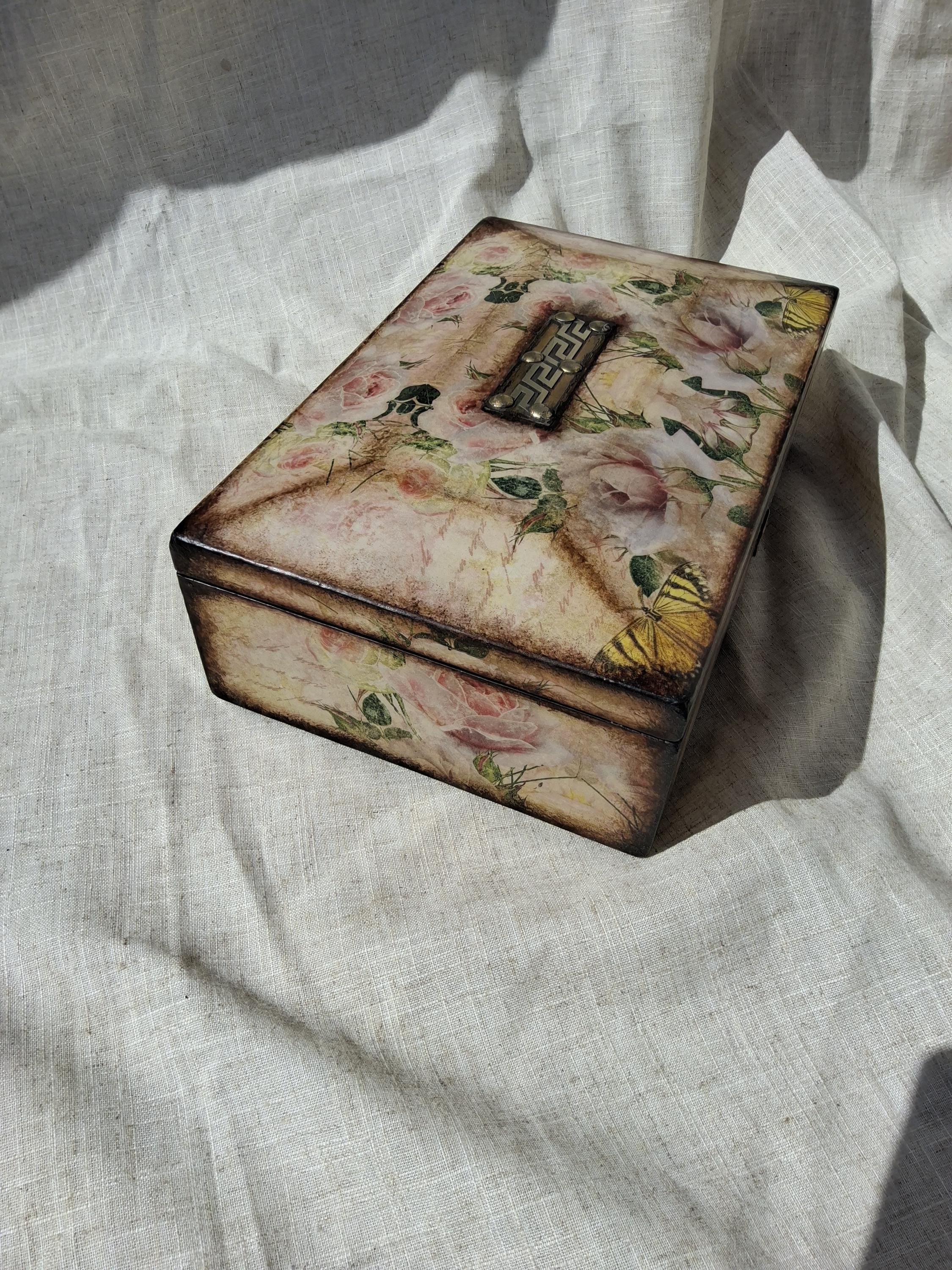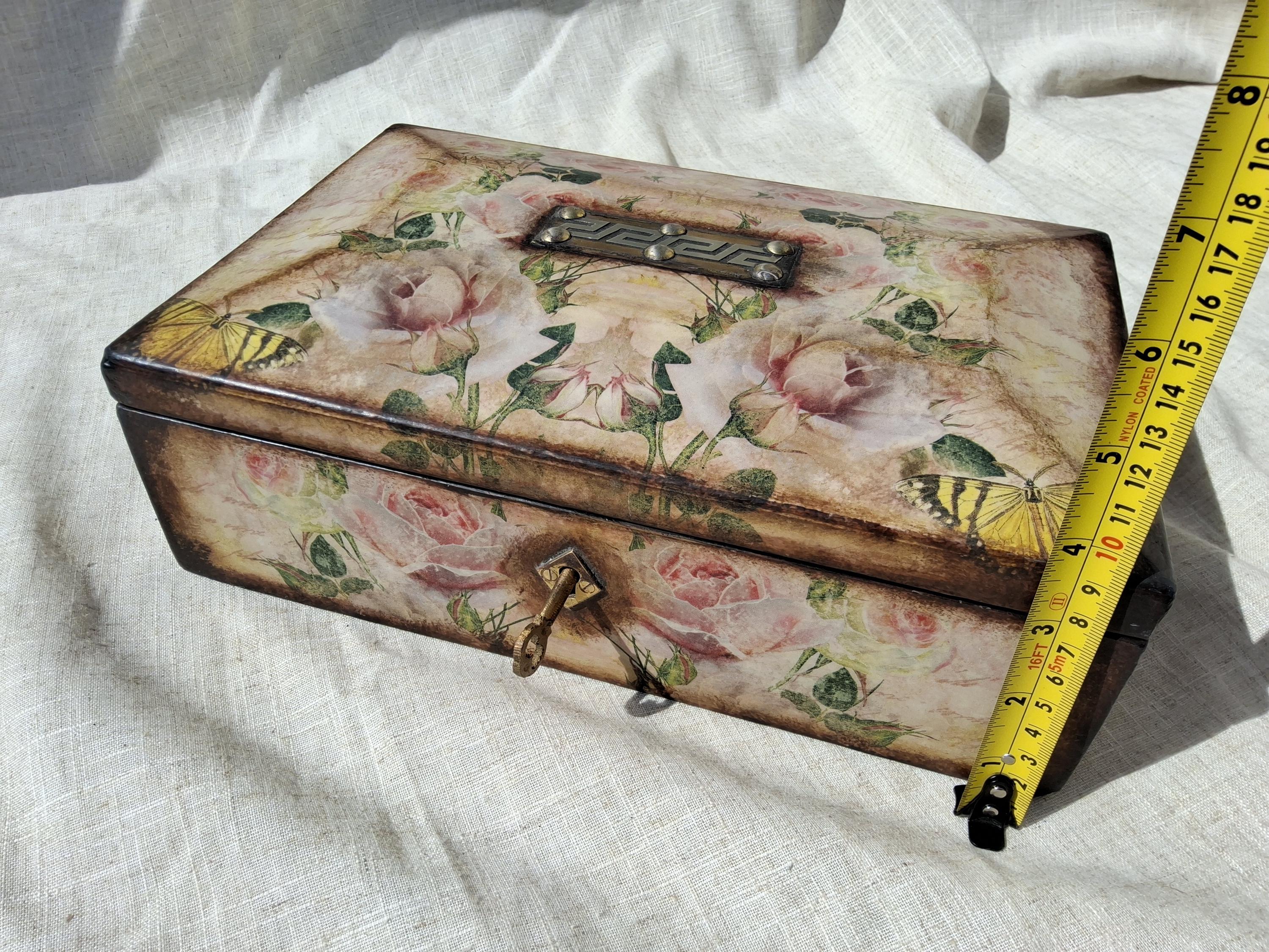 Lovely vintage theme slight rectangle domed chest vintage jewellery box decoupaged with matt finish an aged effect.