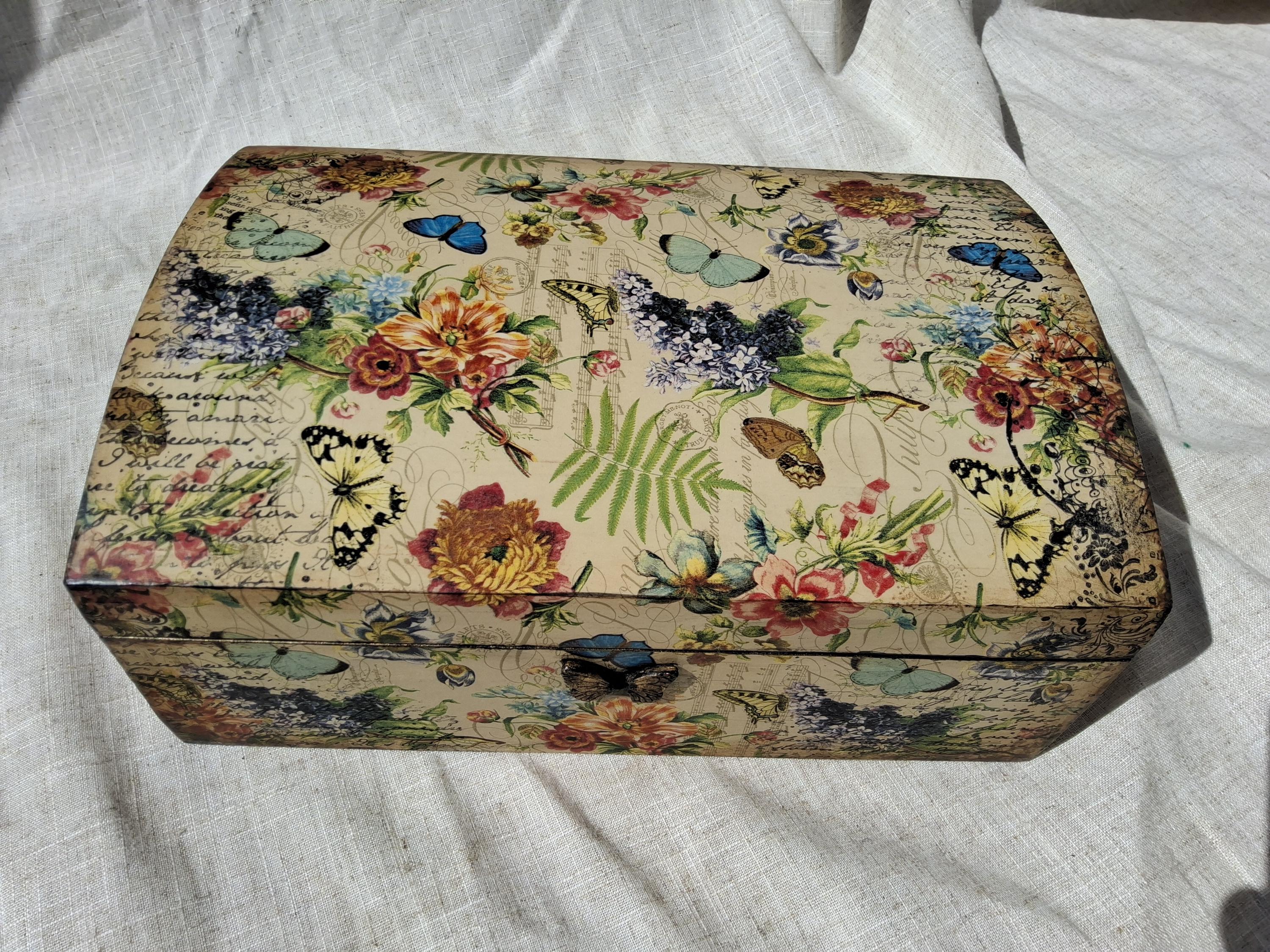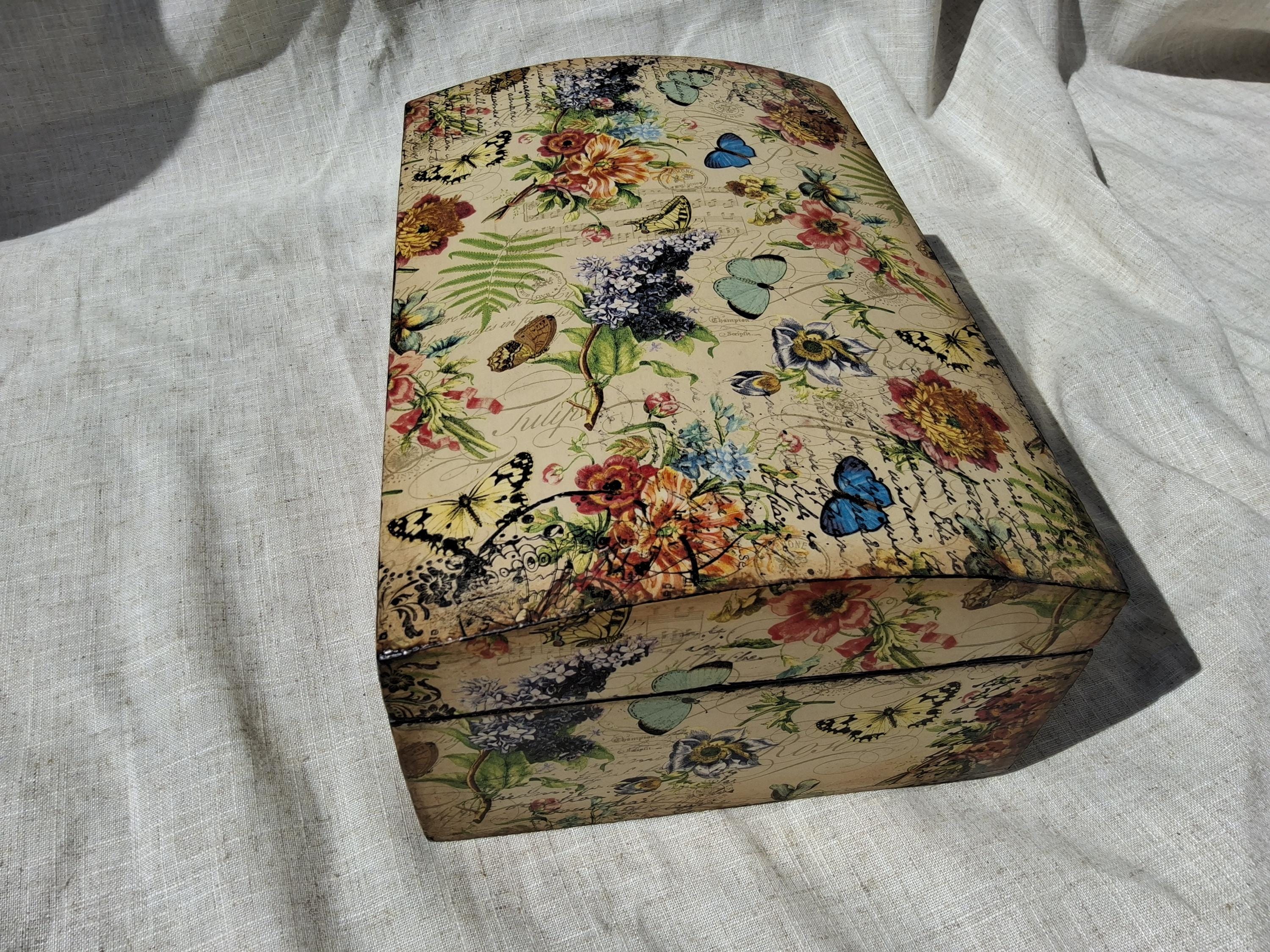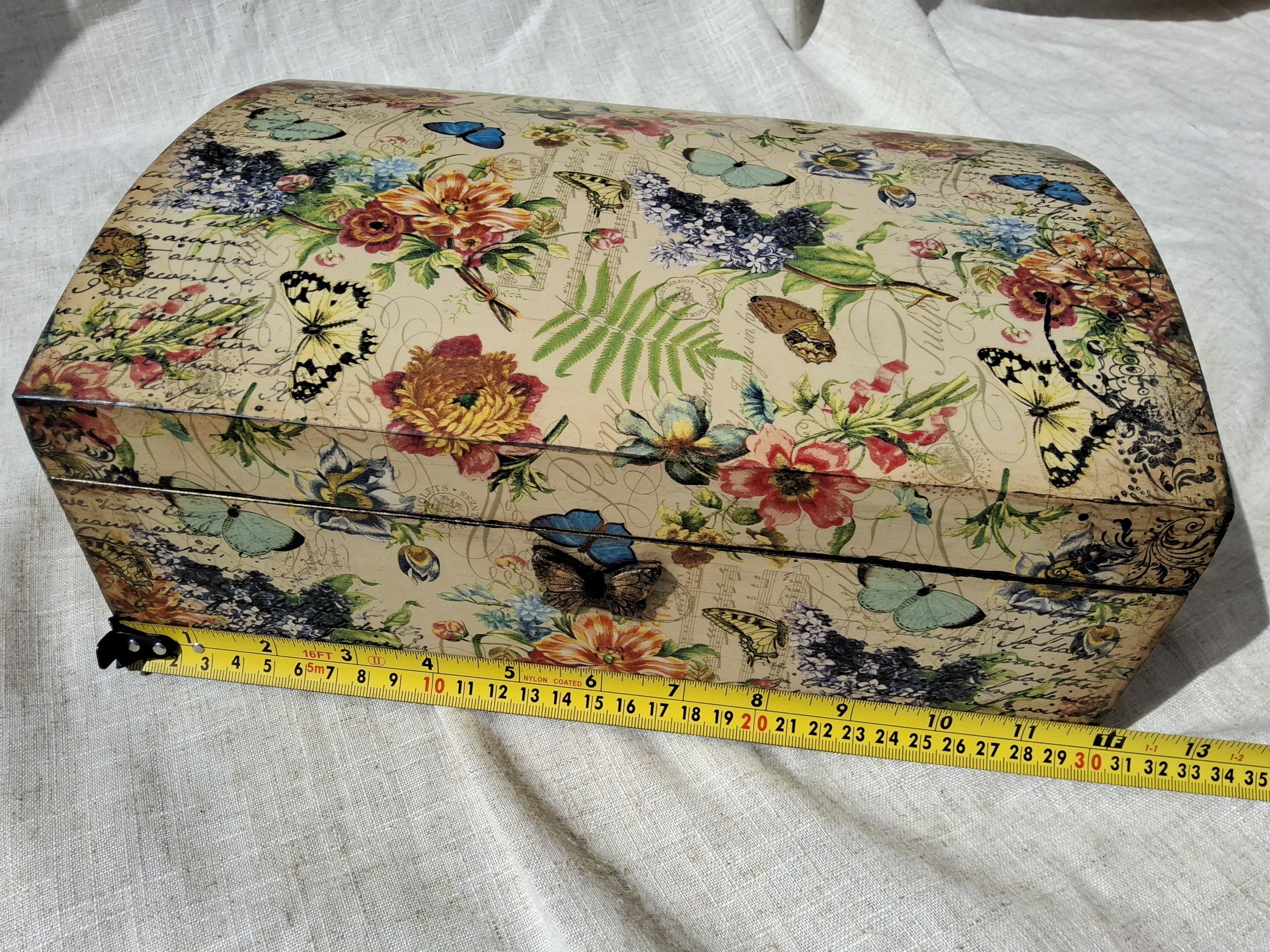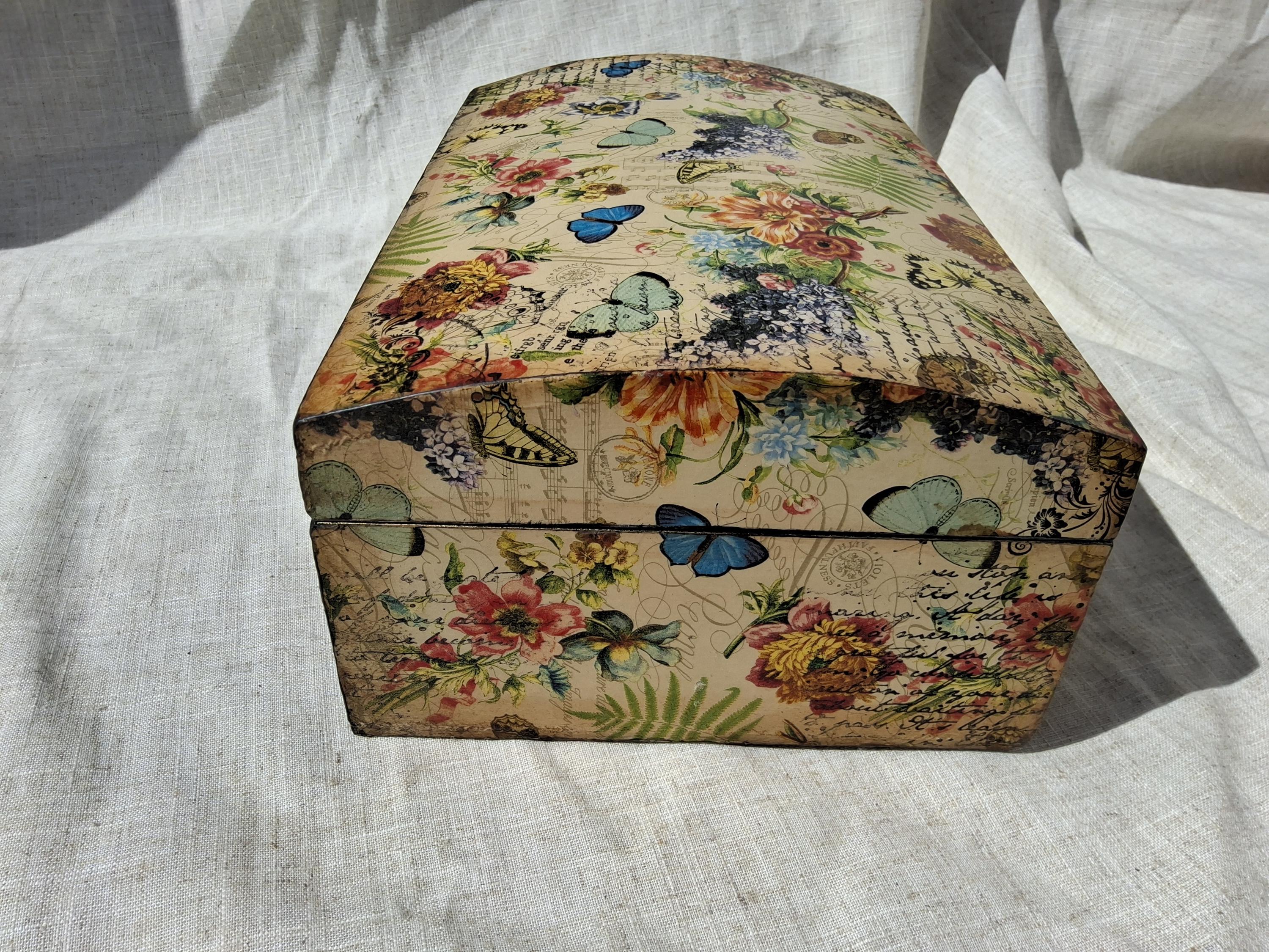 Lovely vintage butterfly theme domed chest vintage jewellery box decoupaged with matt finish an aged effect.