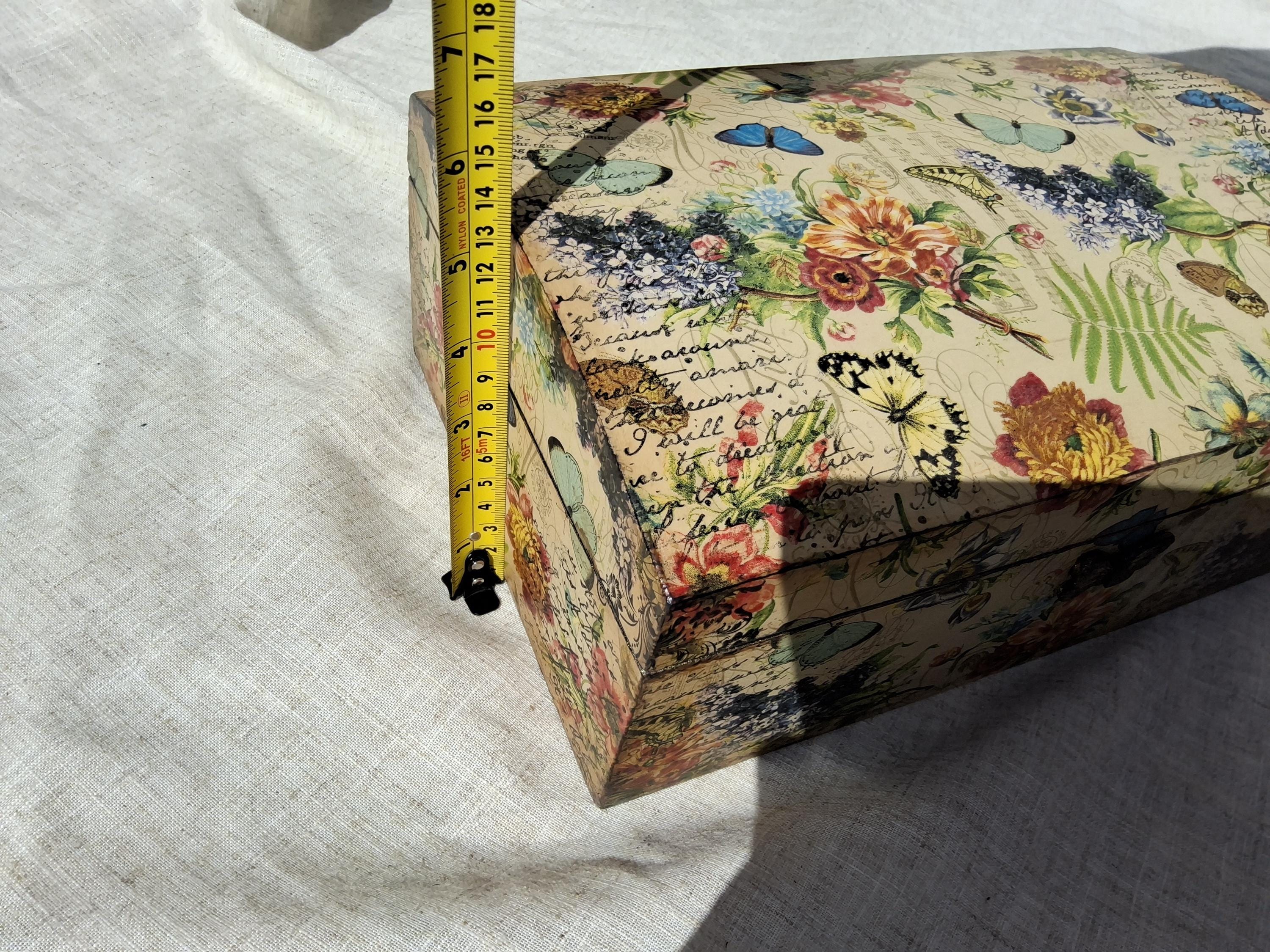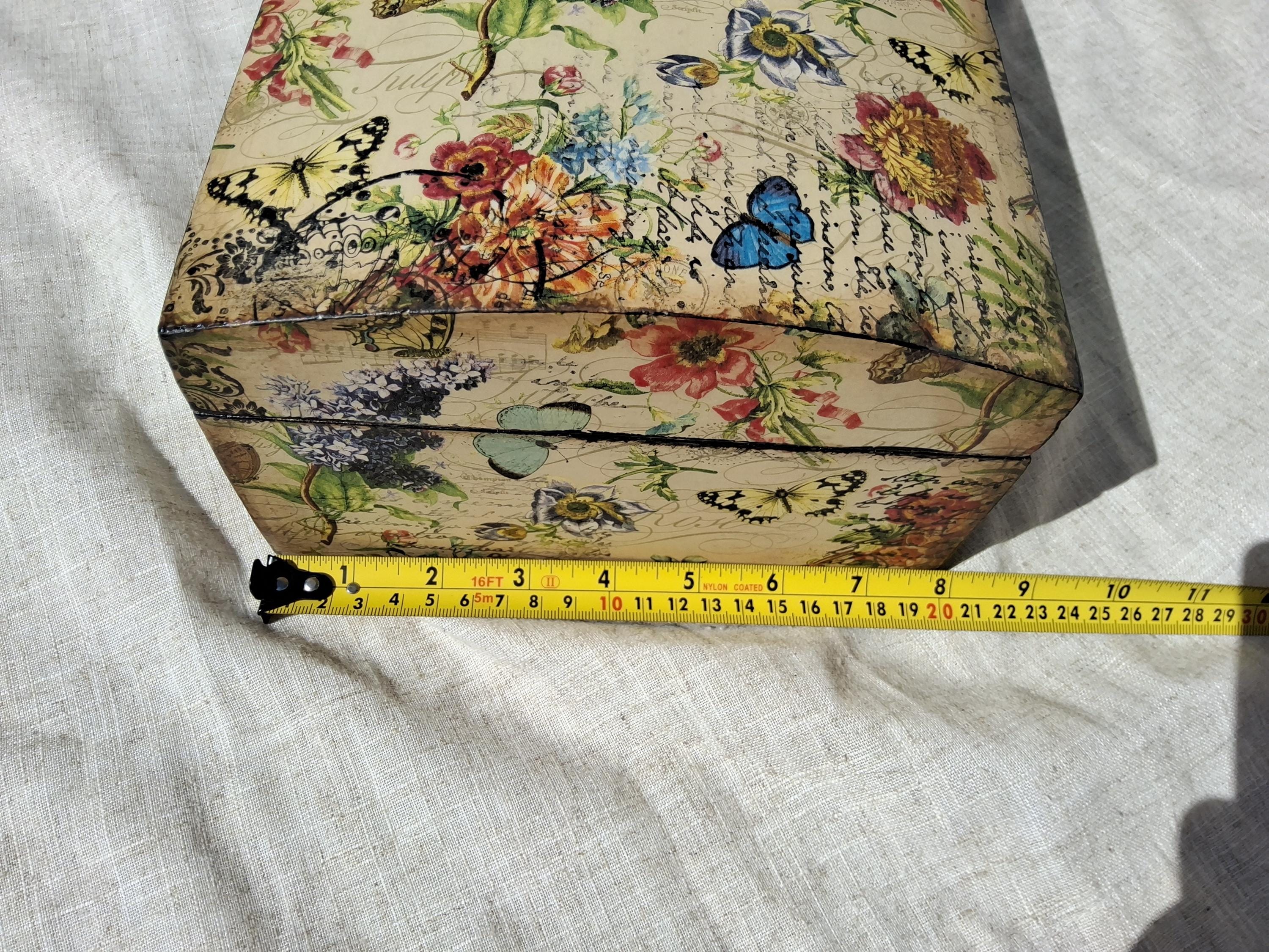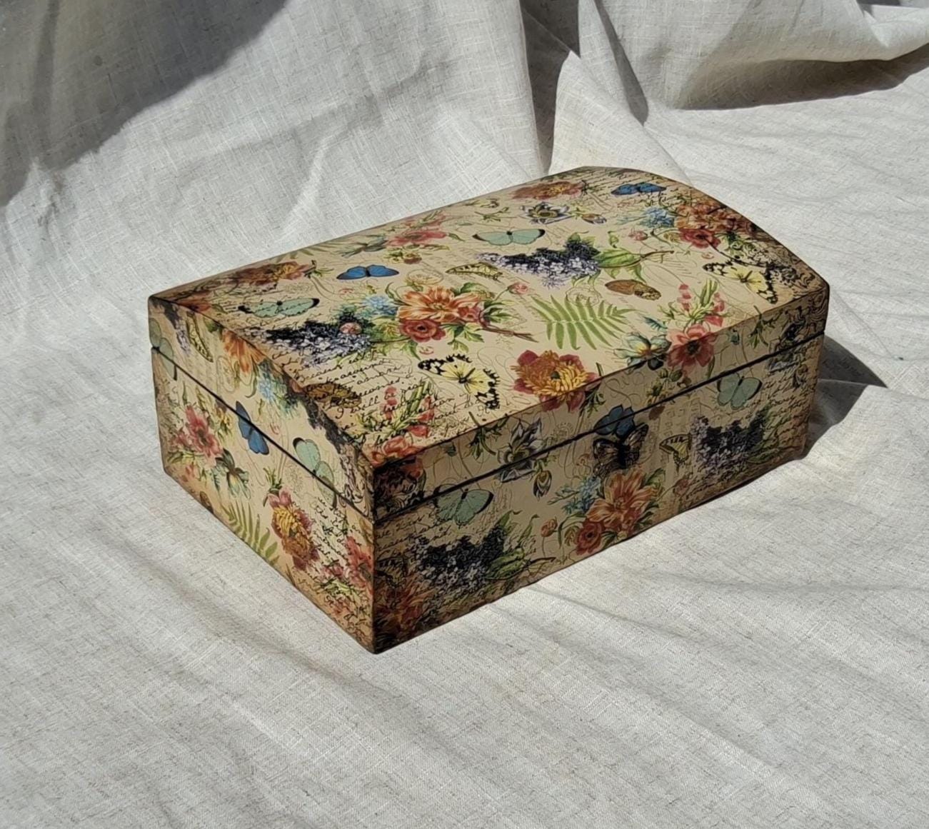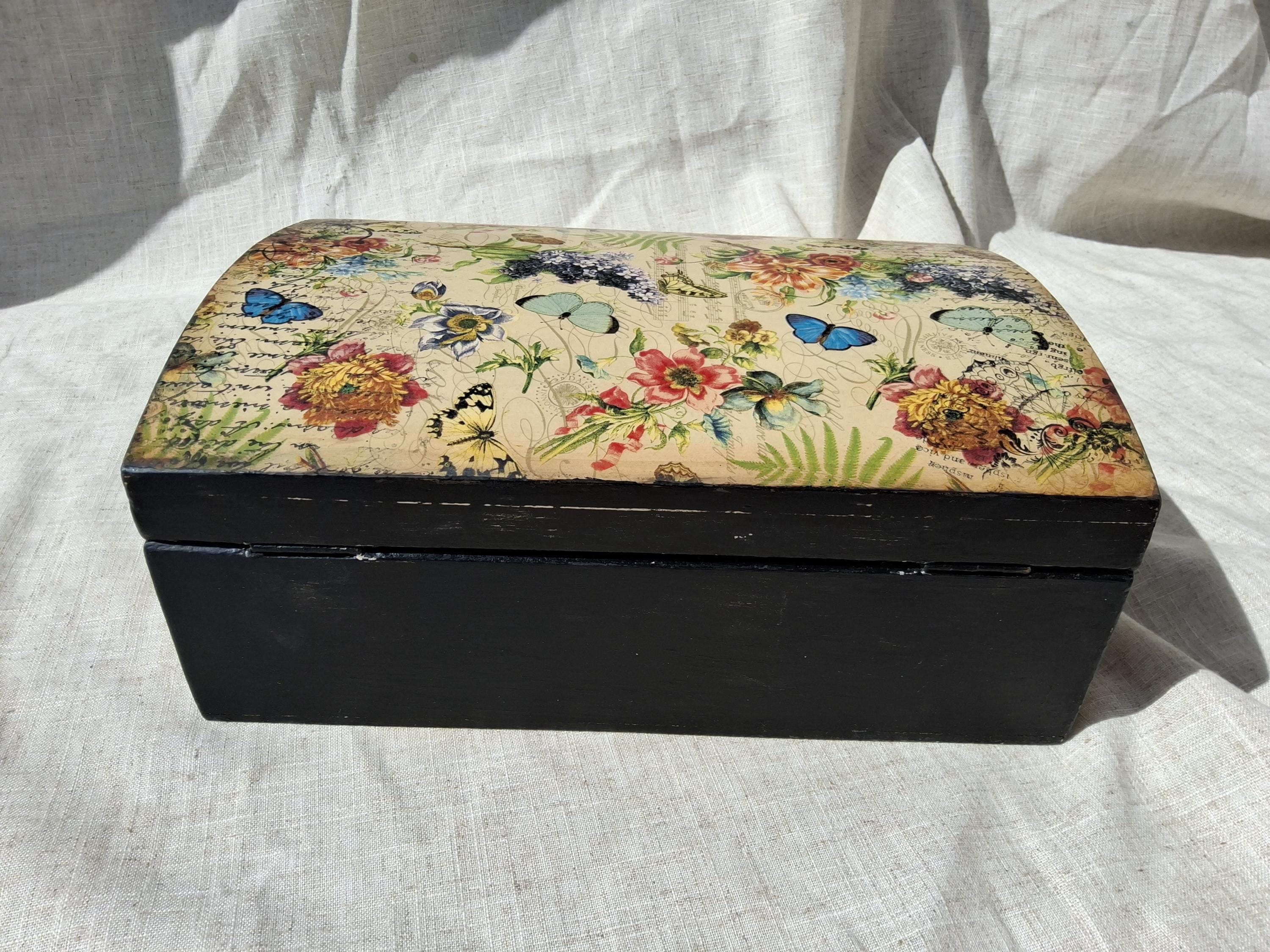 Lovely vintage butterfly theme domed chest vintage jewellery box decoupaged with matt finish an aged effect.