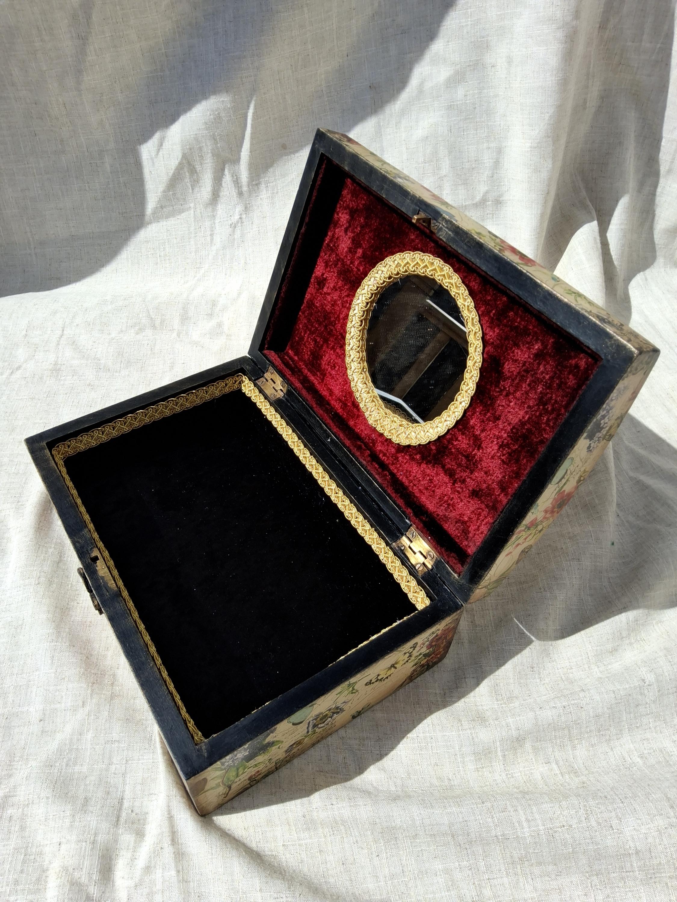 The inside lid has the original velvet and mirror and the bottom relined with velvet, finished with silk twist cord trim.
