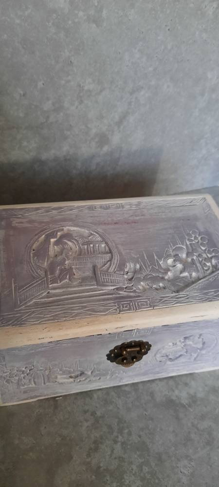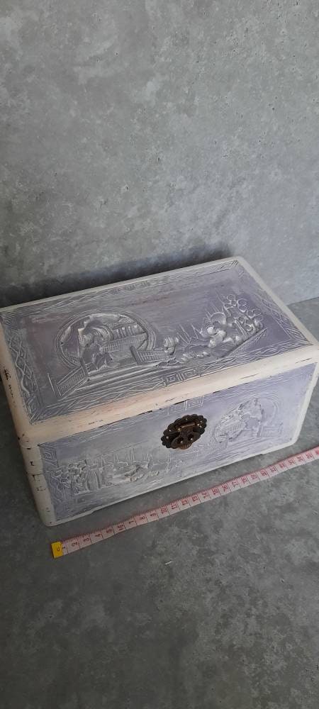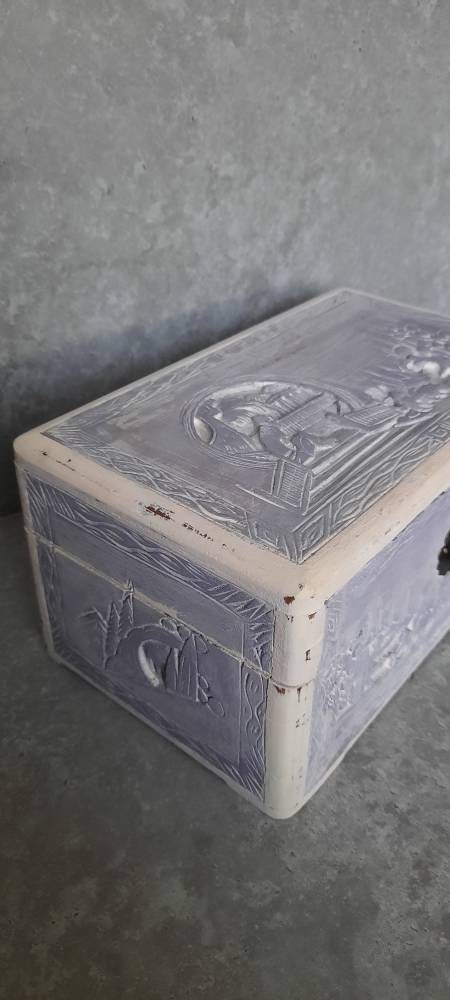 This a gorgeous hand carved chest.Painted in lavender purple and white with a rustic distressed effect all over.(makes it look old and used)